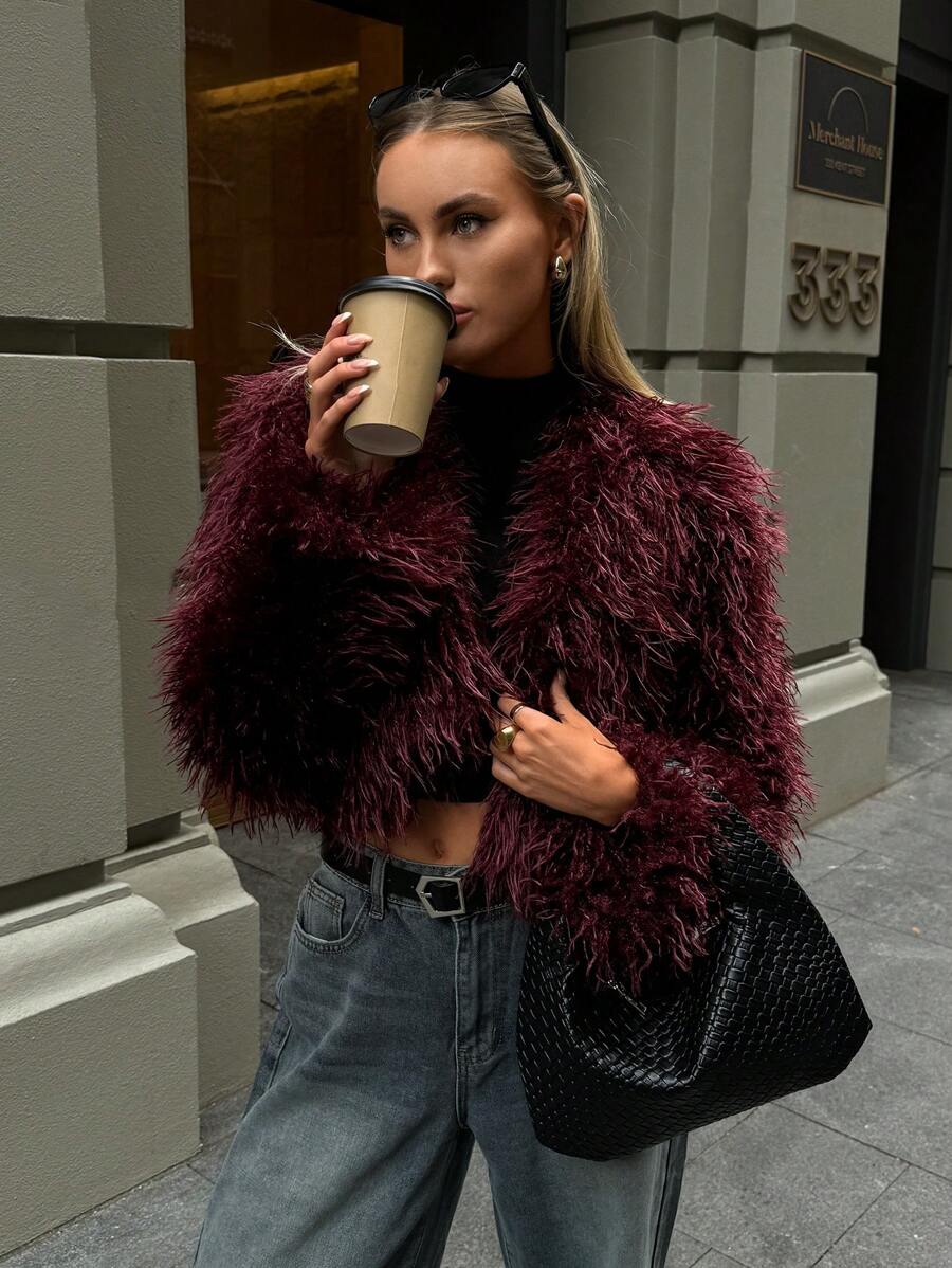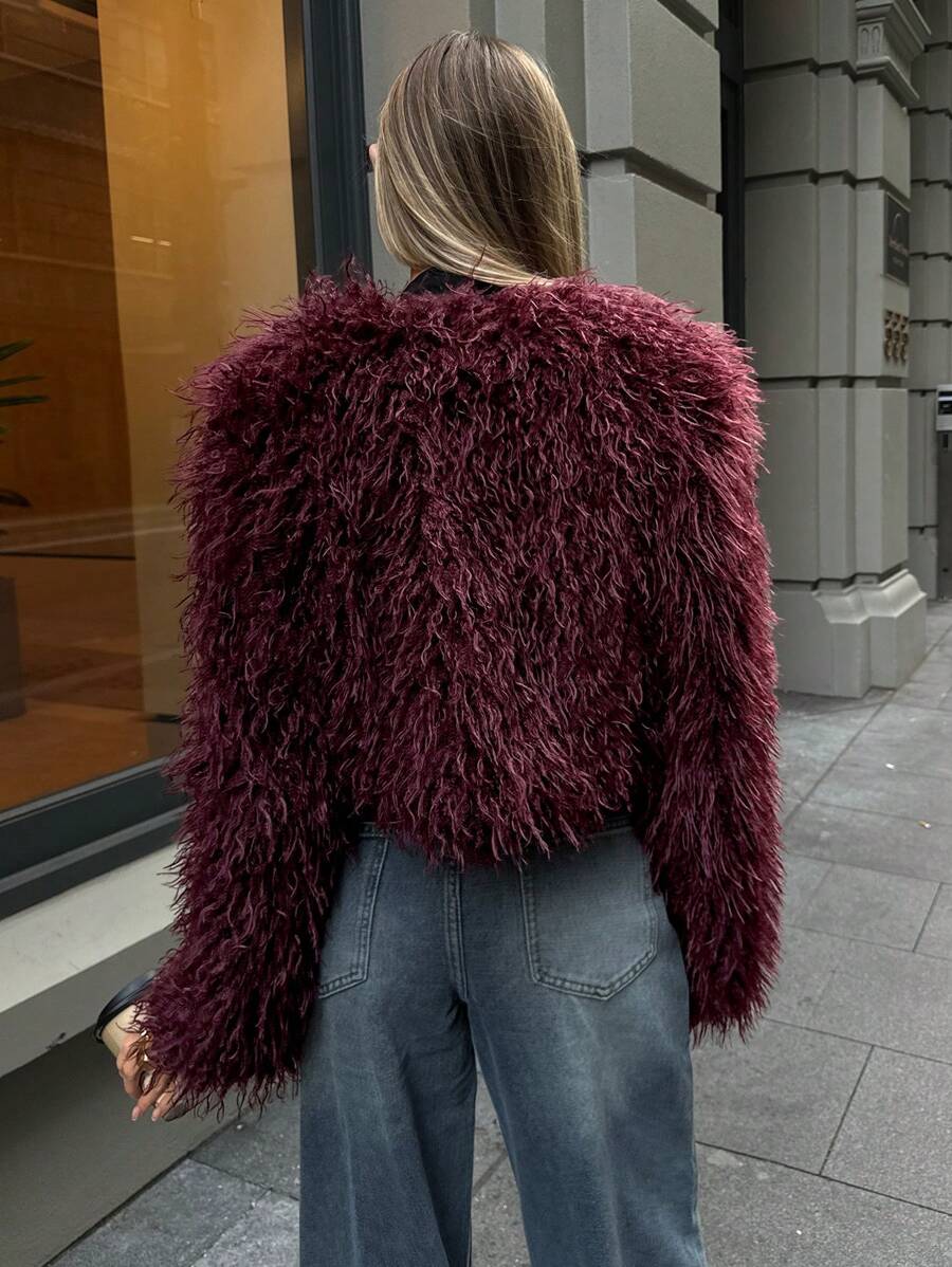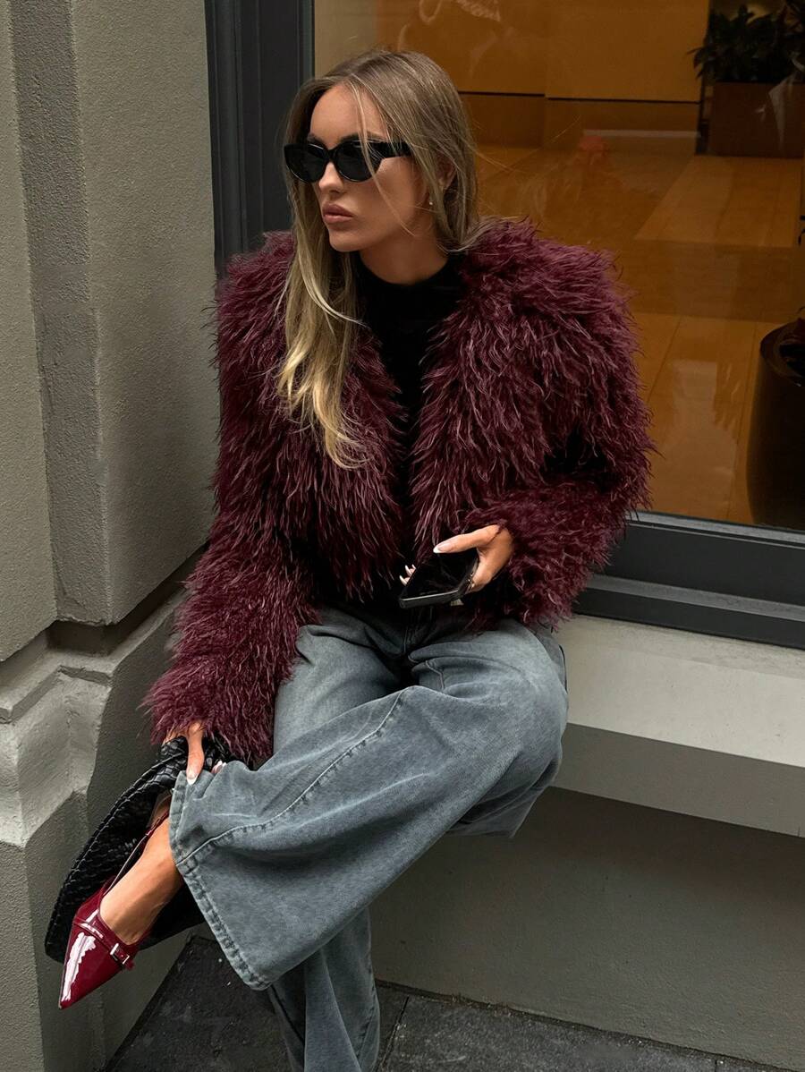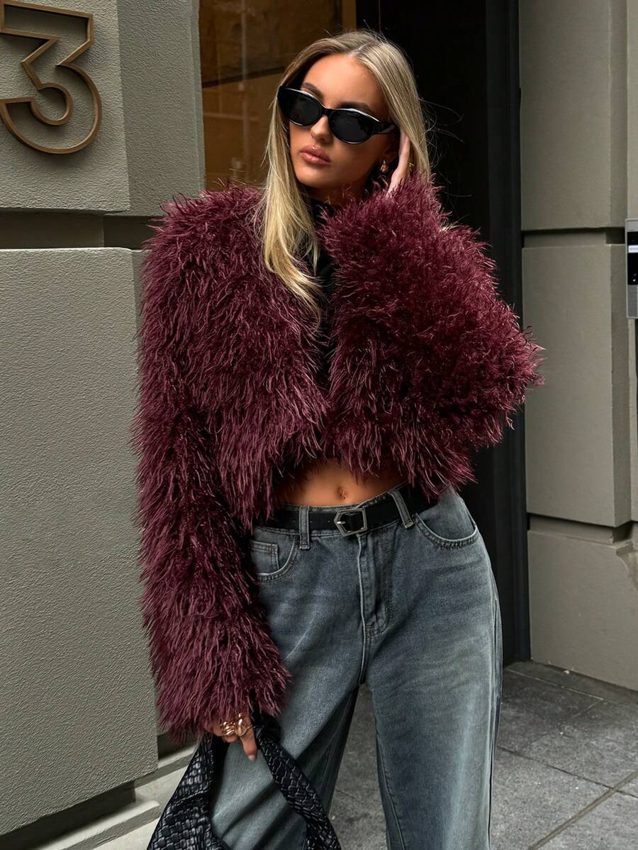 Aloruh moderna ženska kratka jakna od umjetnog krzna s dugim rukavima, dizajnirana u seksi i elegantnom stilu, idealna za jesen i zimu