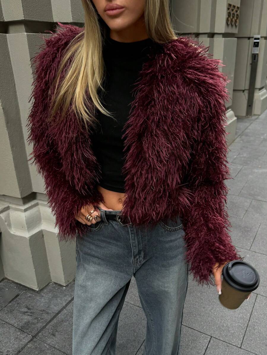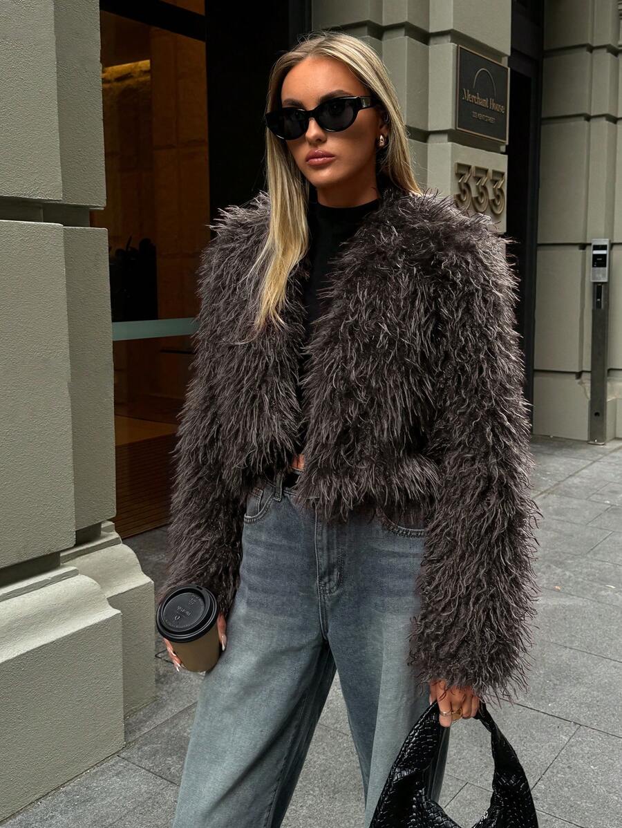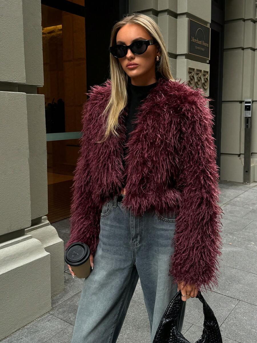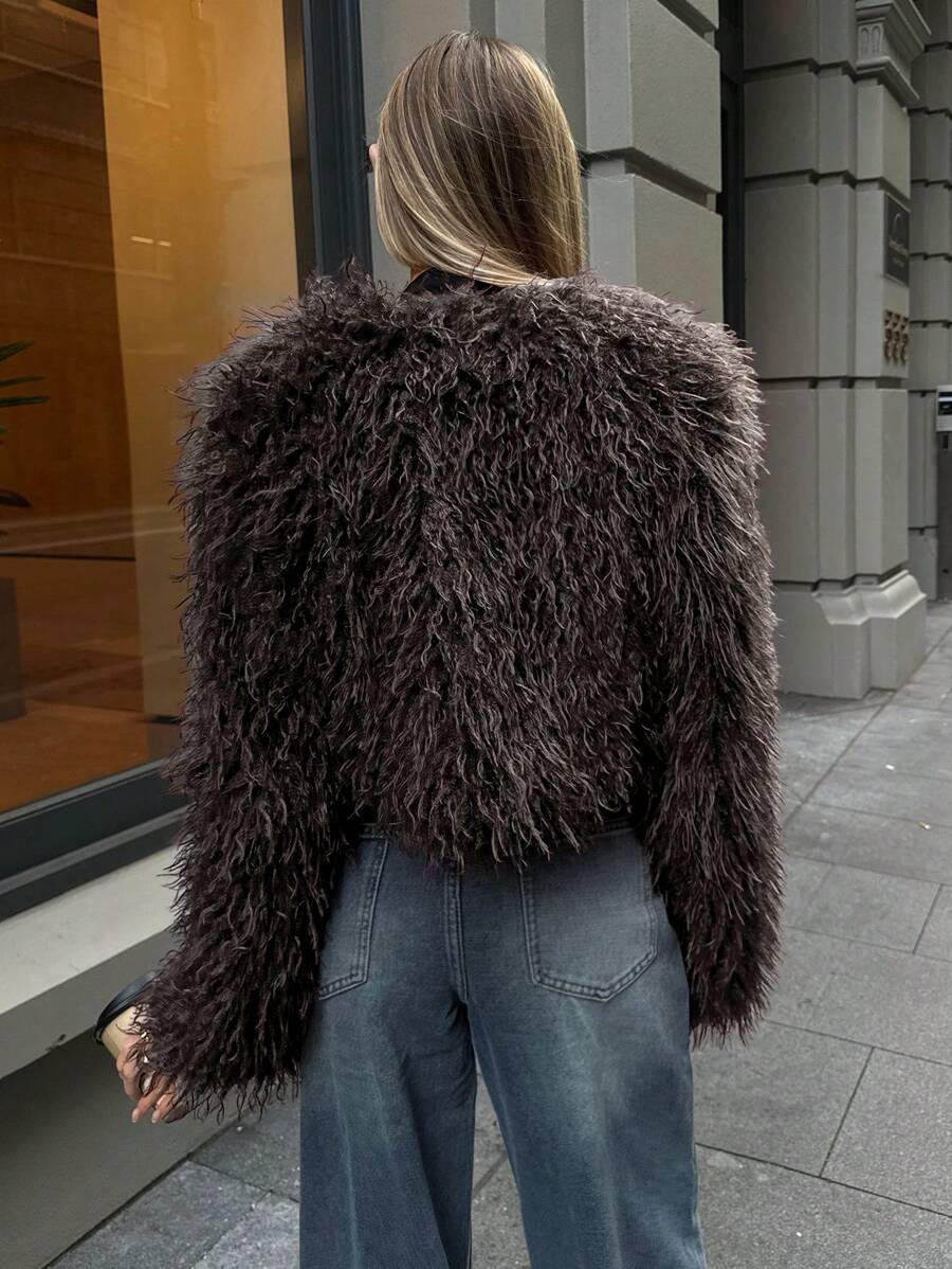 Aloruh moderna ženska kratka jakna od umjetnog krzna s dugim rukavima, dizajnirana u seksi i elegantnom stilu, idealna za jesen i zimu