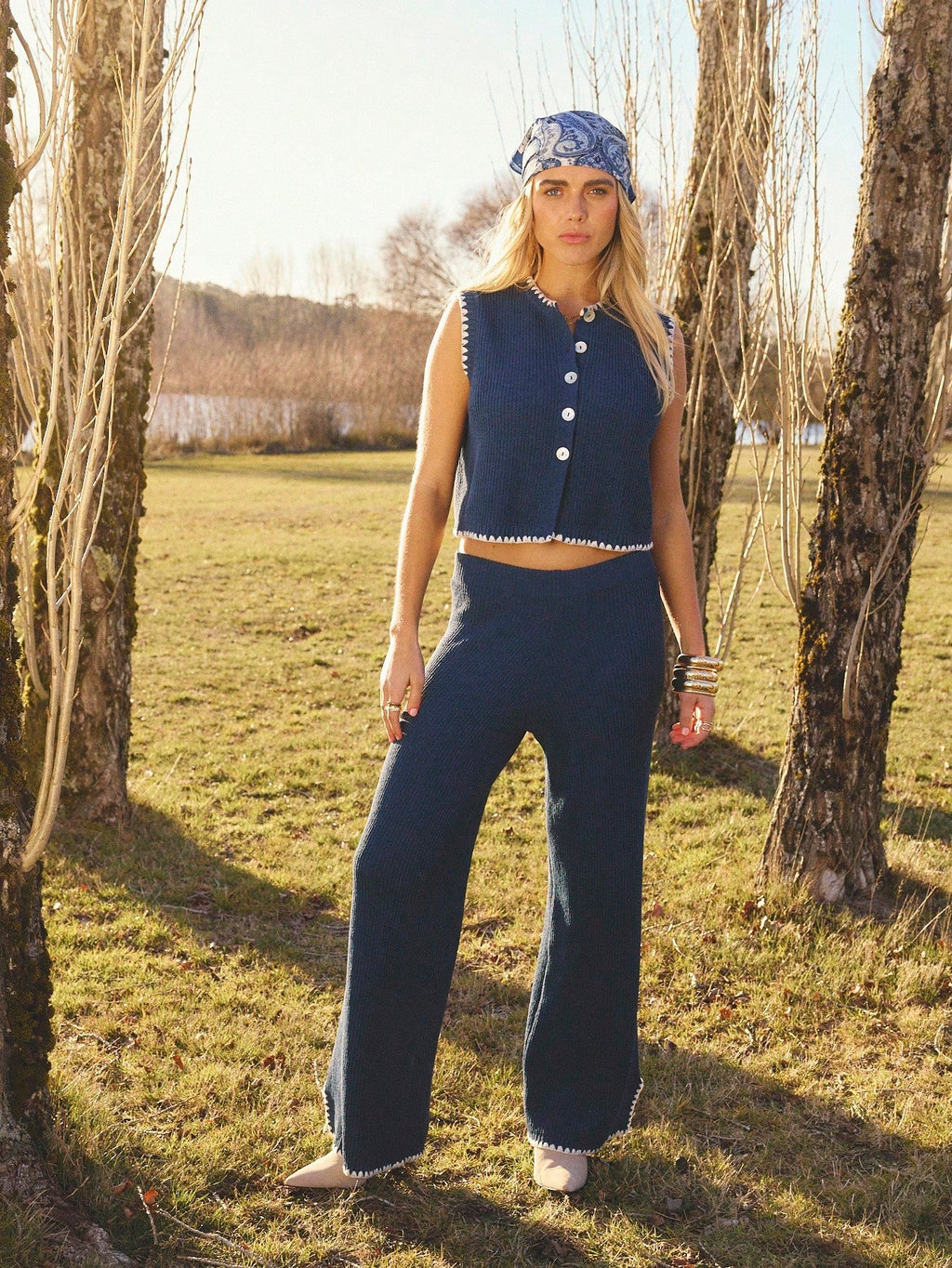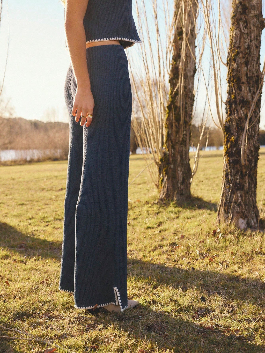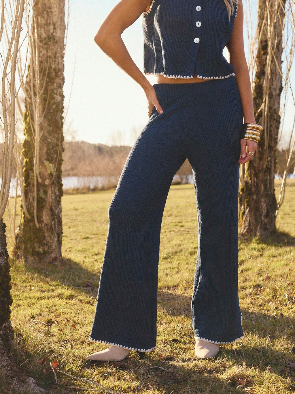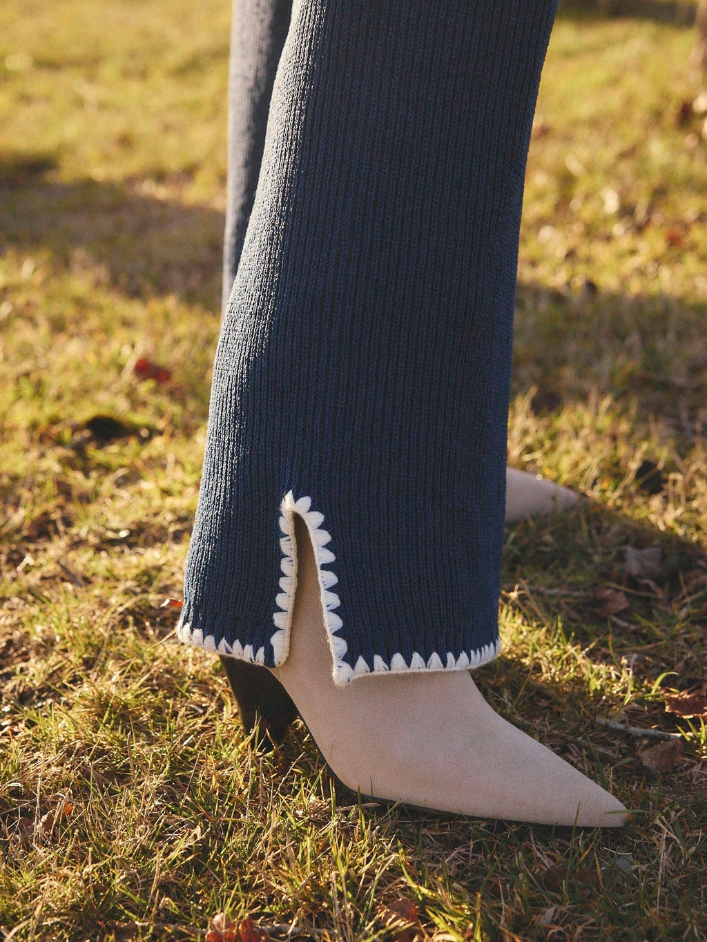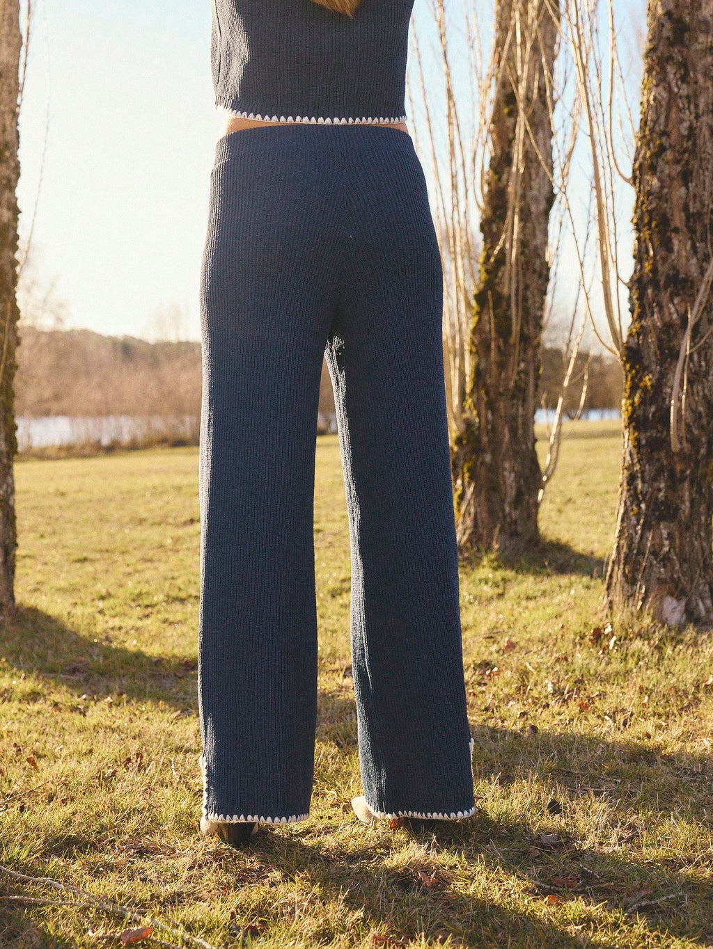 Aralina jesenje/zimske pletene pantalone u skandinavskom (Stockholm) stilu, ravnog kroja s rebrastom teksturom i dekorativnim obrubom u stilu ručnog šava (blanket stitch). Udobne, moderne i idealne za ležerne, ali elegantne svakodnevne kombinacije.