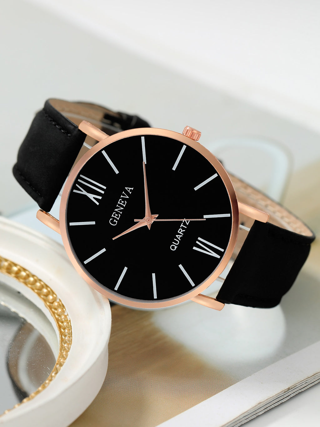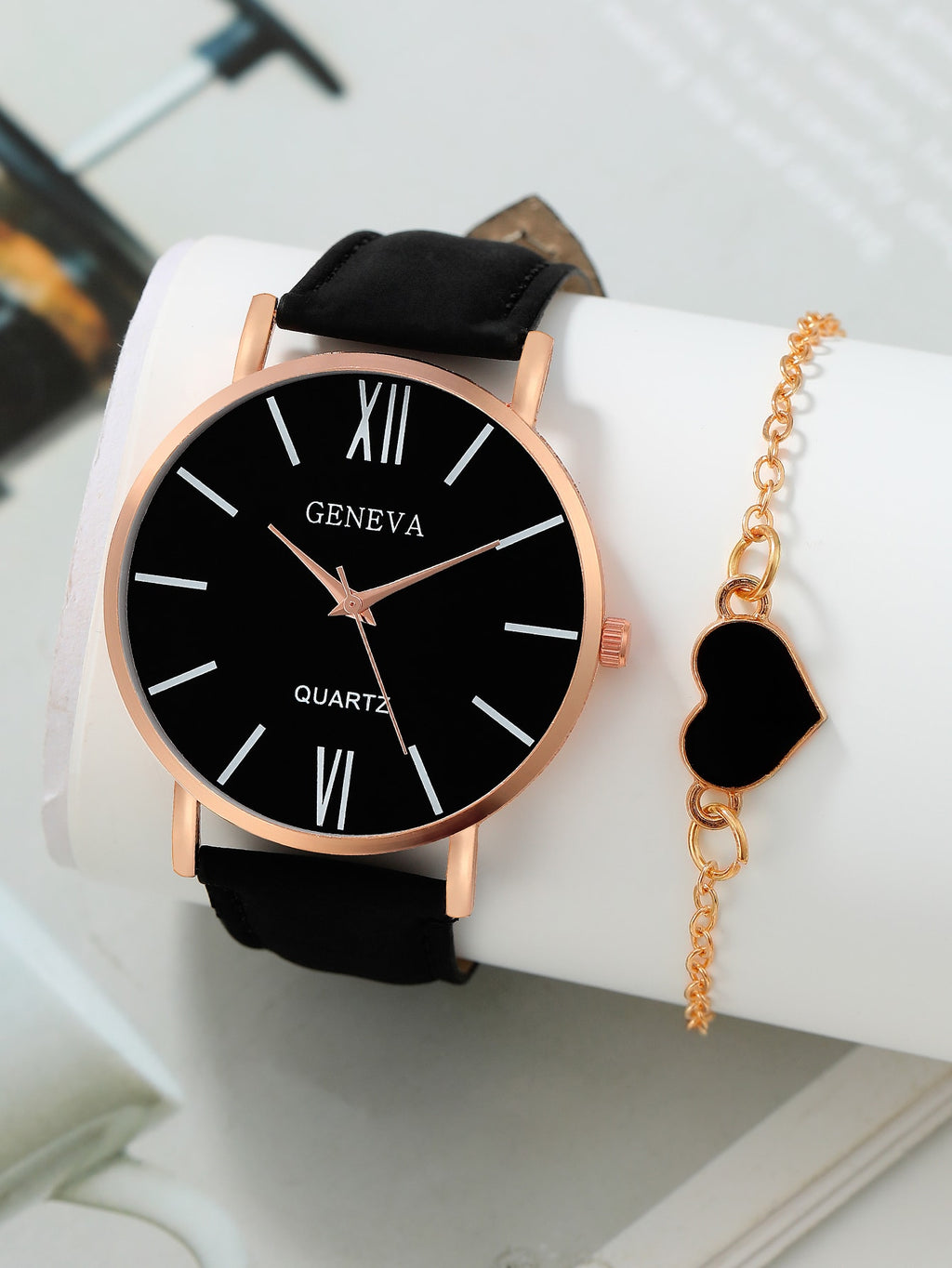 BELLAVOG 1pc Women Simple Casual Quartz Leather Watch And 1pc Heart Decor Bracelet (No Box)