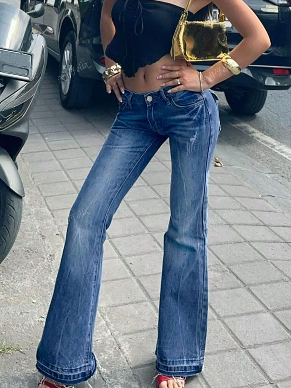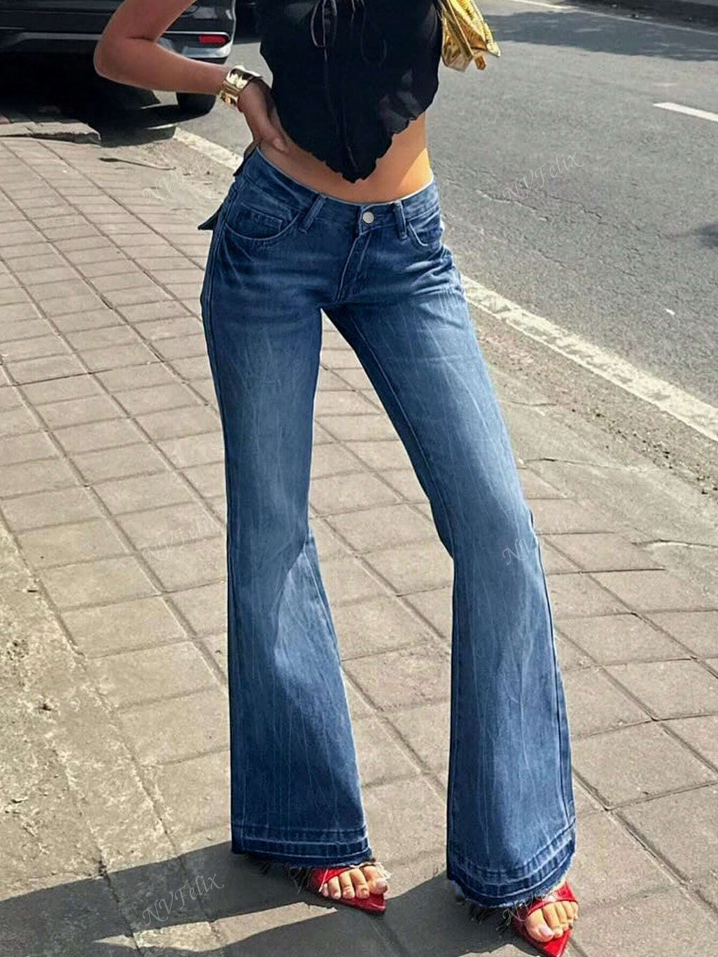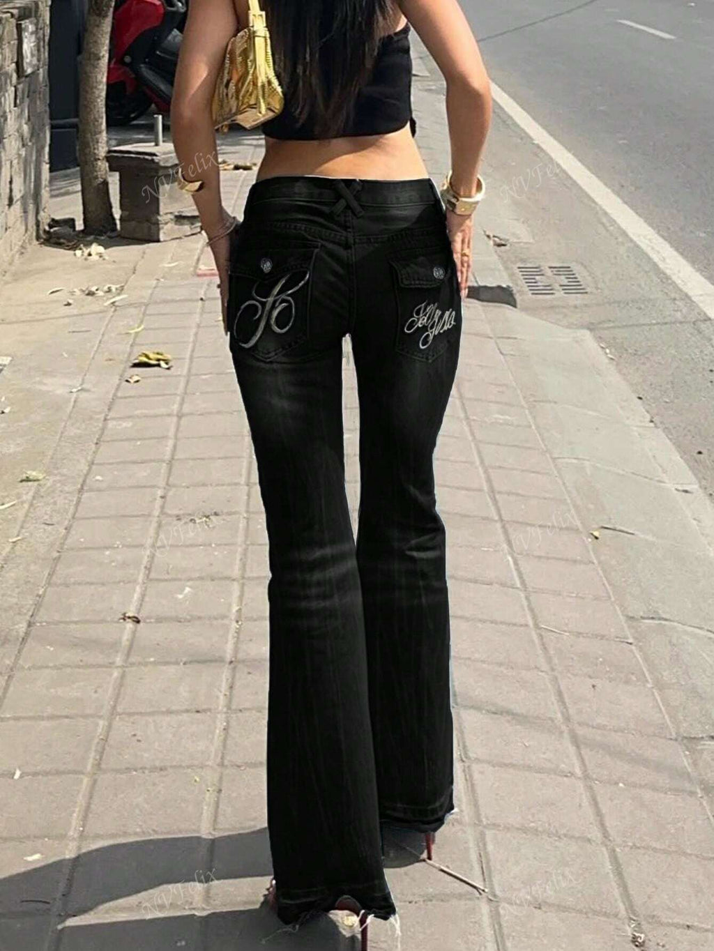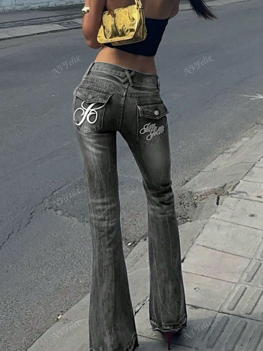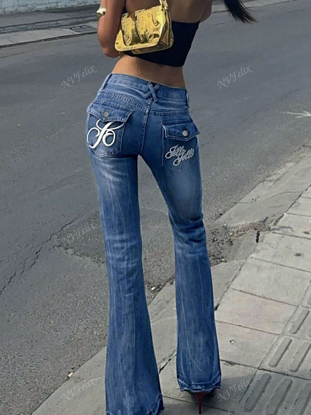 BELLAVOG 2025 New Women's Summer Y2K Fashion Streetwear Casual Versatile Embroidered Pocket Long Stretch Flared Jeans