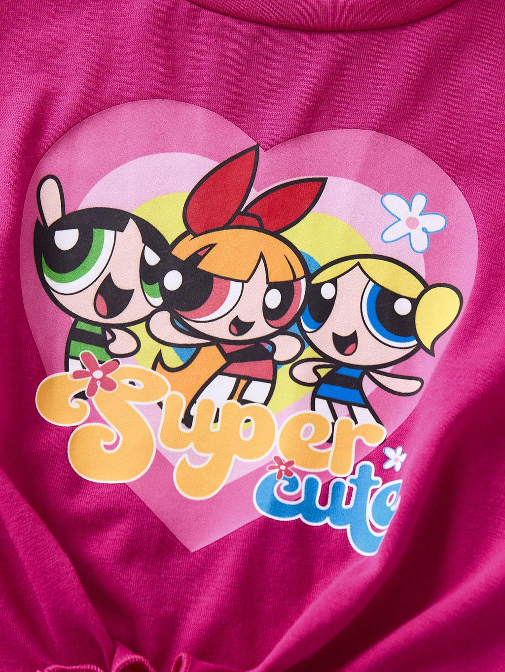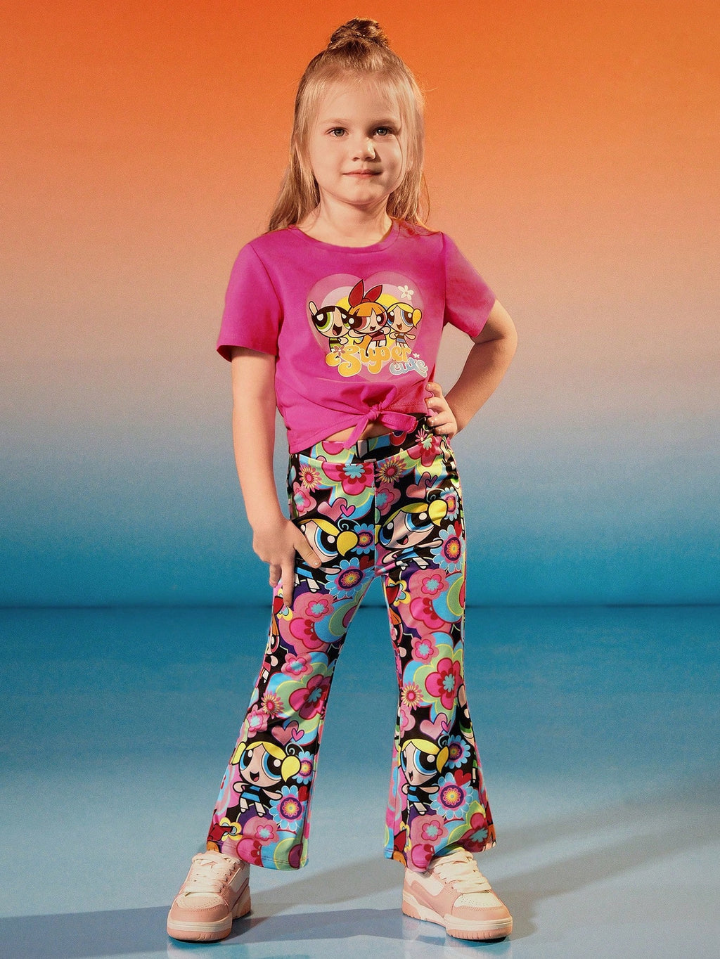 BELLAVOG 2pcs Young Girl Cartoon Print Knot Hem Short Sleeve T-Shirt And Flare Leg Pants Outfit