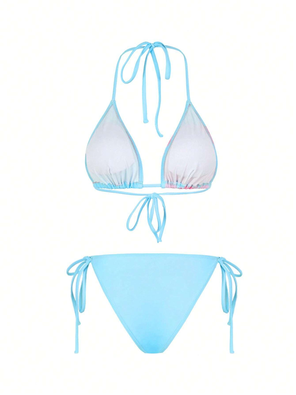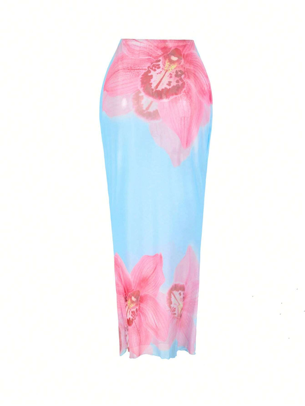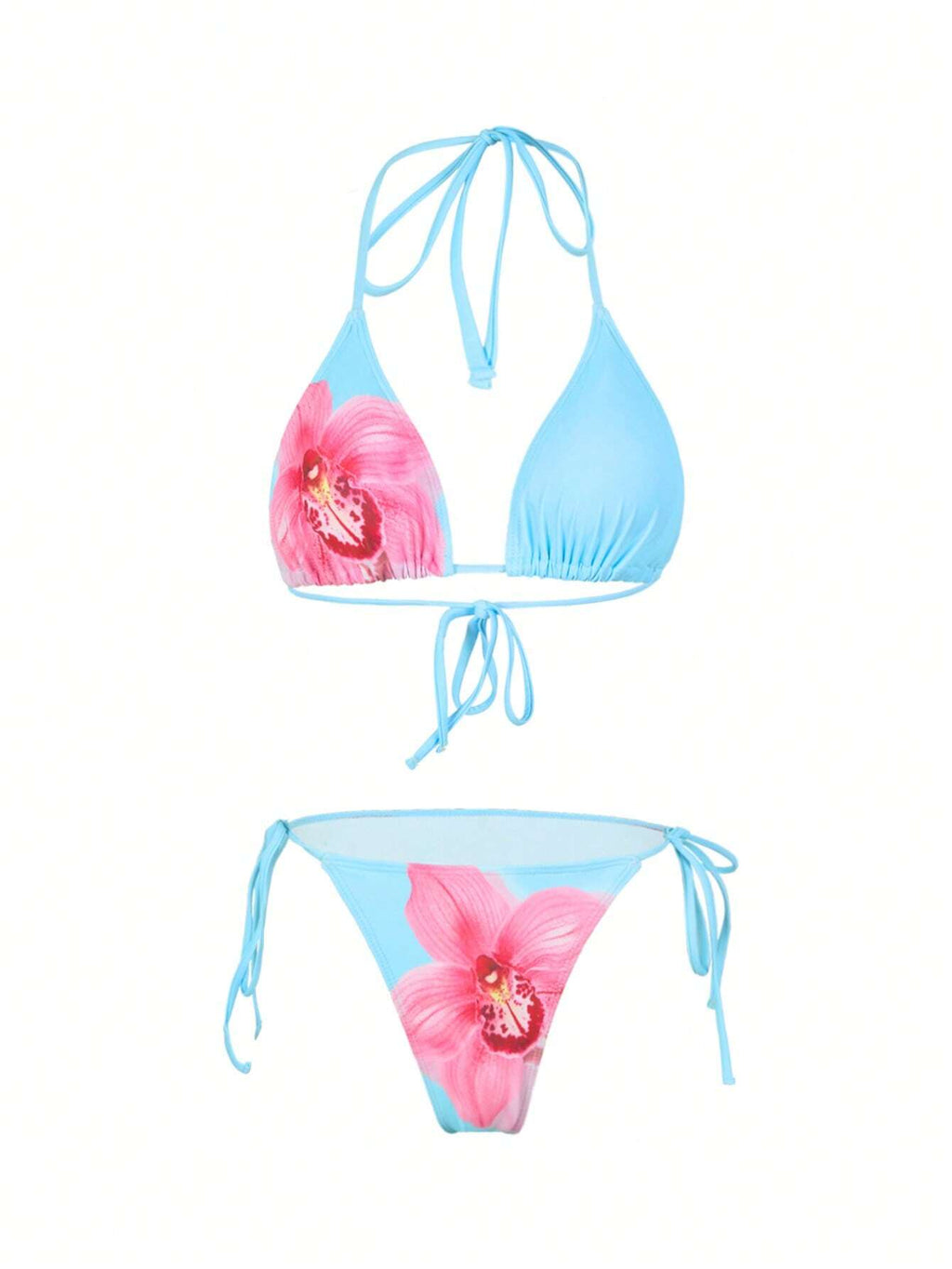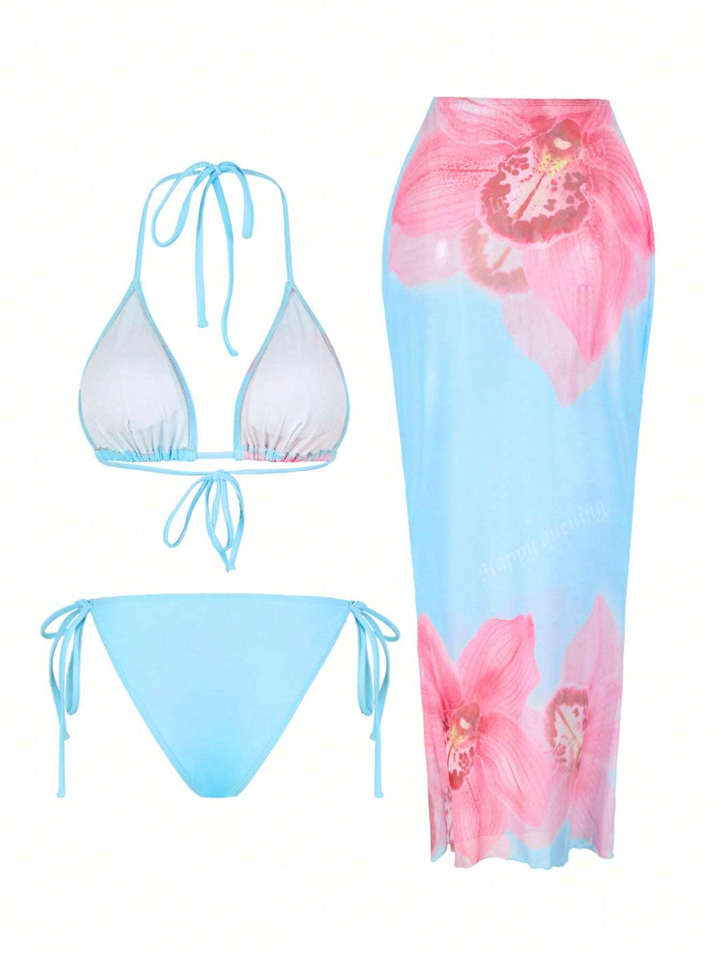 BELLAVOG 3pcs/Set Floral Print Sexy Women's Bikini Set With Spaghetti Strap And Skirt, Summer Beach Wear