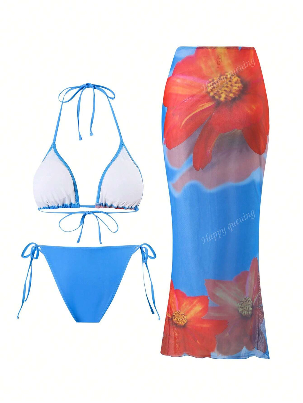 BELLAVOG 3pcs/Set Summer Floral Print Spaghetti Strap Bikini Set