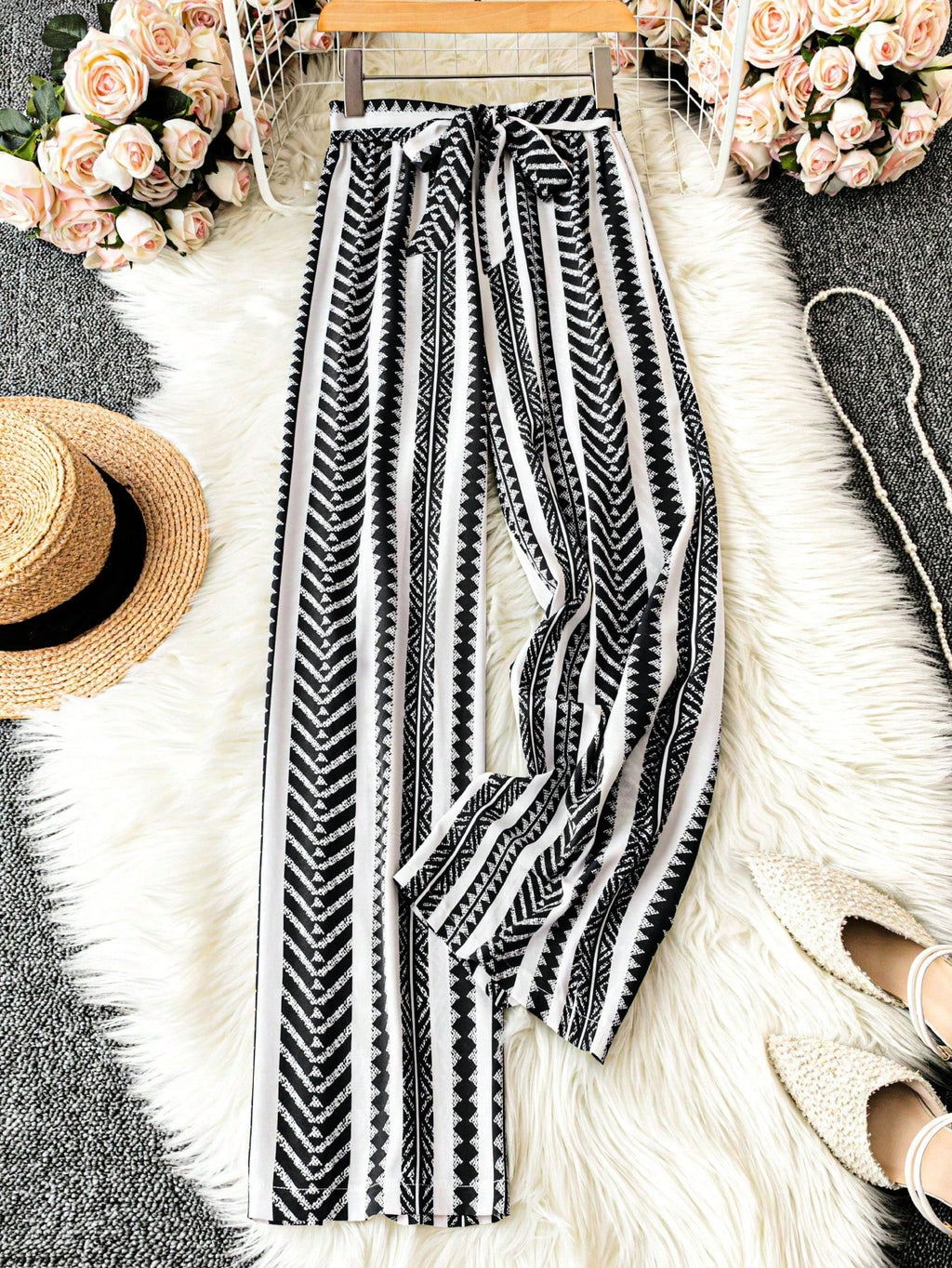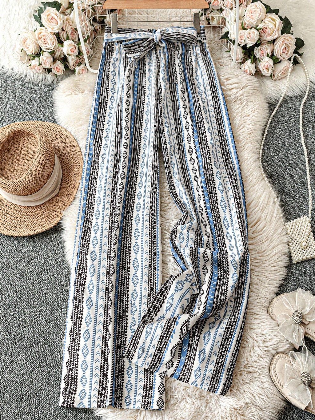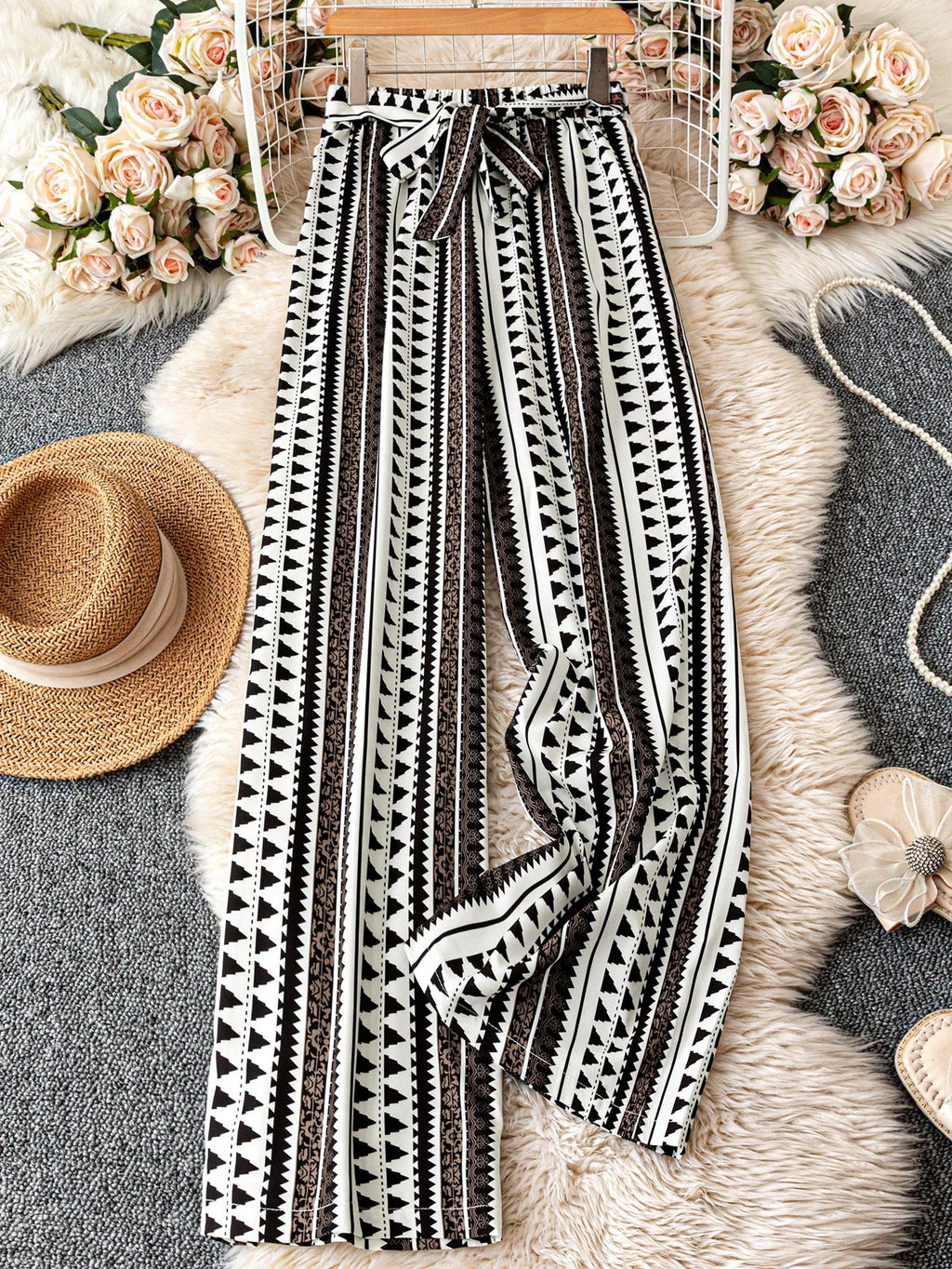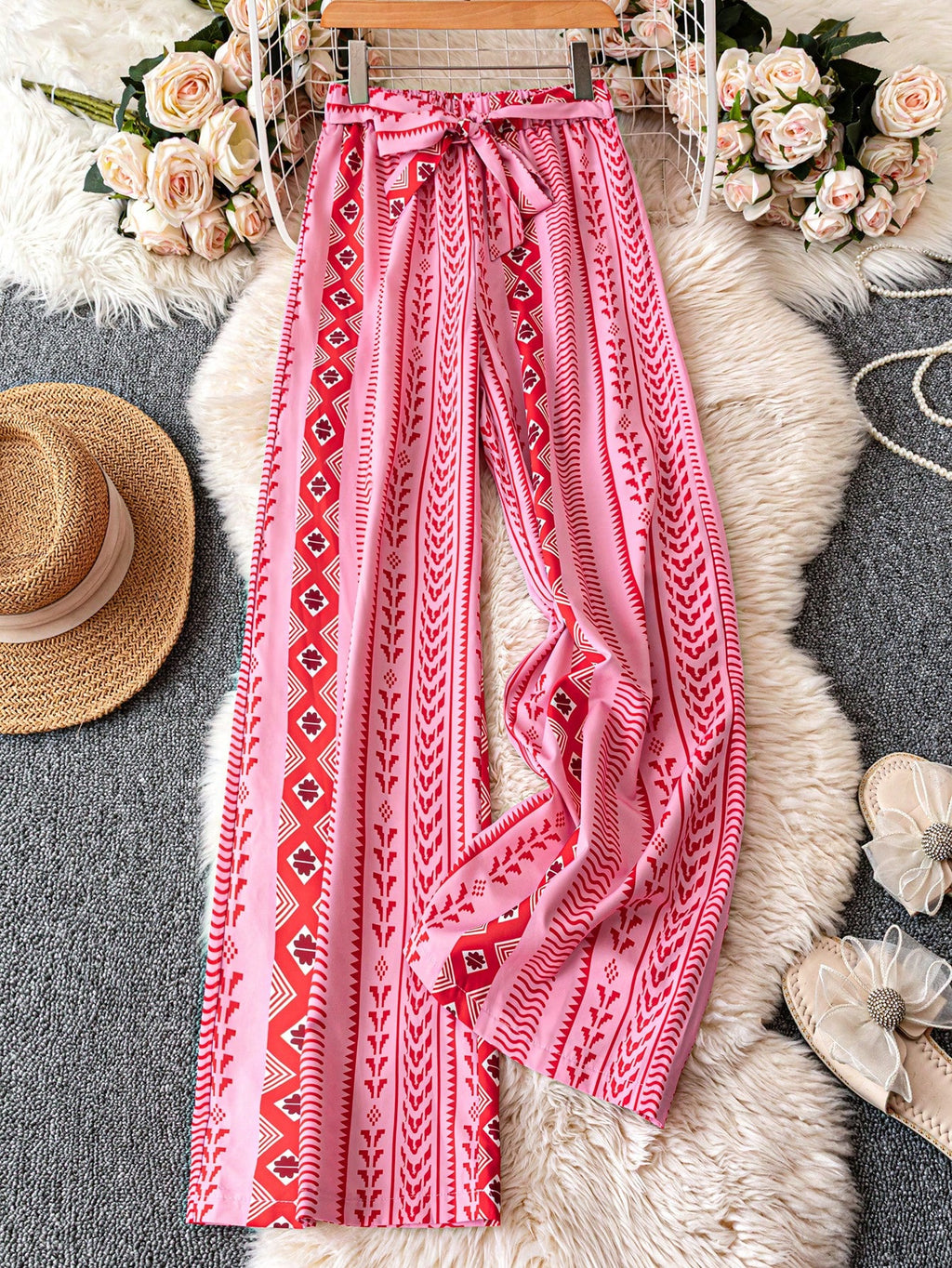 BELLAVOG Allover Print Belted Wide Leg Casual Vacation Pants