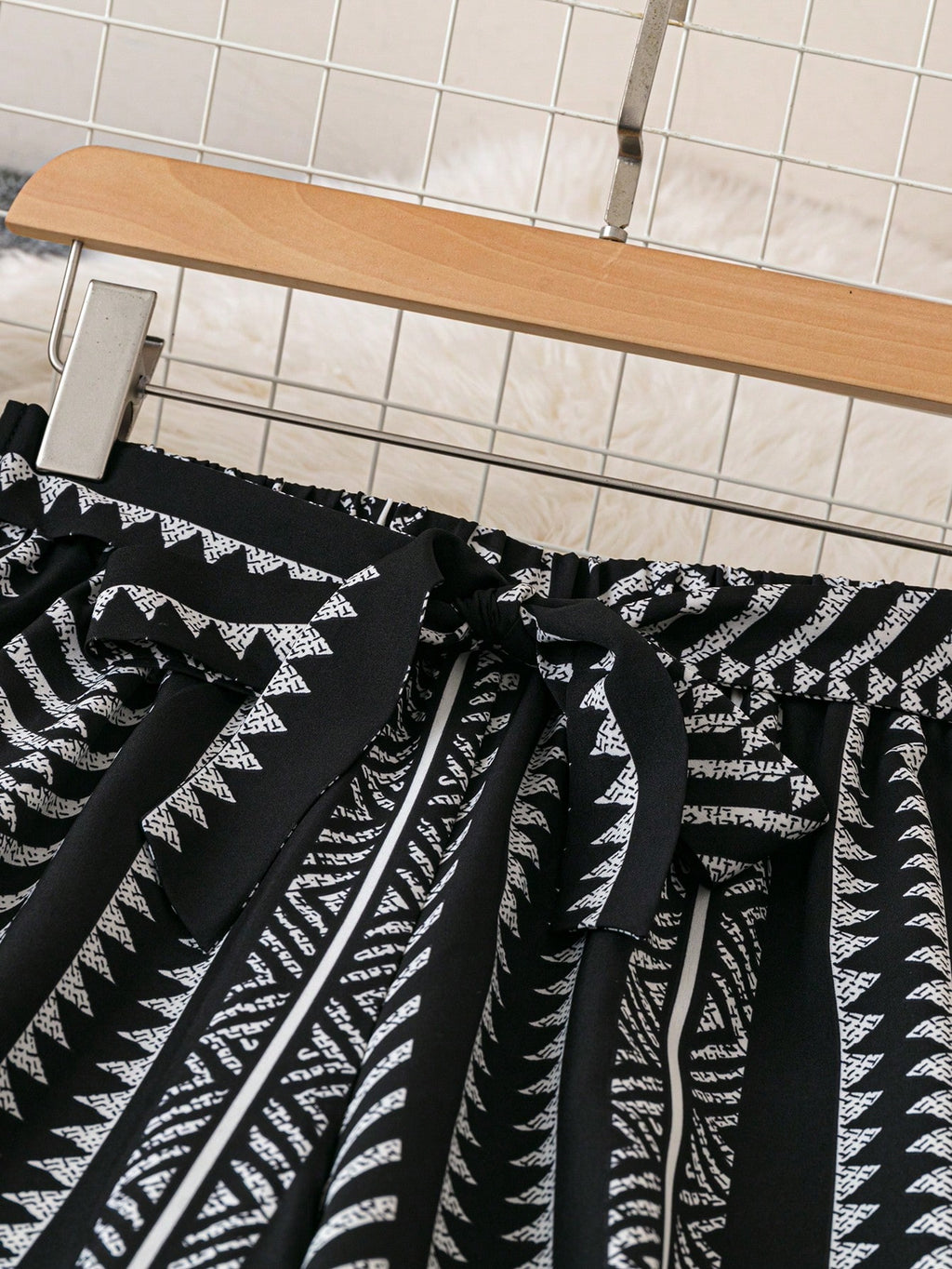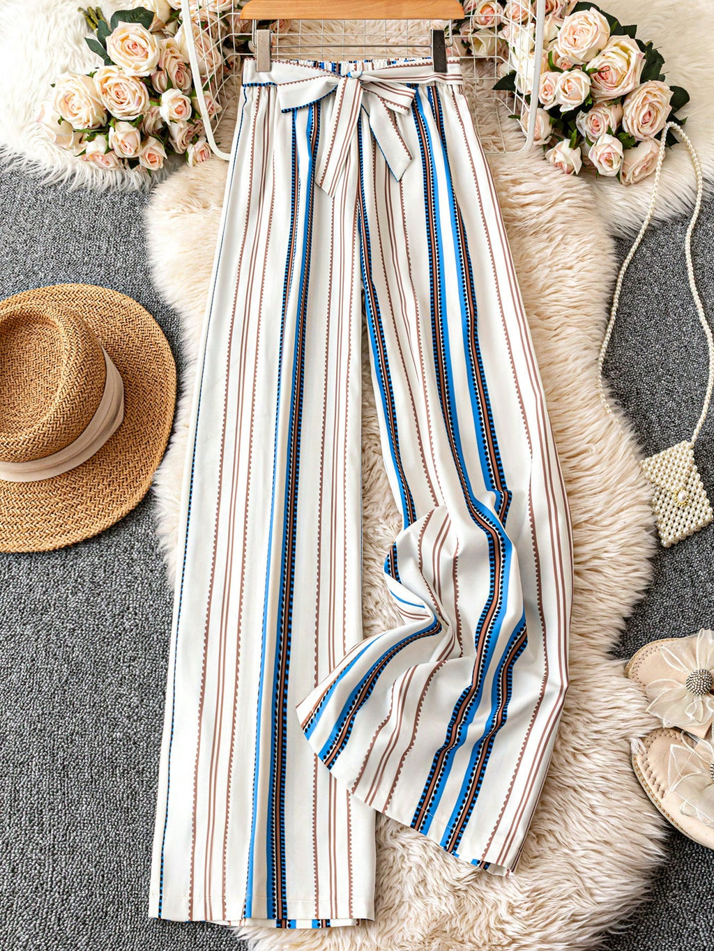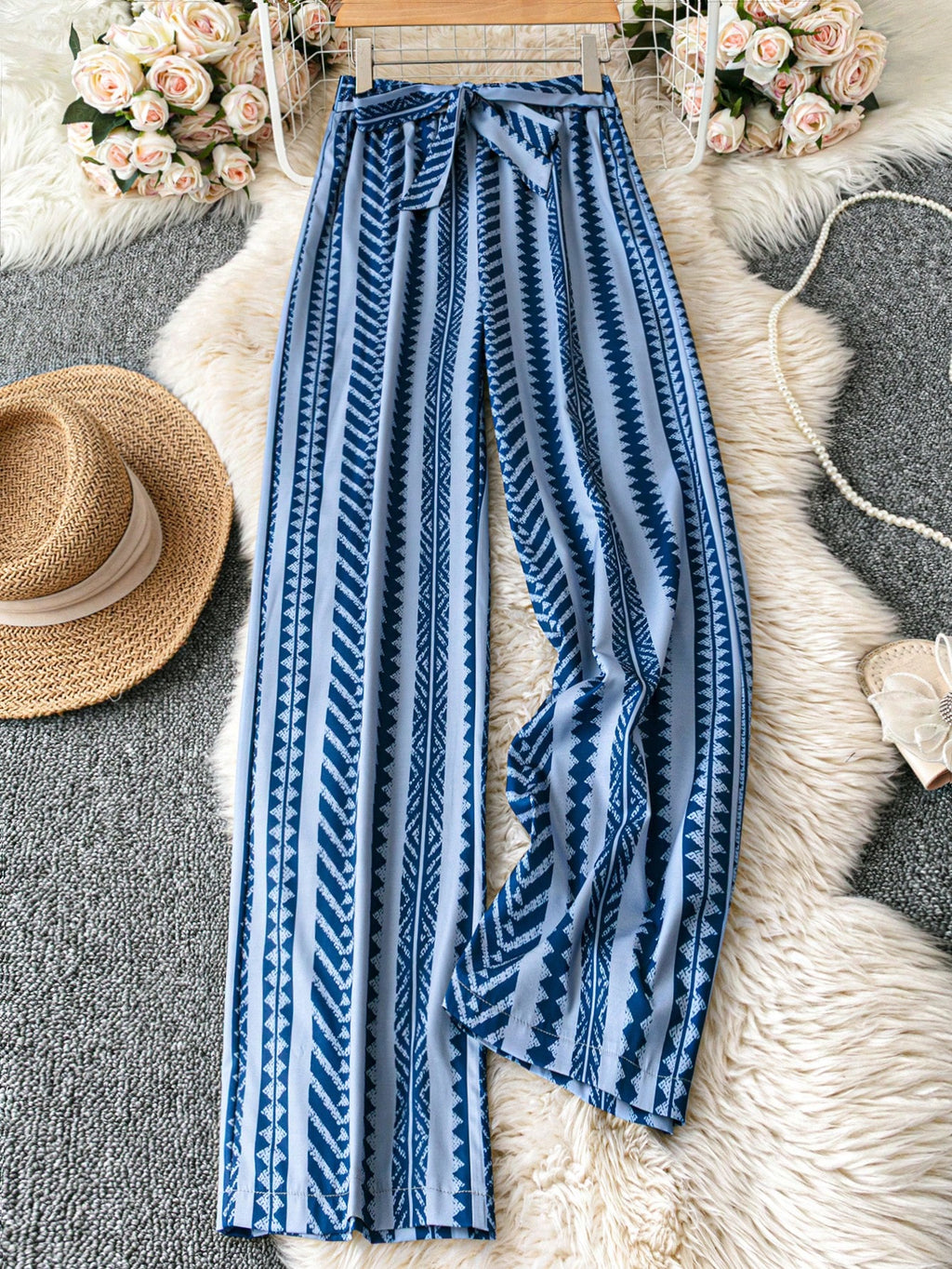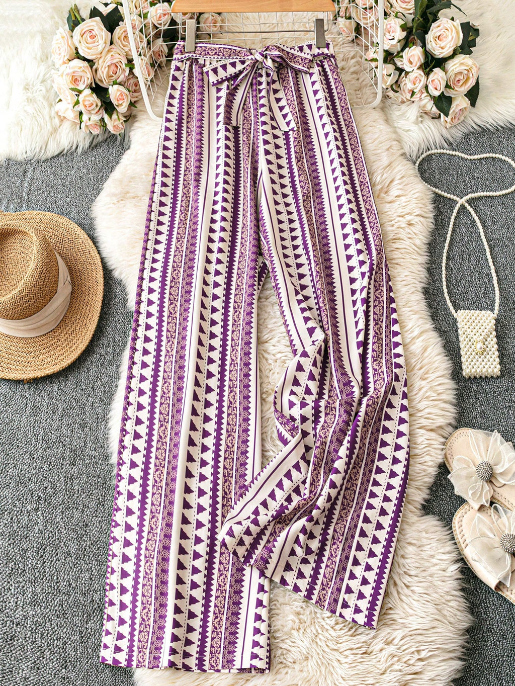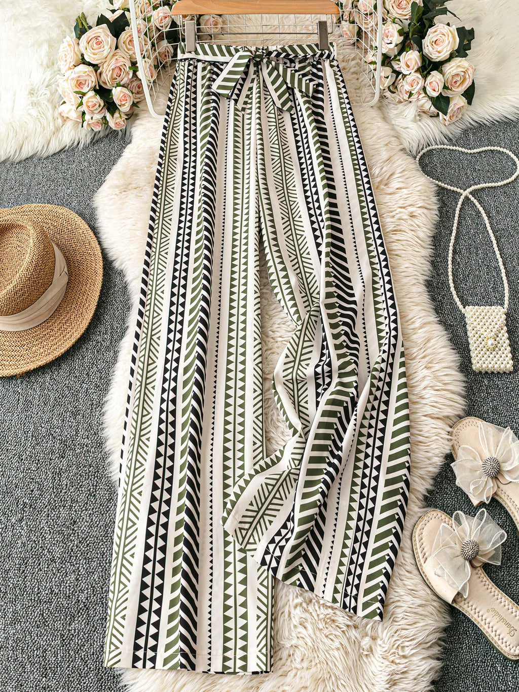 BELLAVOG Allover Print Belted Wide Leg Casual Vacation Pants