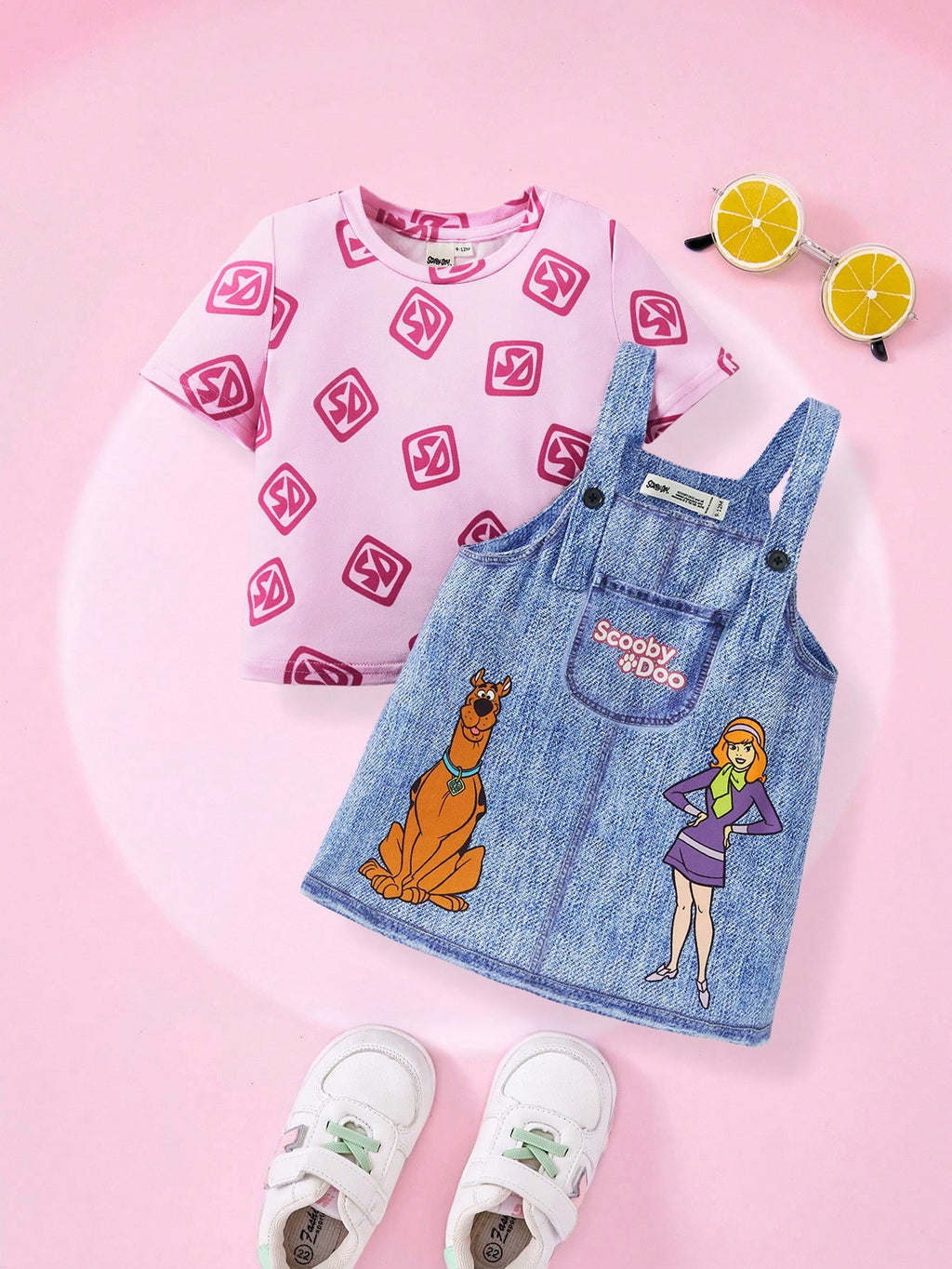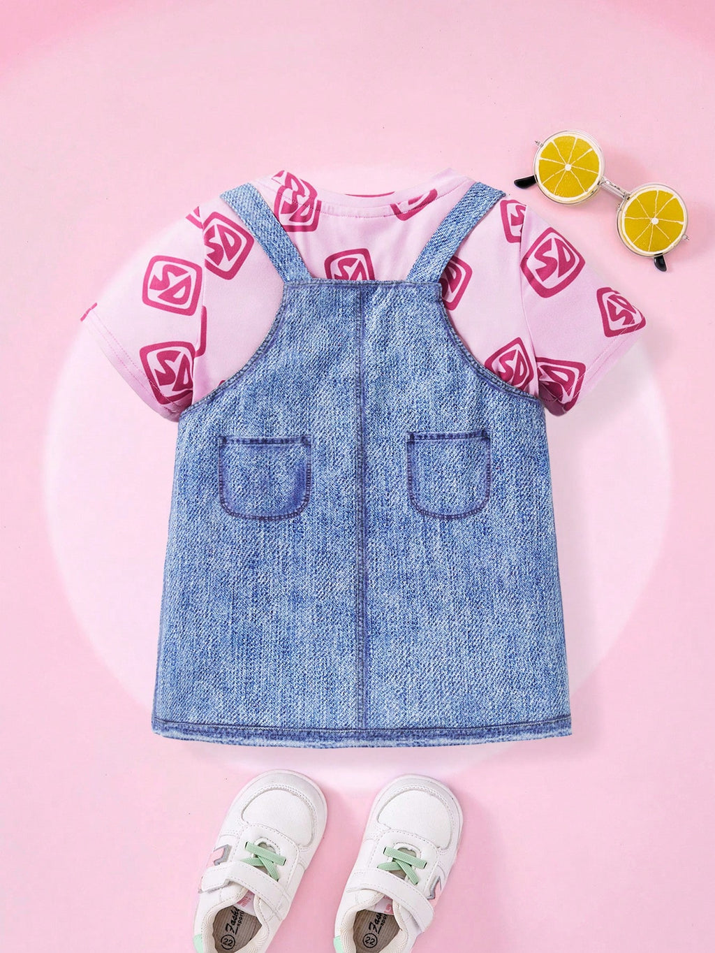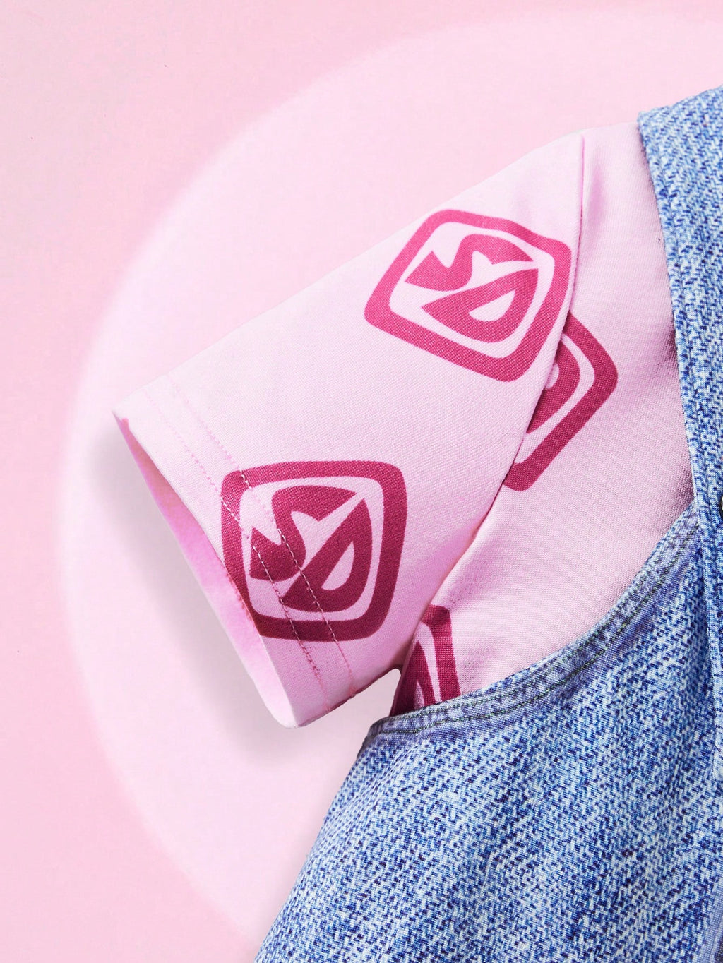 BELLAVOG Baby Girl Pink Allover Print Knitted Round Neck Short Sleeve T-Shirt And Cartoon Character