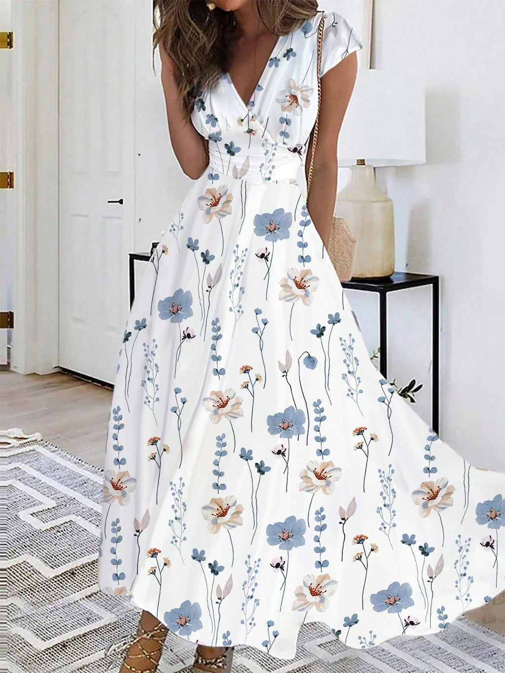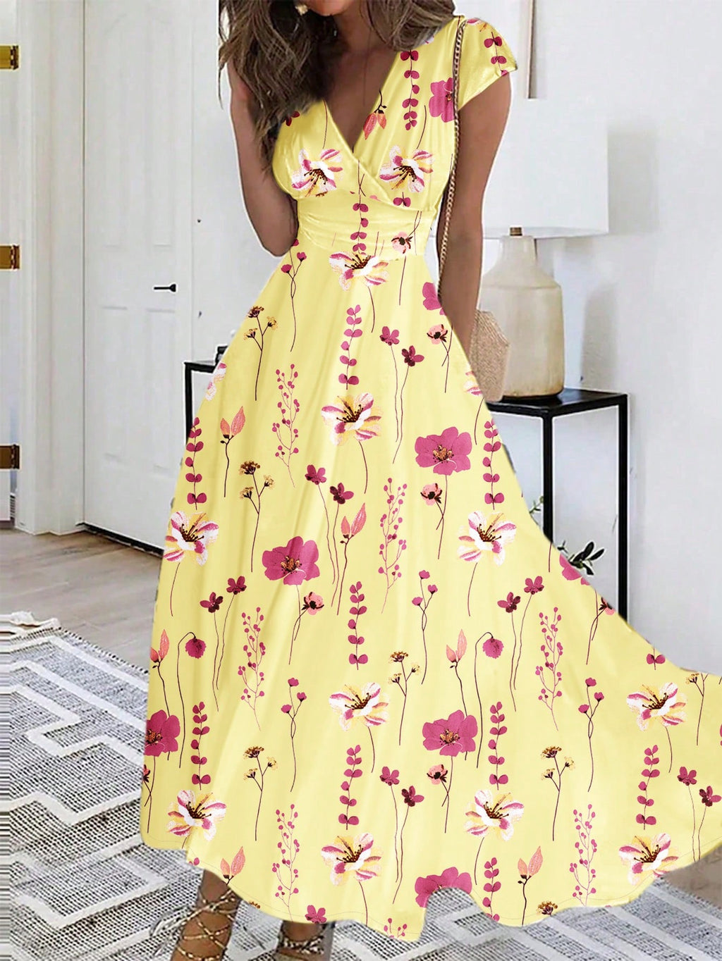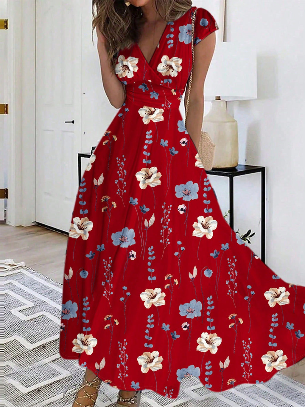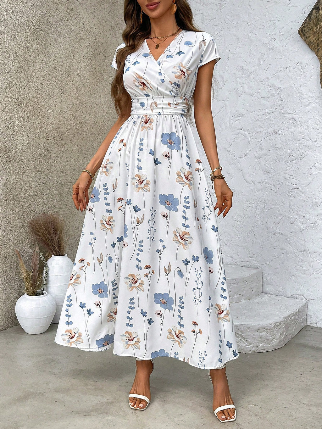 BELLAVOG Belle Women Floral Print Surplice Neckline Waist Ruched Vacation Dress For Summer Maxi Women Outfit