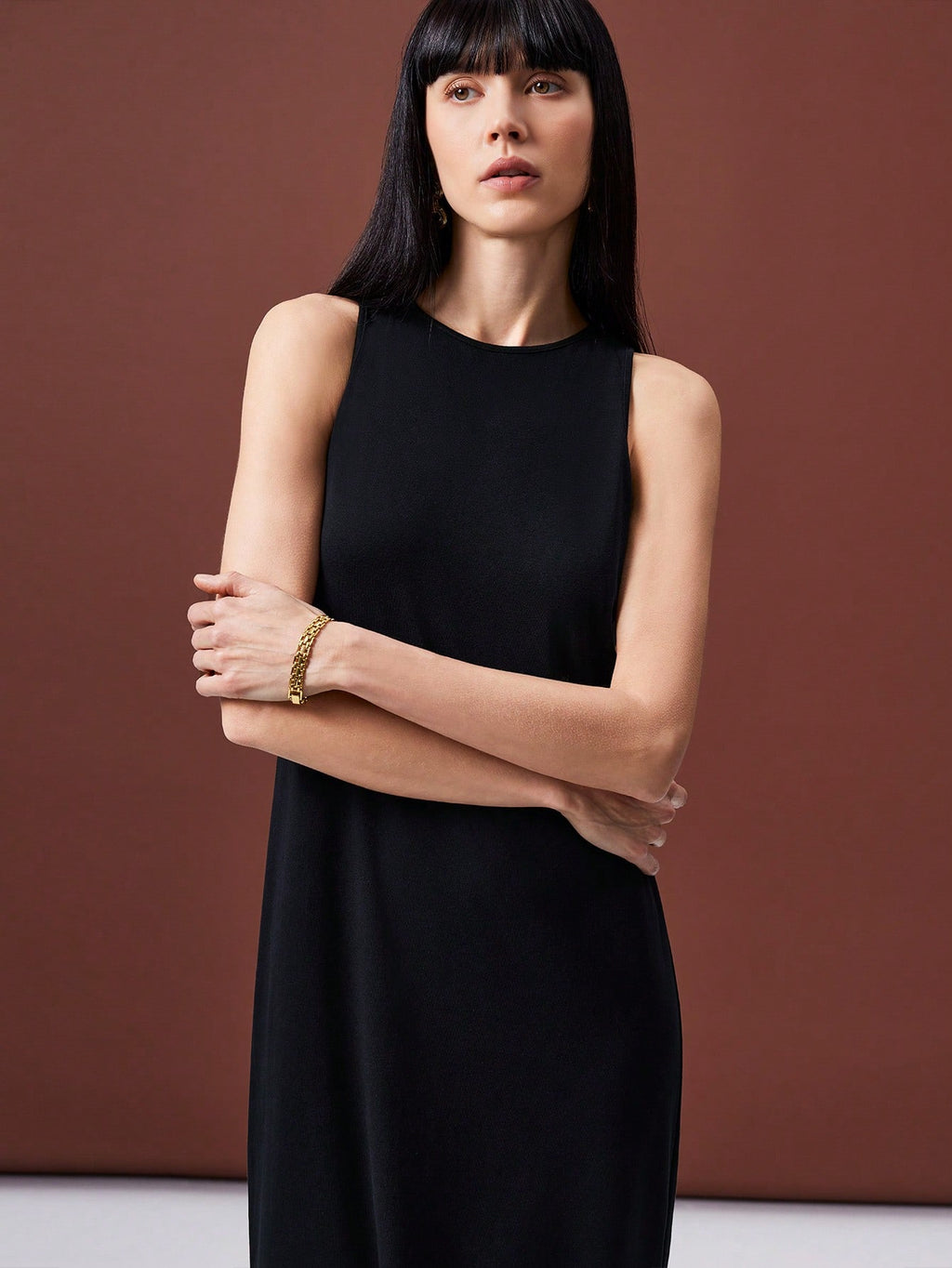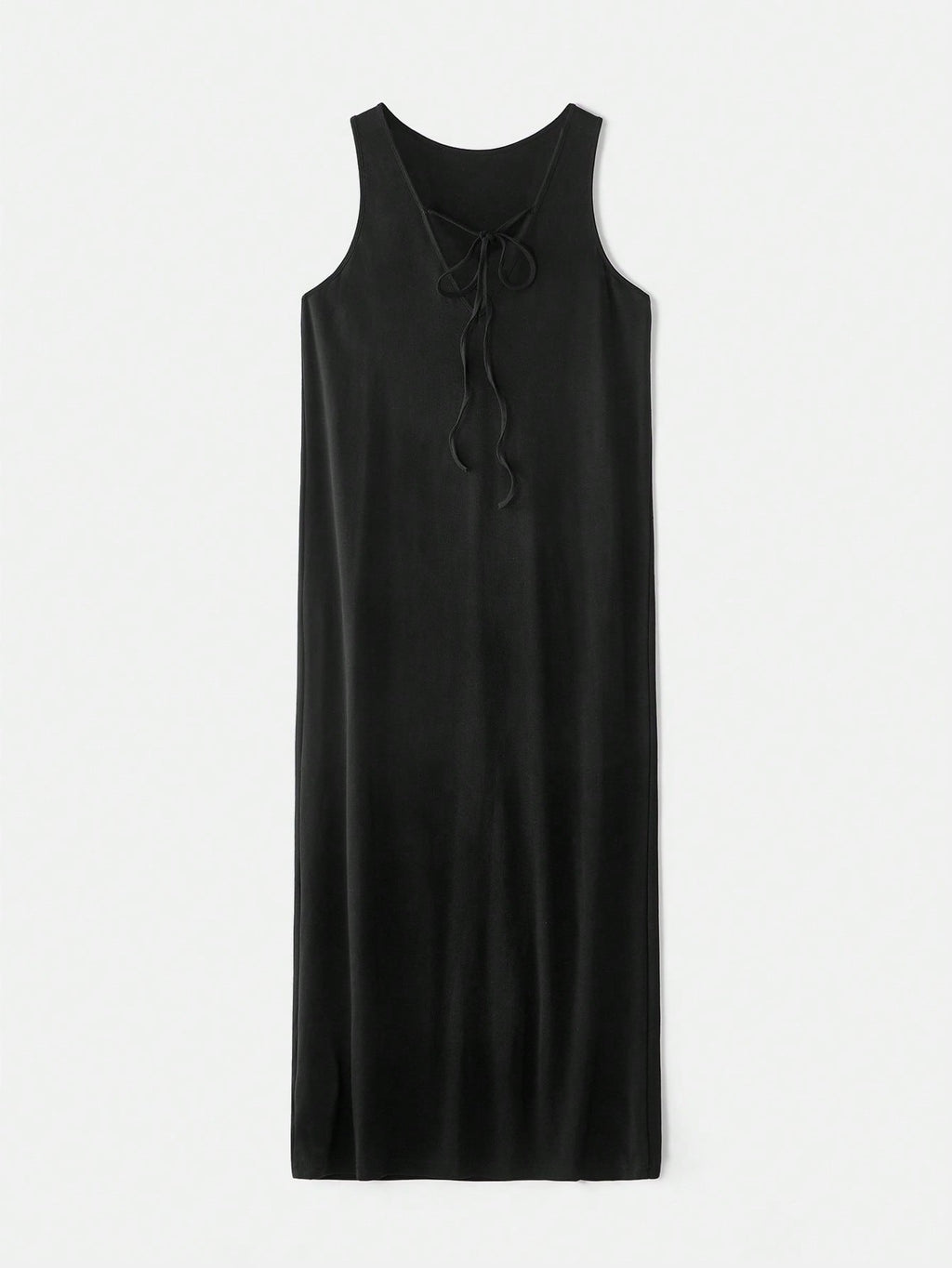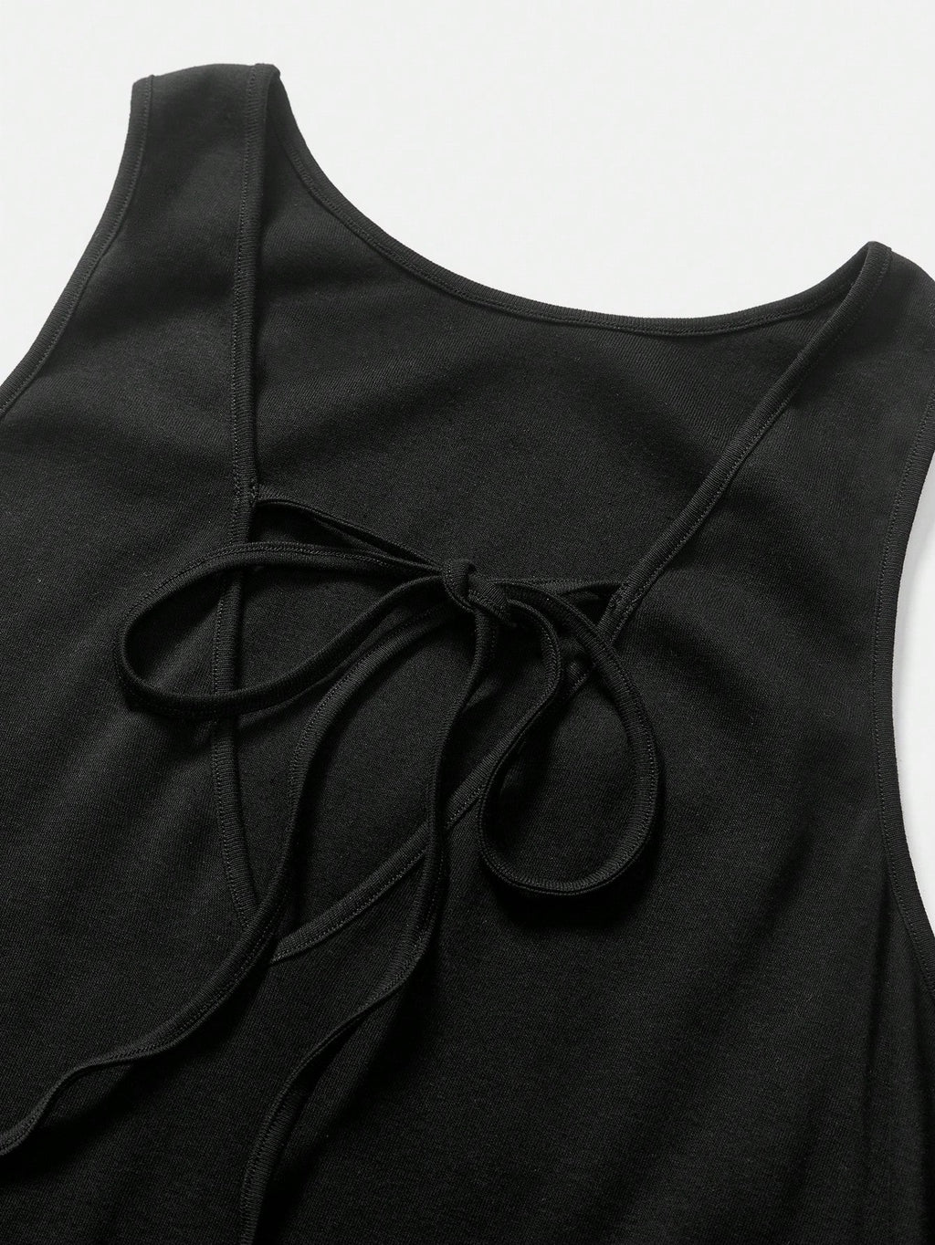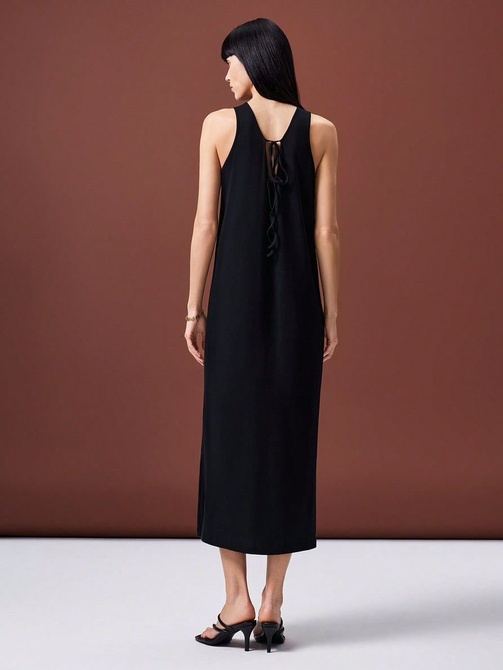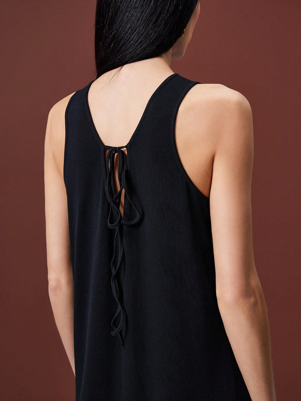 BELLAVOG Black Minimalist V-Neck Tie-Up Sleeveless Dress For Commute