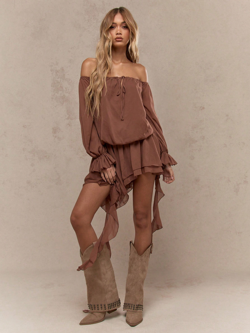 BELLAVOG Bohemian Off Shoulder Ruffle Dress Asymmetrical High Low Hem Summer Beach Vacation Resort Wear Bardot Neckline Long Sleeve Midi Dress With Belt