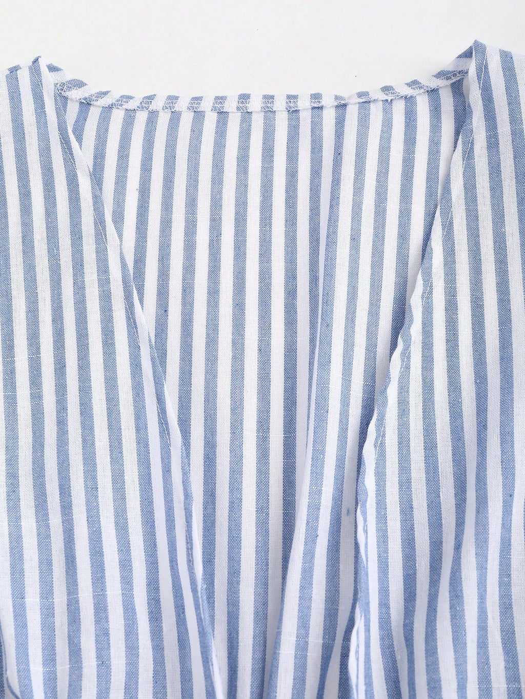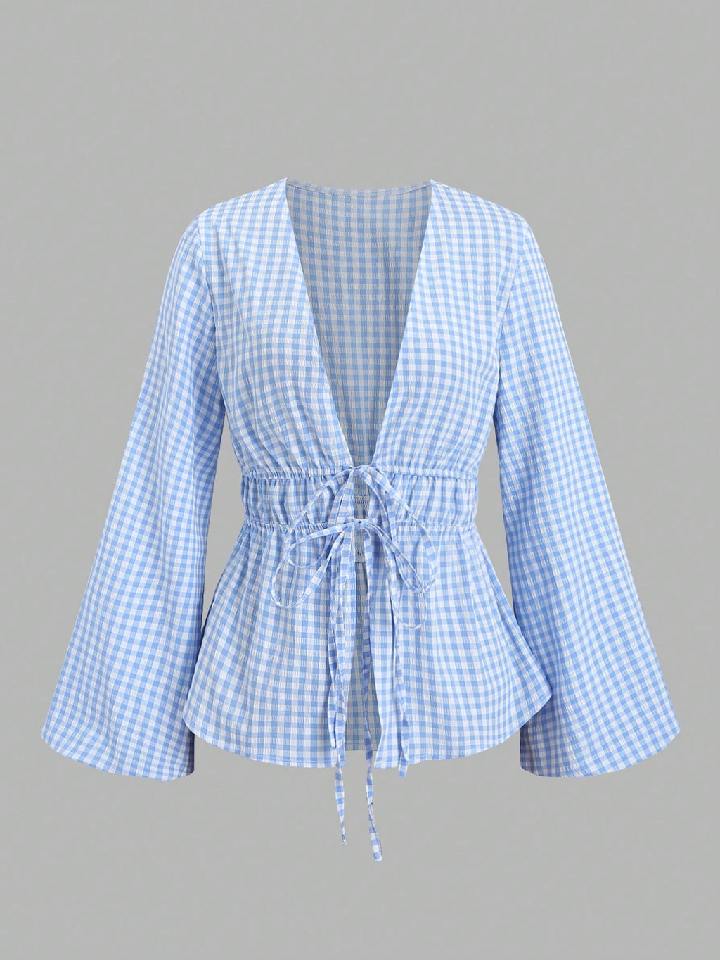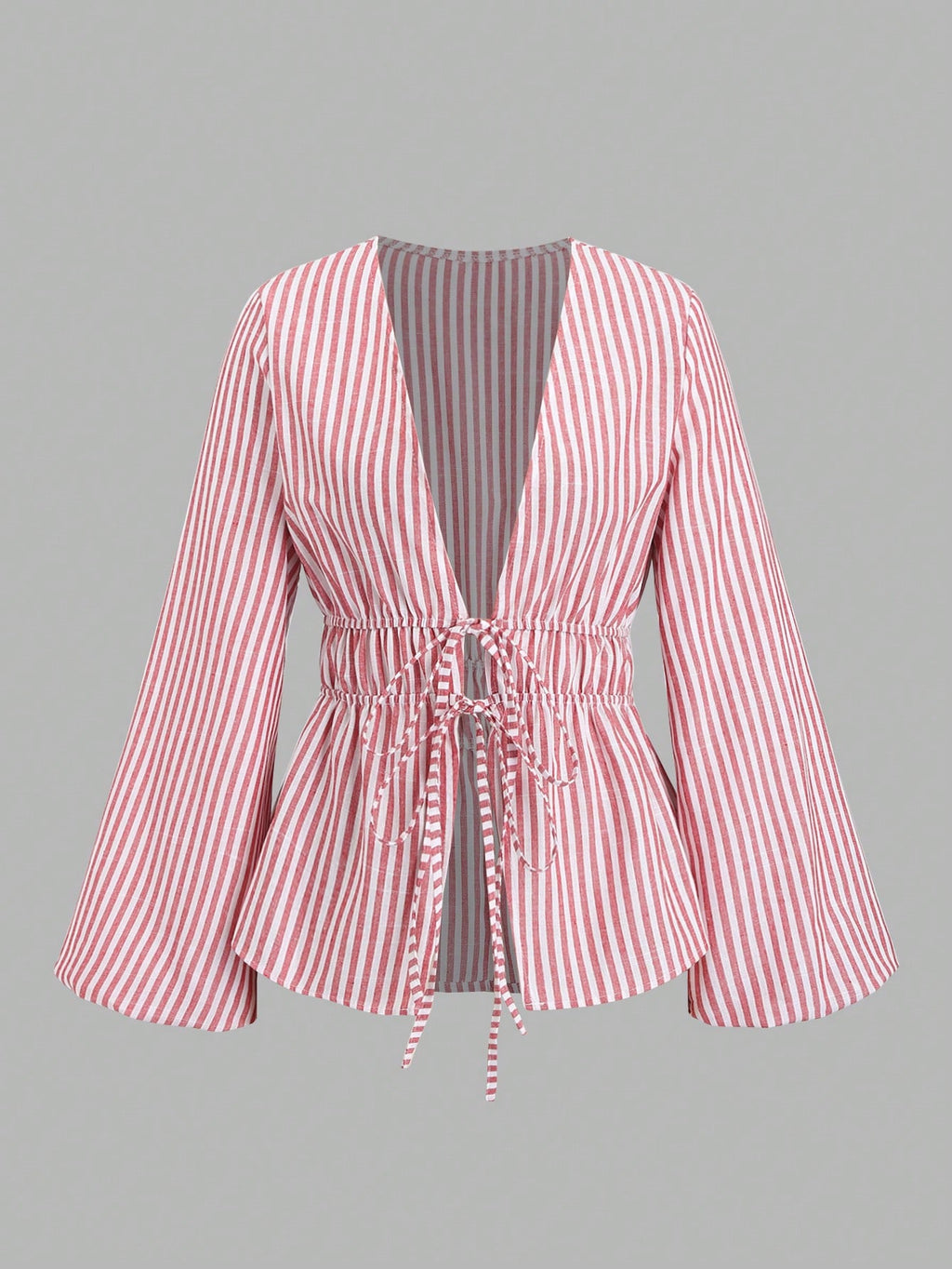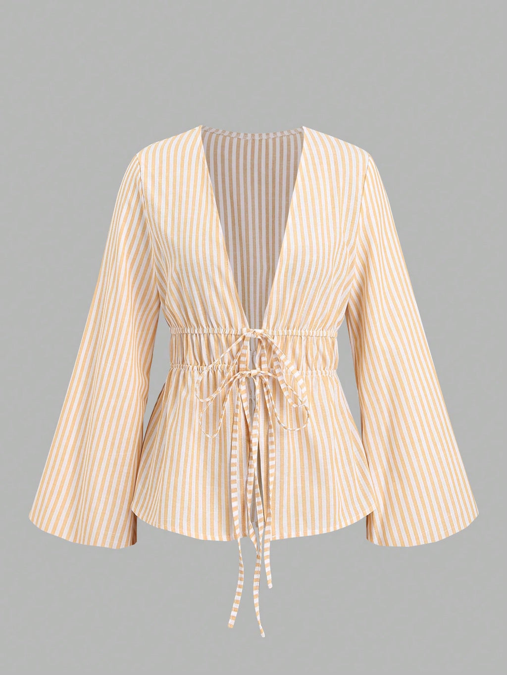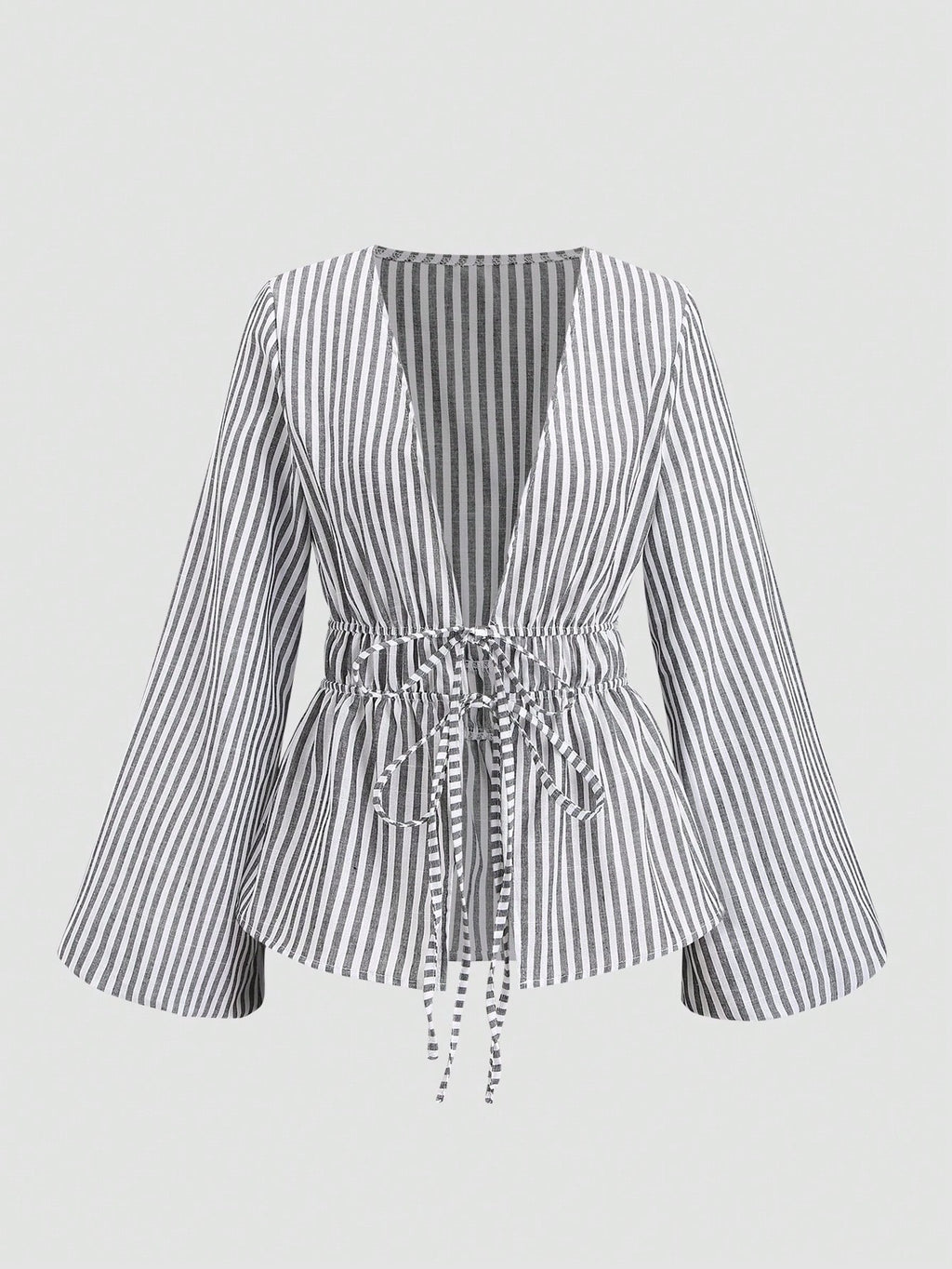 BELLAVOG Casual Striped Tie-Waist Bell-Sleeve Blouse For Work, Autumn