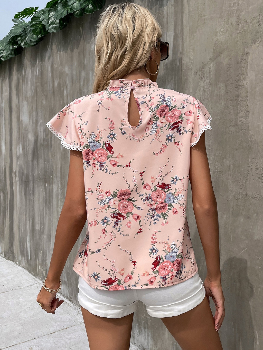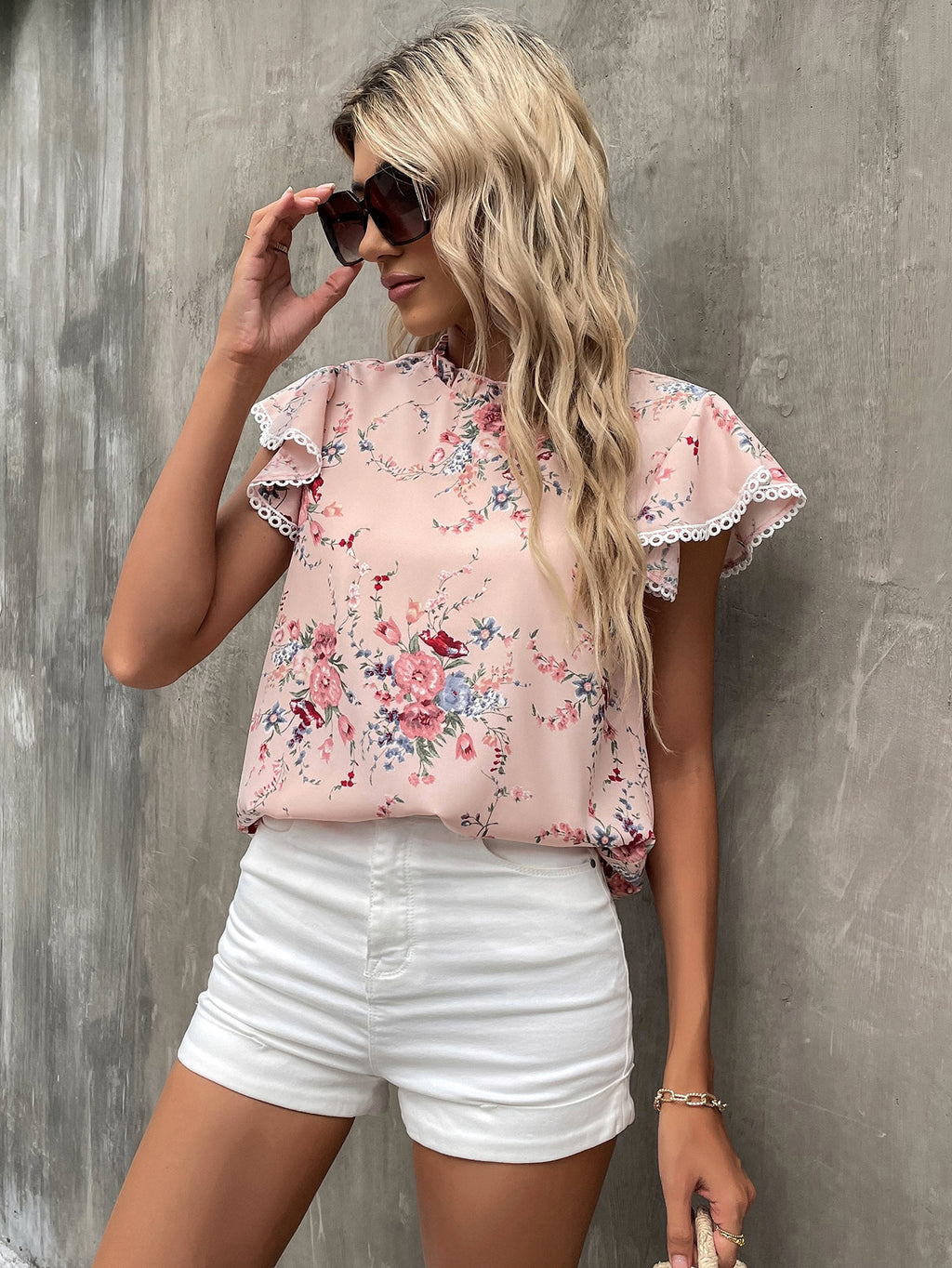BELLAVOG Clasi Floral Print Contrast Guipure Lace Butterfly Sleeve Frill Neck Blouse