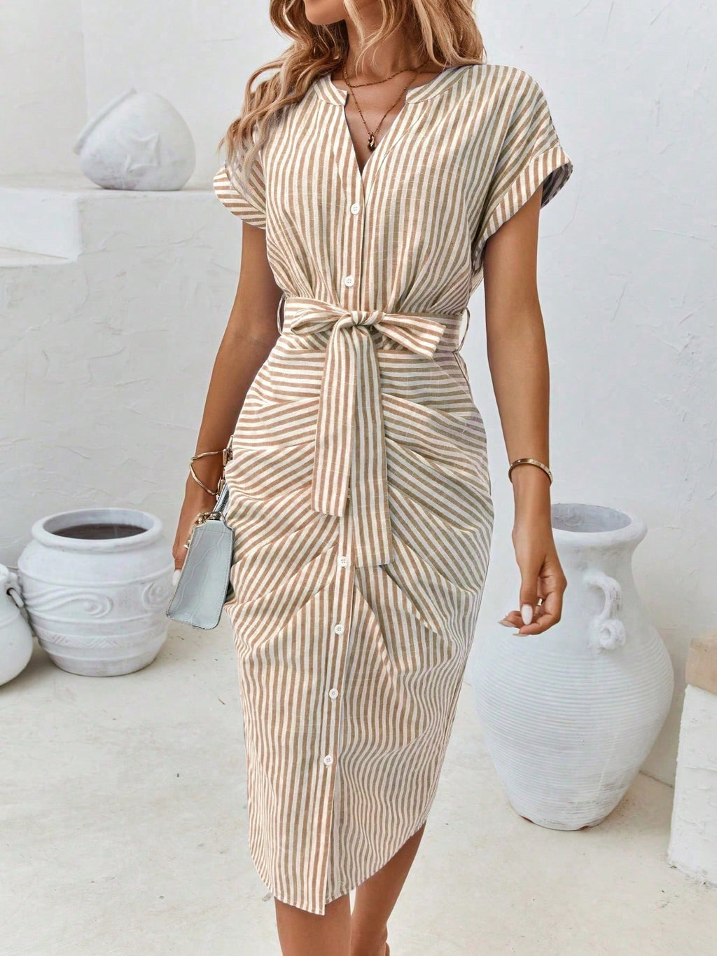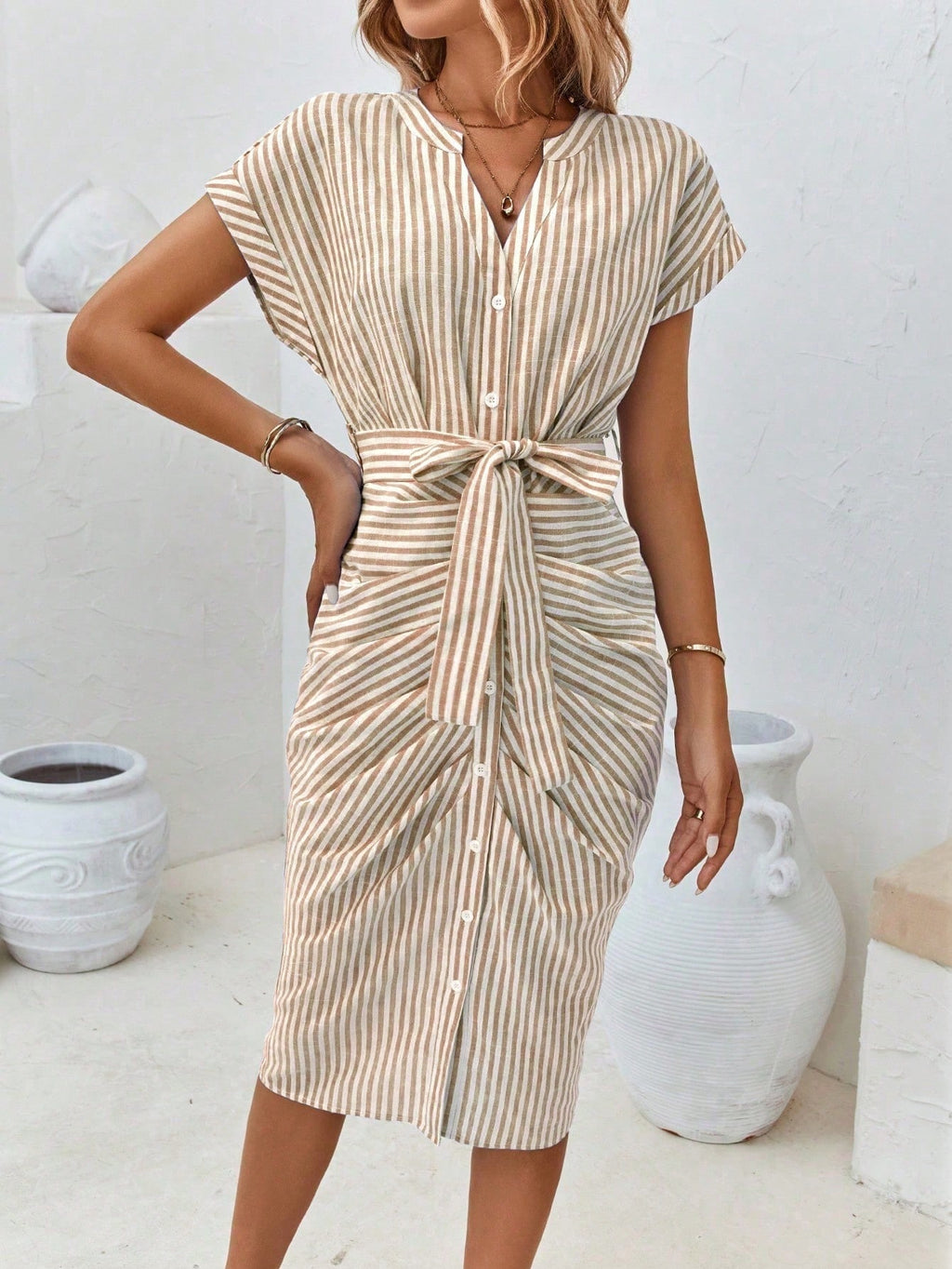 BELLAVOG Clasi Holiday Leisure Colour-Blocking Striped Notched Collar Batwing Sleeve Pleated Shirt Dress With Front Buttons Maxi Women Outfit