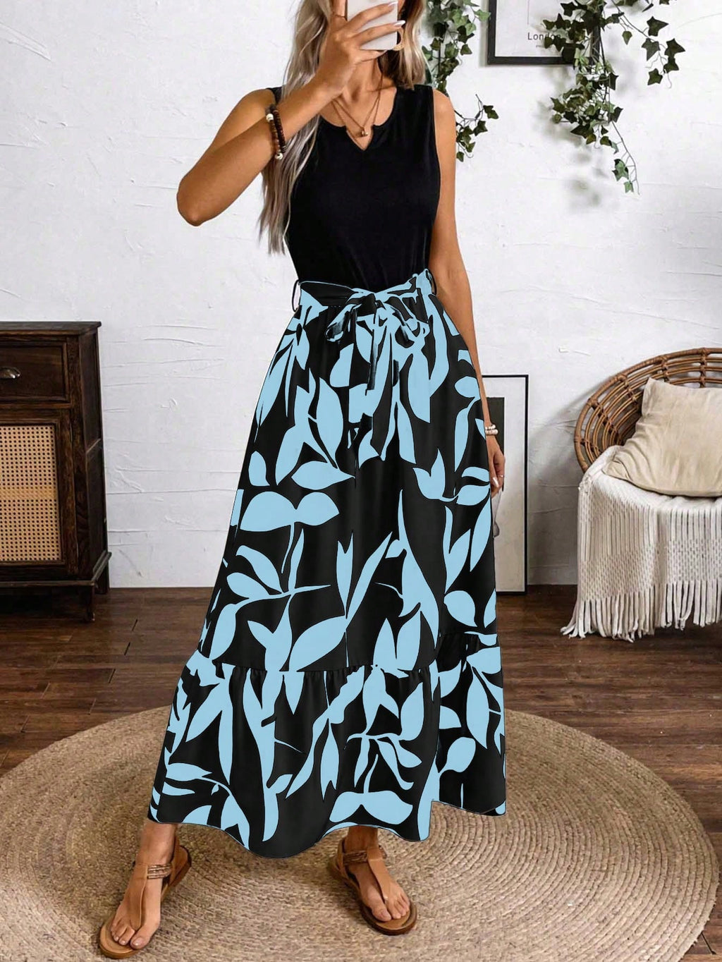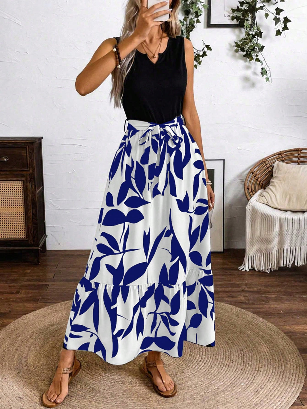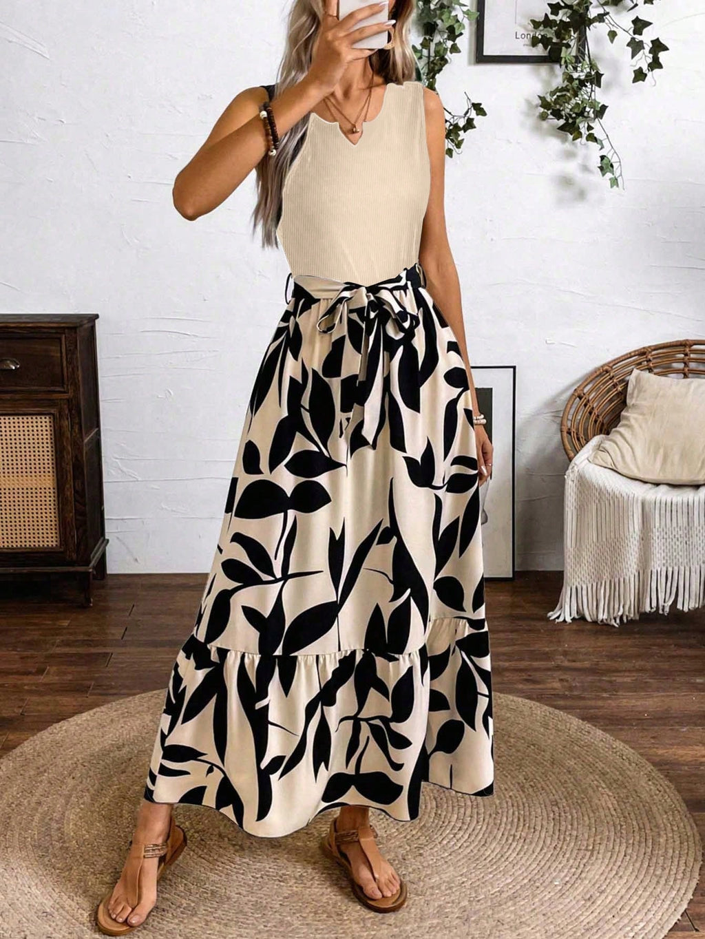 BELLAVOG Clasi Spring And Summer Printed Splicing Dress (Medium Length A-Line Sleeveless Knitted Splicing A-Line Shuttlecock Leaf Printed Dress) Vacation Beach Outfits Women