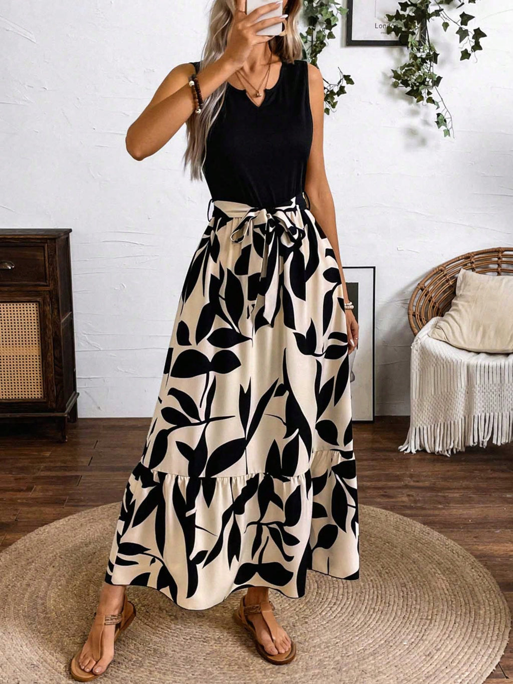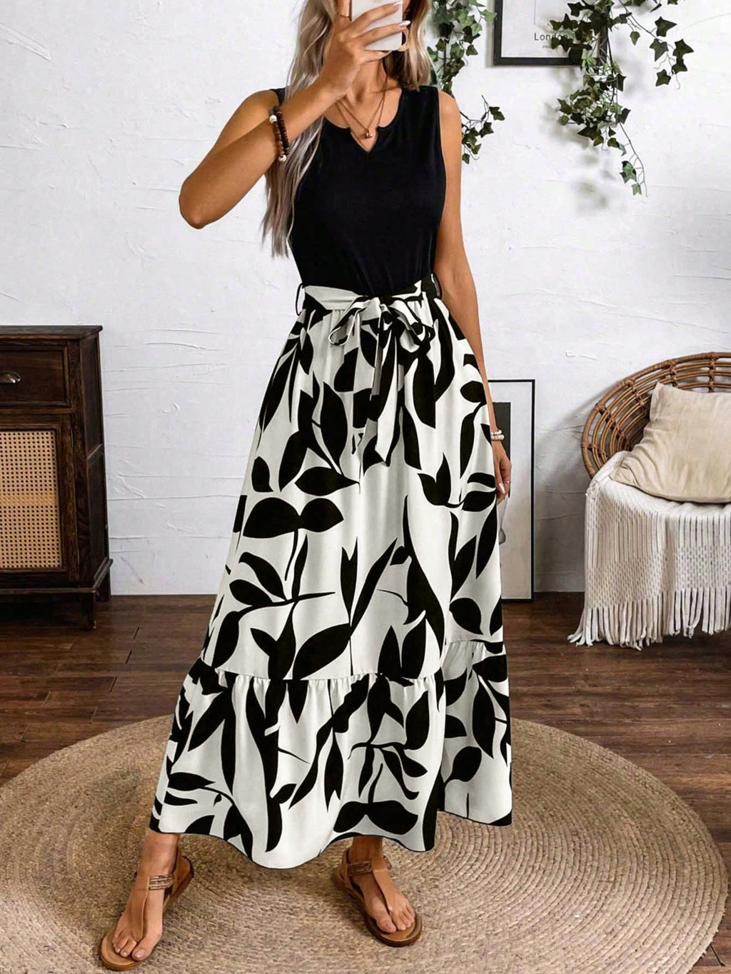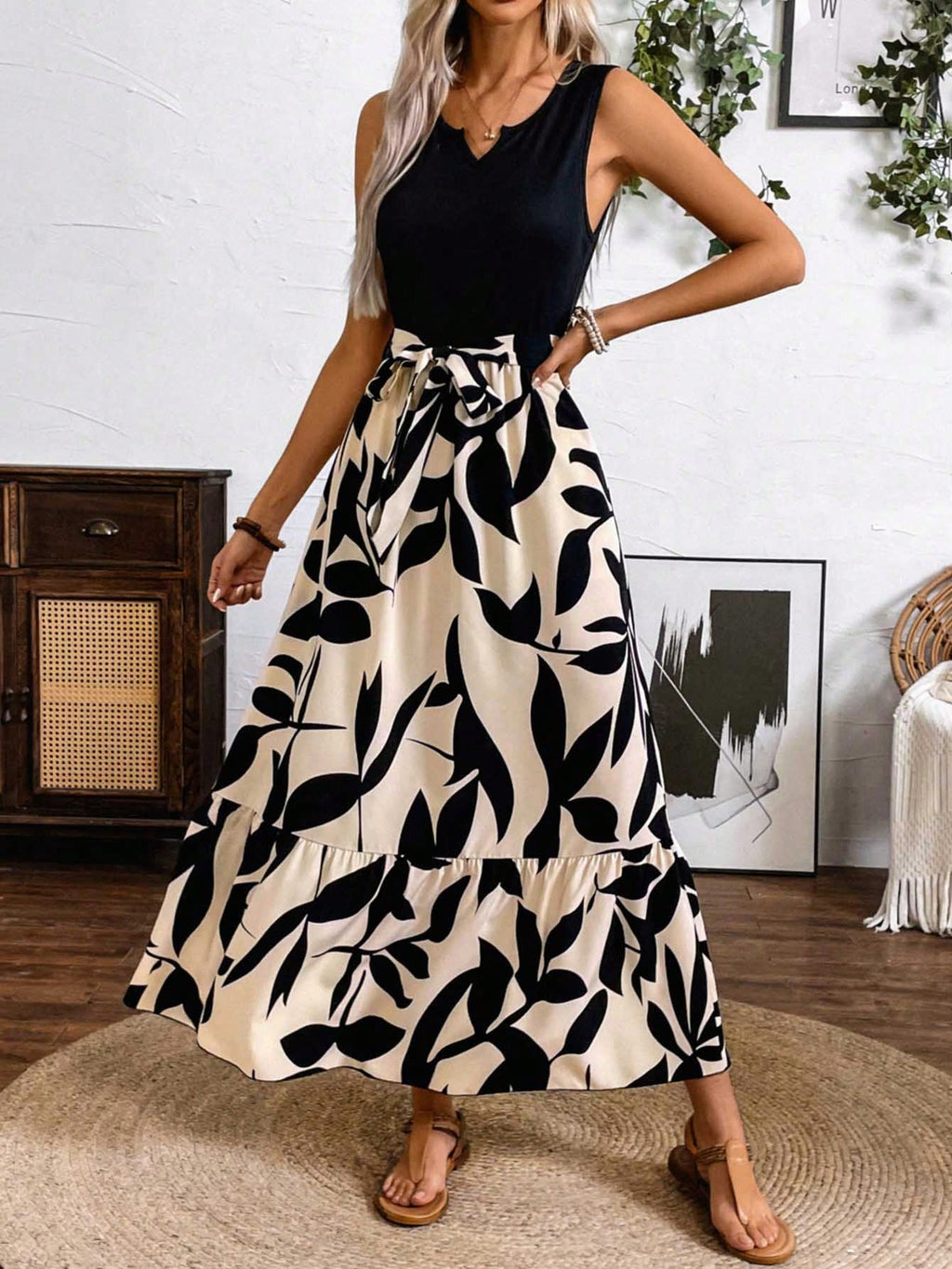 BELLAVOG Clasi Spring And Summer Printed Splicing Dress (Medium Length A-Line Sleeveless Knitted Splicing A-Line Shuttlecock Leaf Printed Dress) Vacation Beach Outfits Women