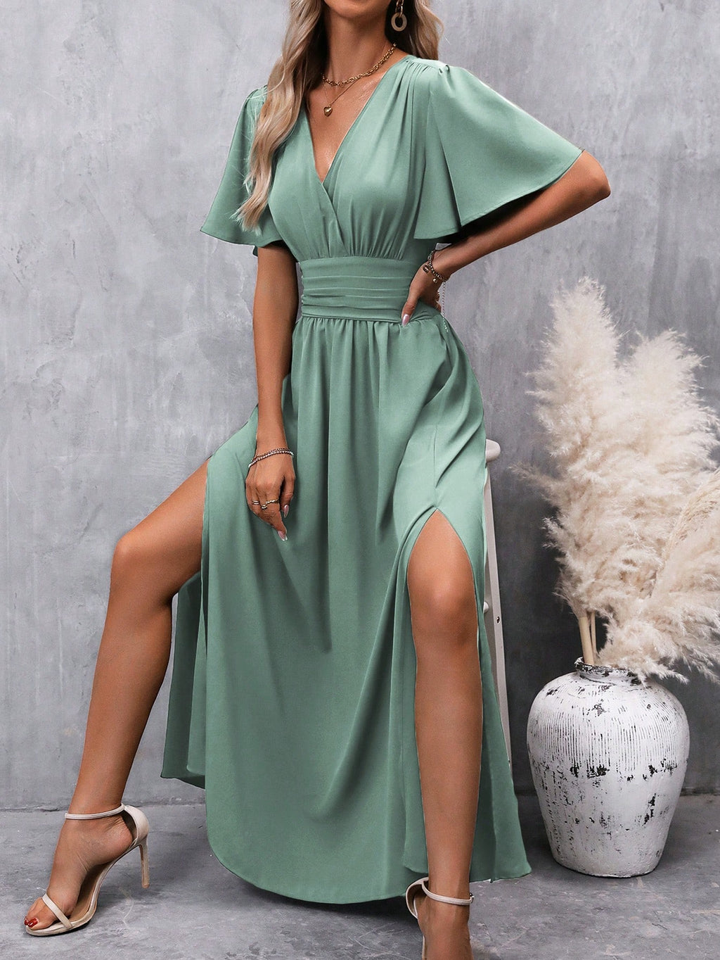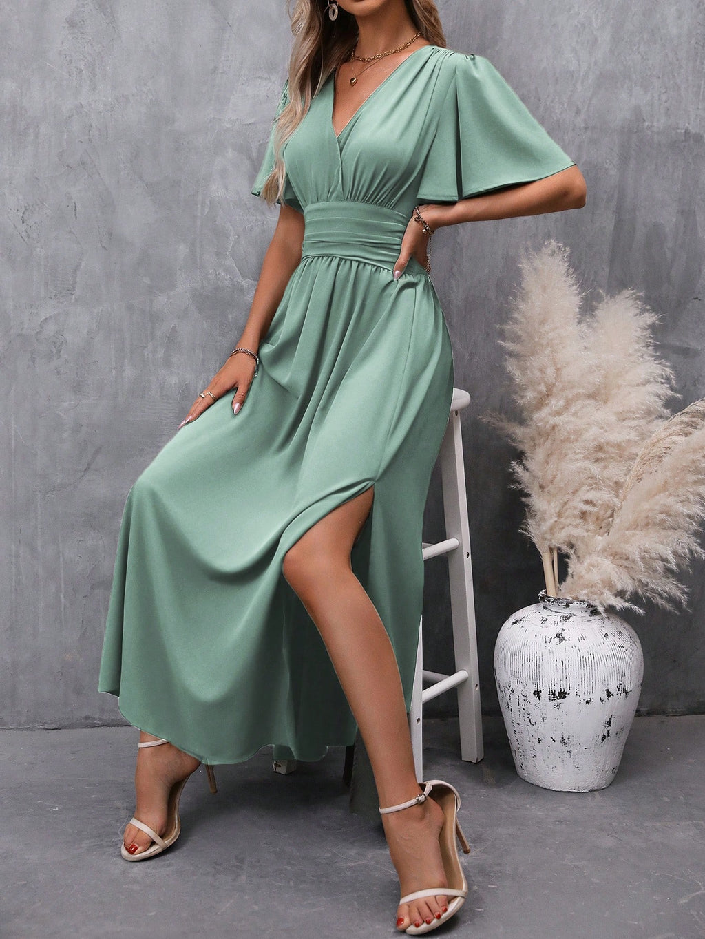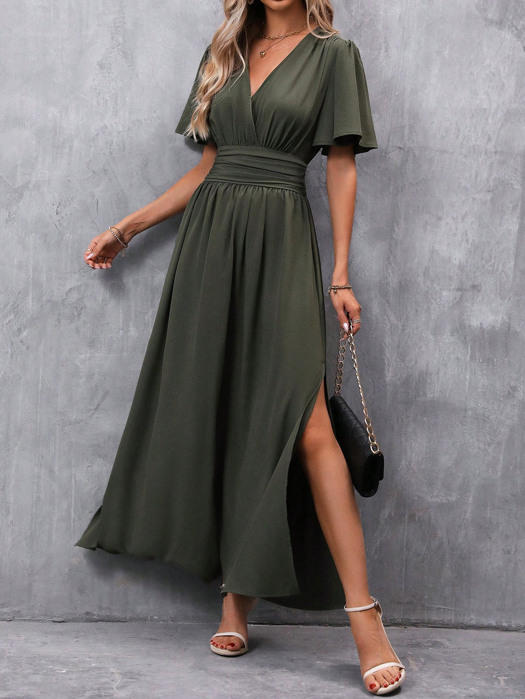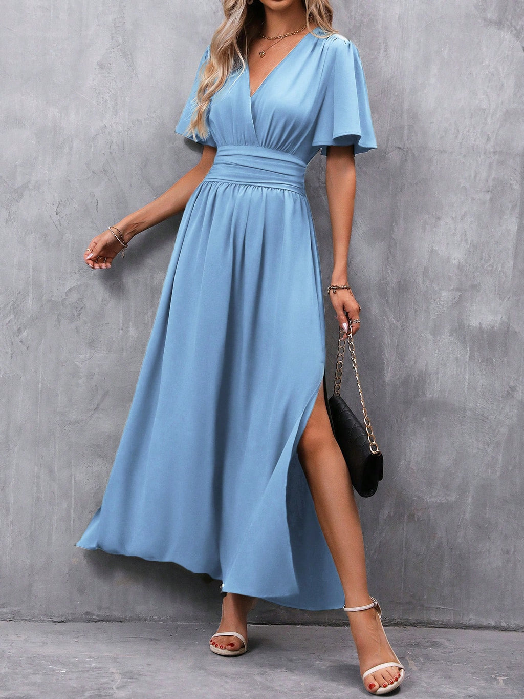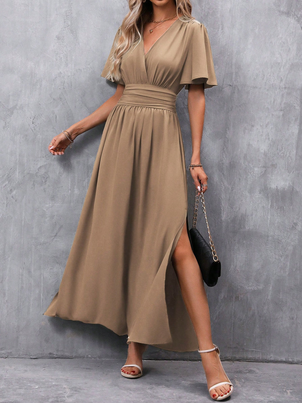 BELLAVOG Clasi Women's Solid Color V-Neck Ruffle Sleeve Short Dress Maxi Women Outfit