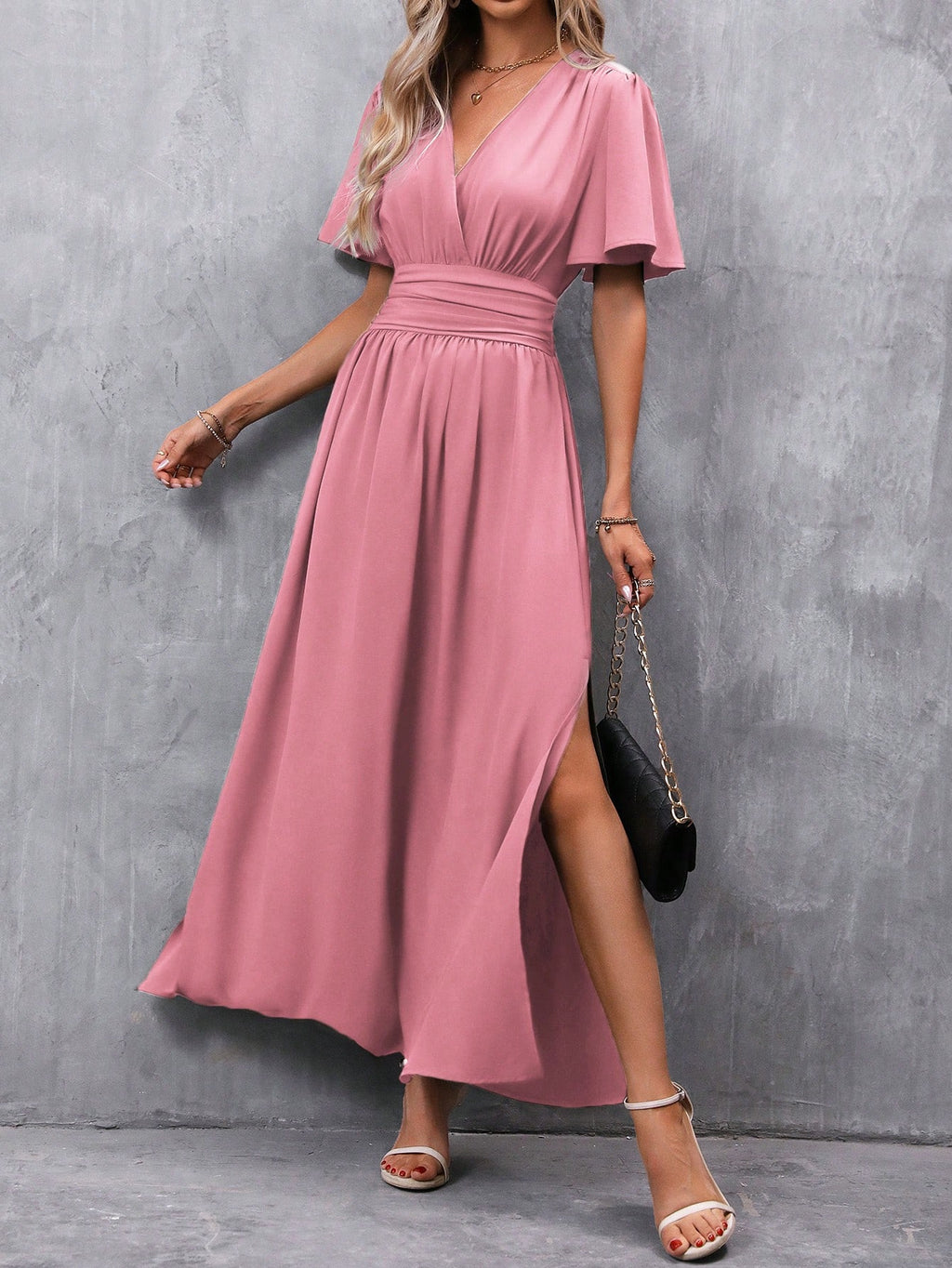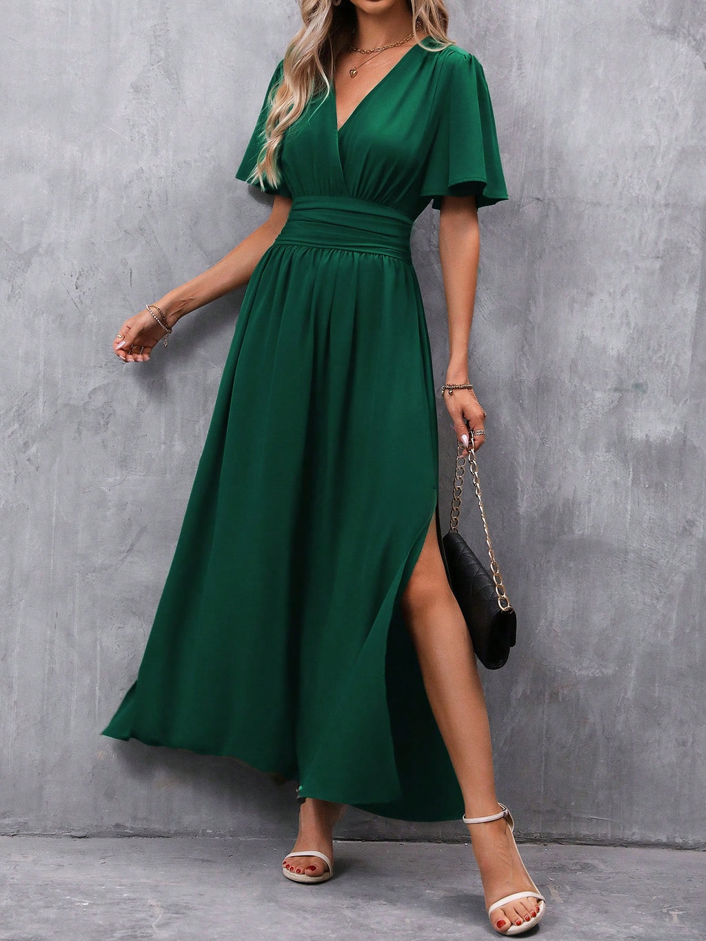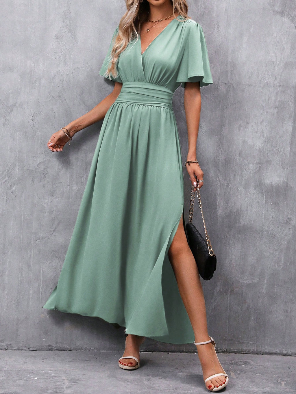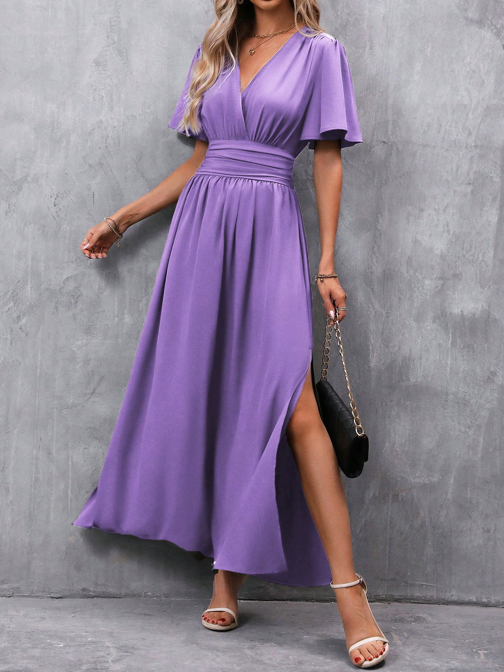 BELLAVOG Clasi Women's Solid Color V-Neck Ruffle Sleeve Short Dress Maxi Women Outfit