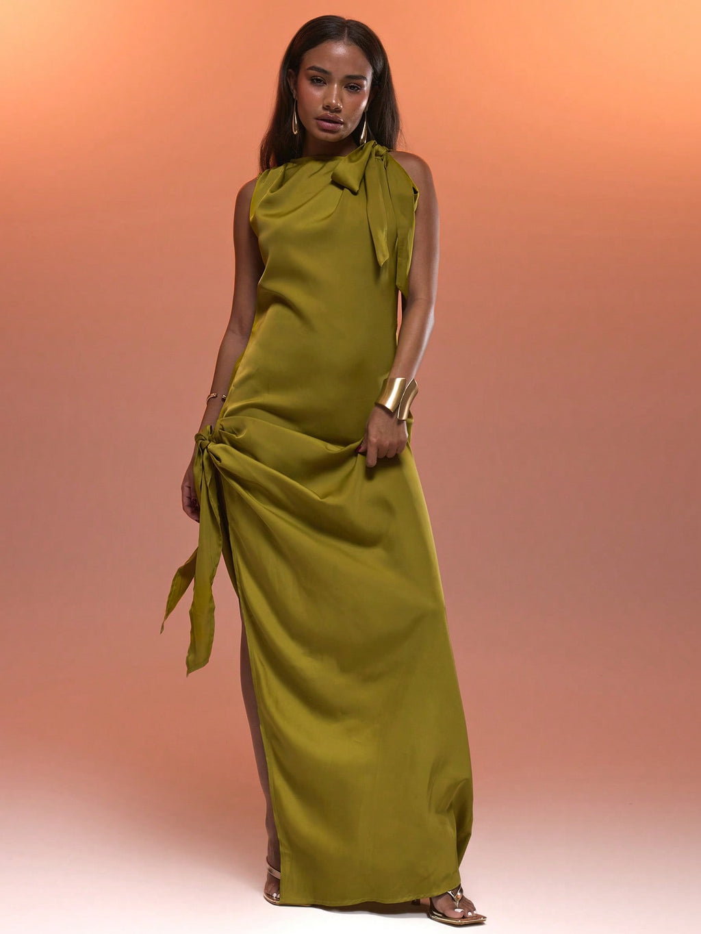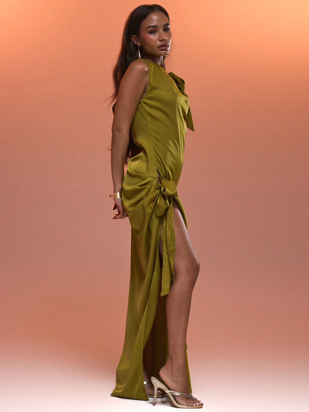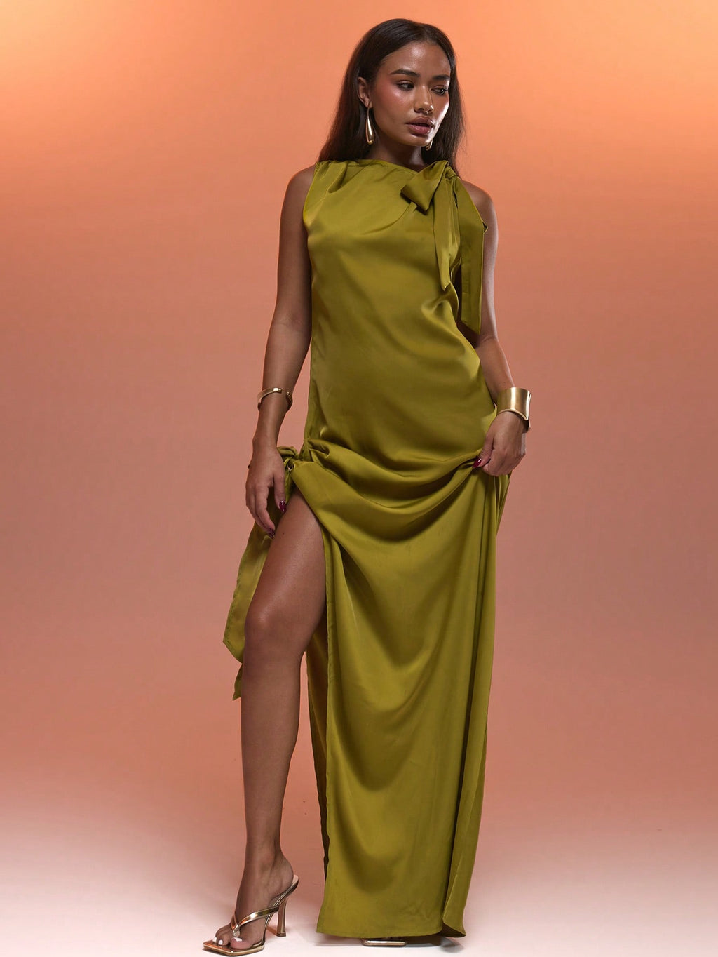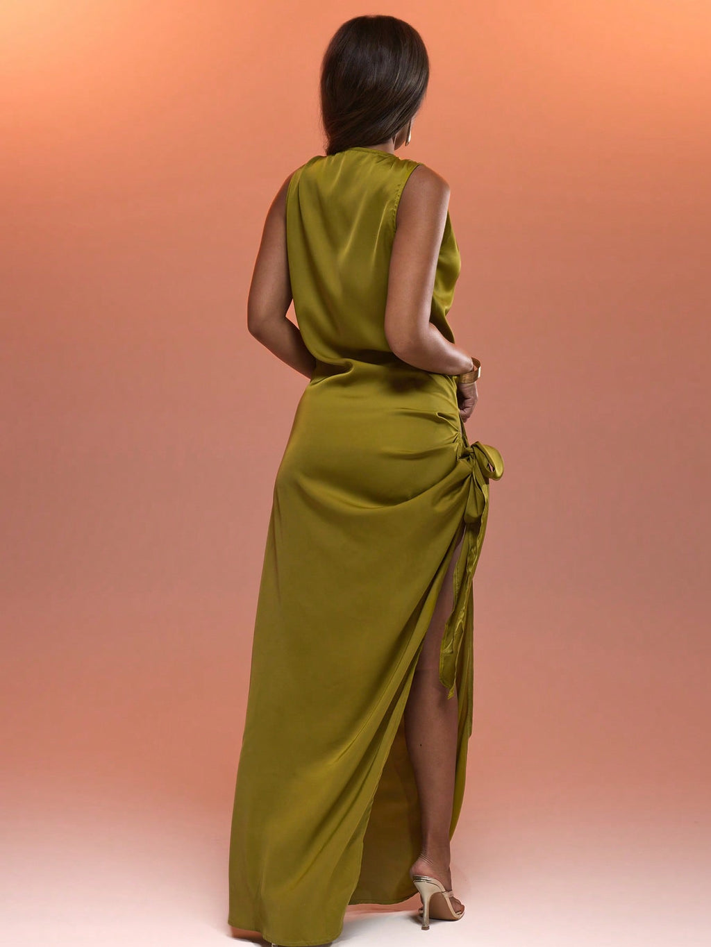 BELLAVOG Draped Asymmetric Shoulder And Waist Tie Satin Sleeveless Leg Split Maxi Loose Dress Sexy Ibiza Fits Spring Summer Vacation Beach Elegant Wedding Guest