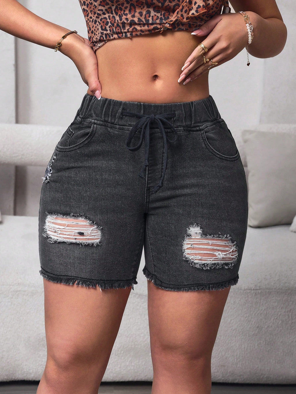 BELLAVOG Drawstring Waist Ripped Raw Trim Denim Shorts