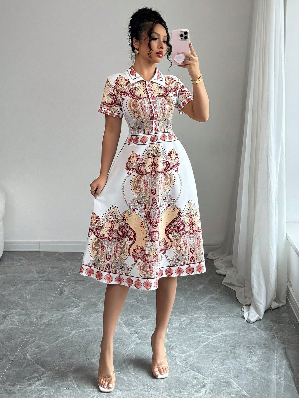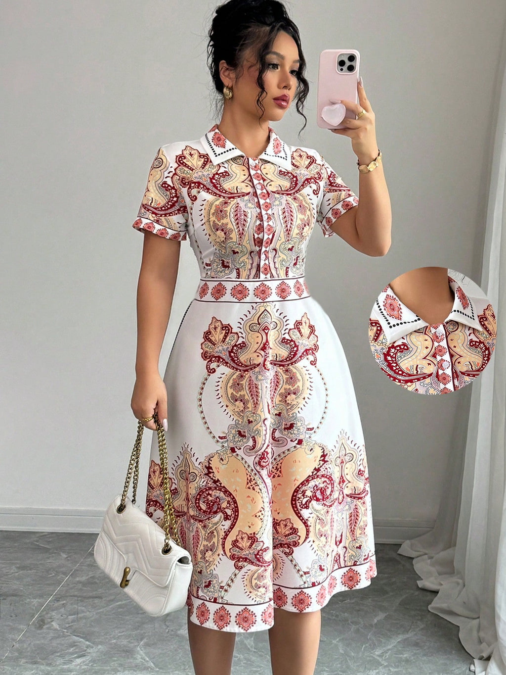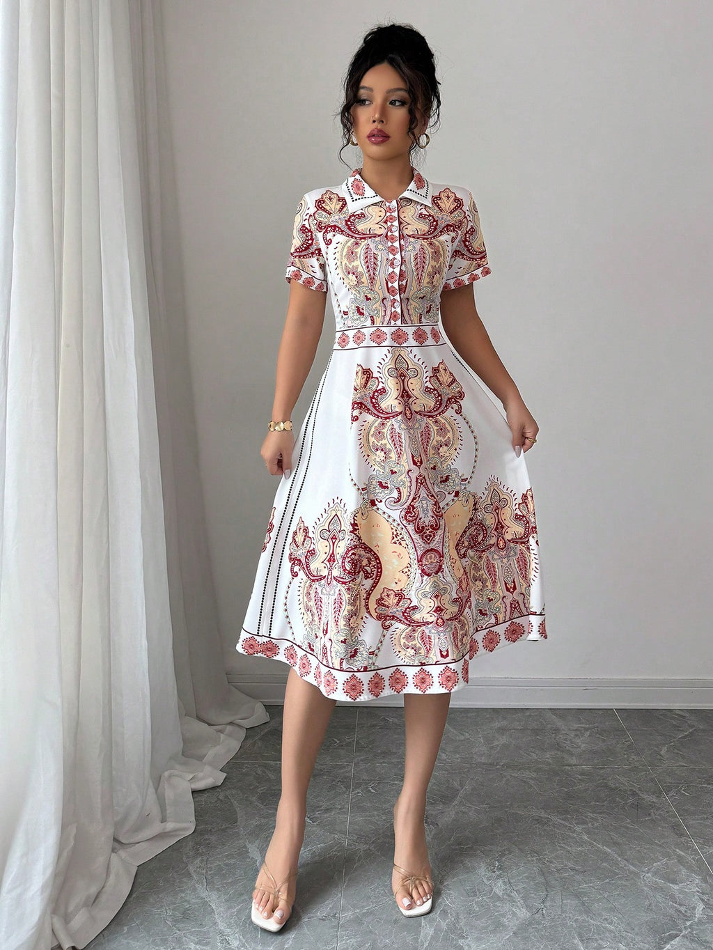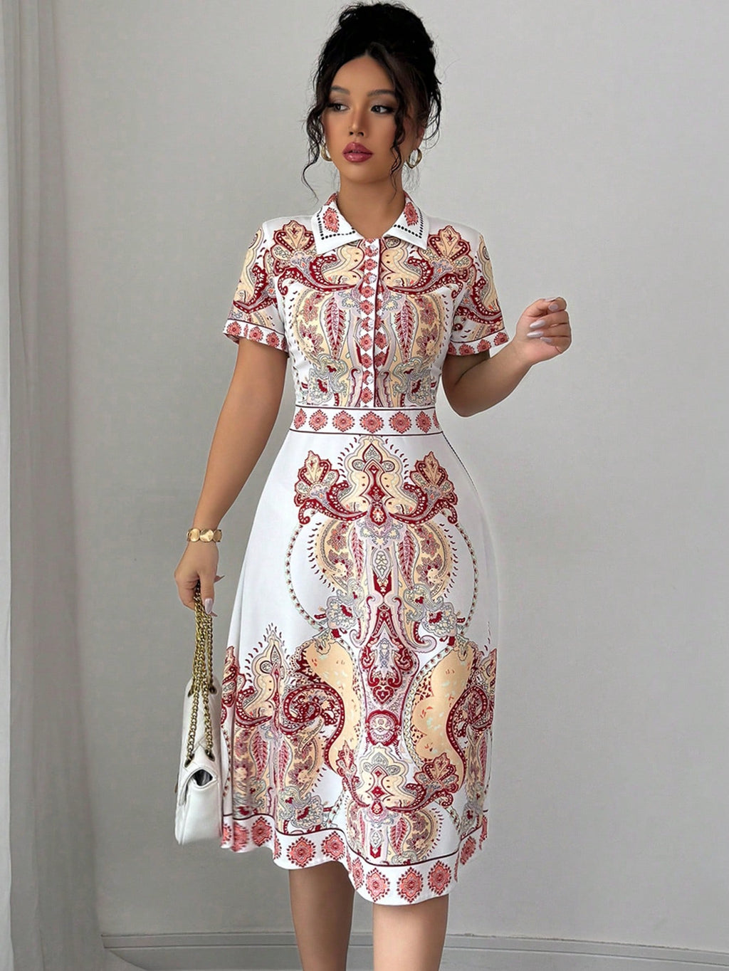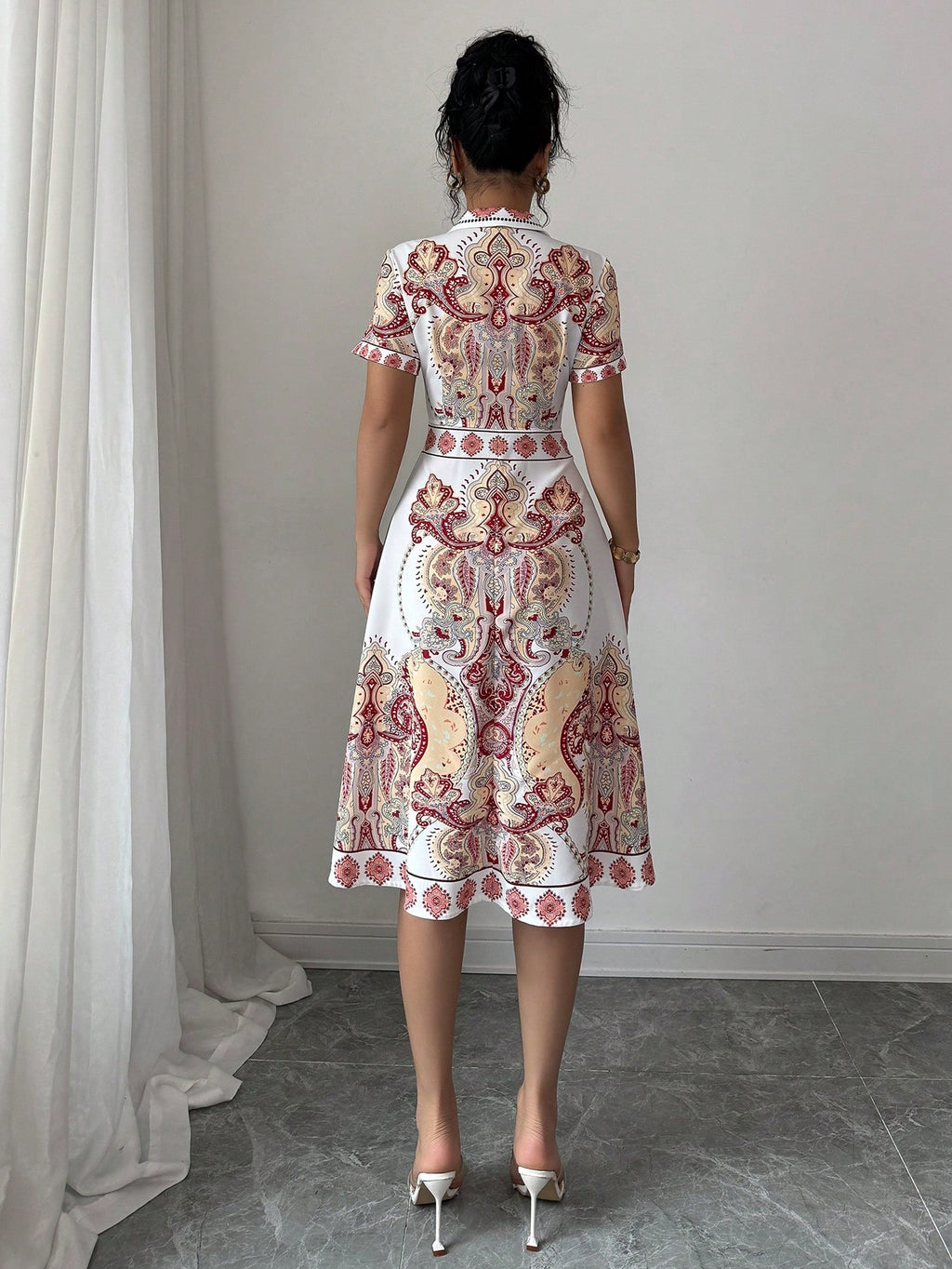 BELLAVOG Elegant Print A-Line Short Sleeve Dress For Women
