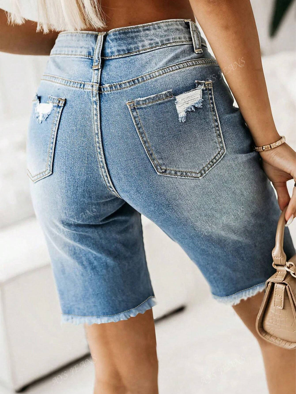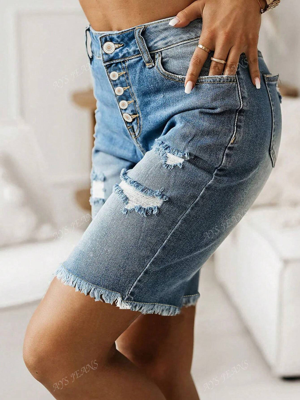 BELLAVOG Fashionable Distressed Frayed Hem Button Side Light Blue Stretchy Denim Mid Shorts, Street Style For Women