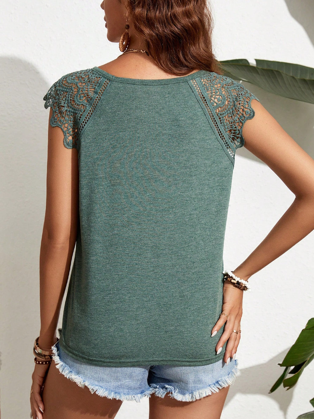 BELLAVOG Frenchy Ladies' Floral Printed Contrast Lace Cap Sleeve Casual T-Shirt, Vacation Style,Bridgerton