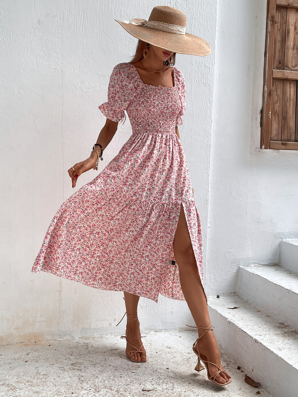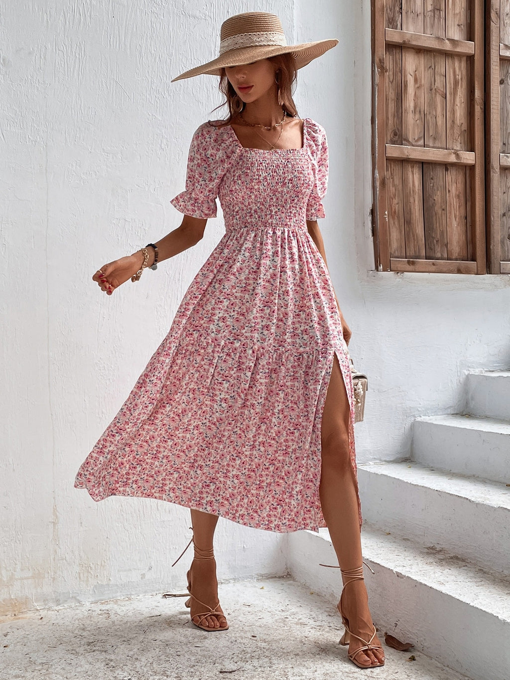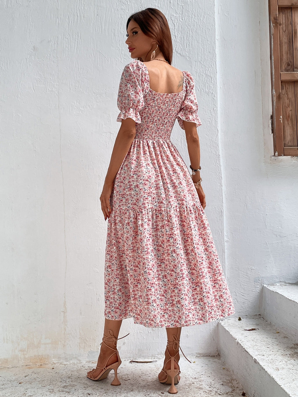 BELLAVOG Holidaya Ditsy Floral Print Square Neck Flounce Sleeve Ruffle Hem Dress Maxi Women Outfit