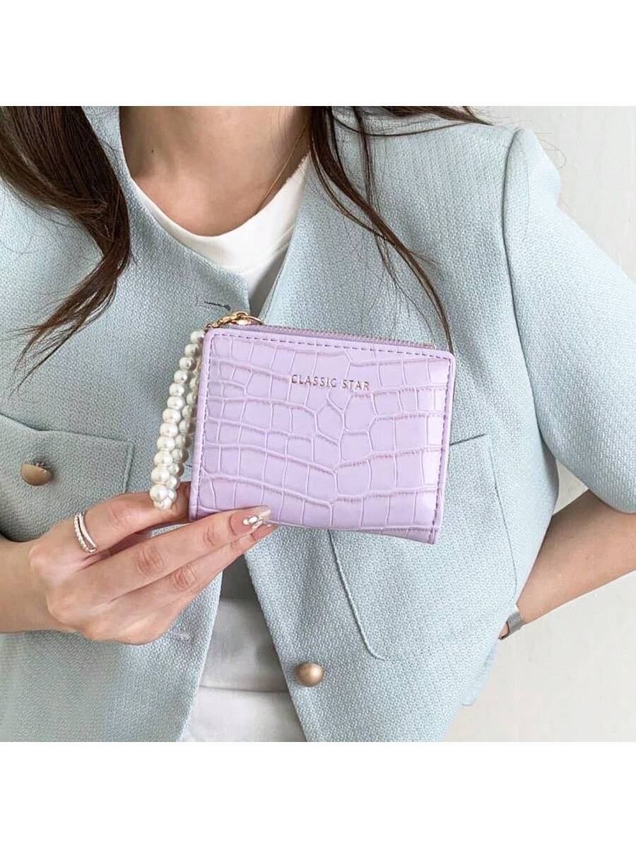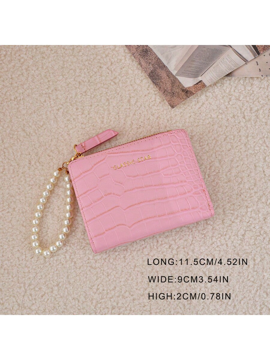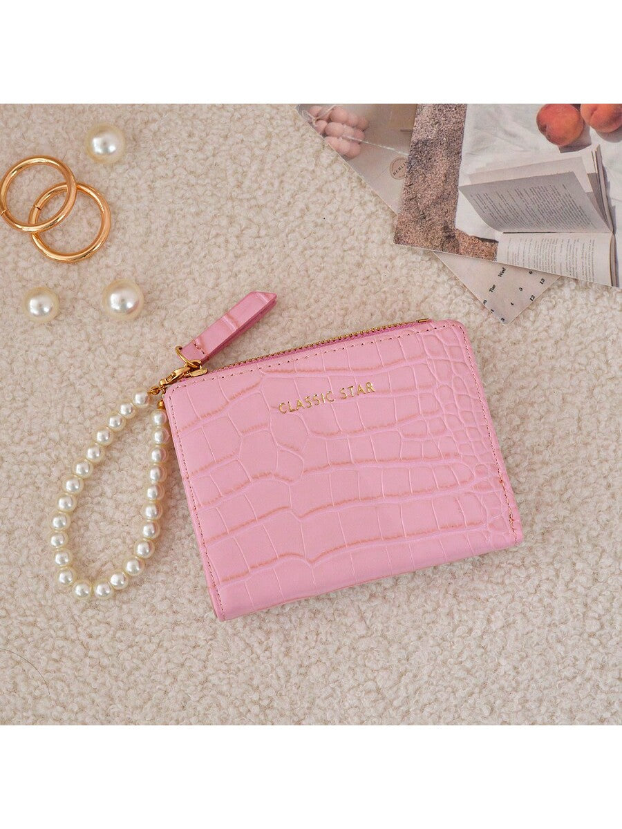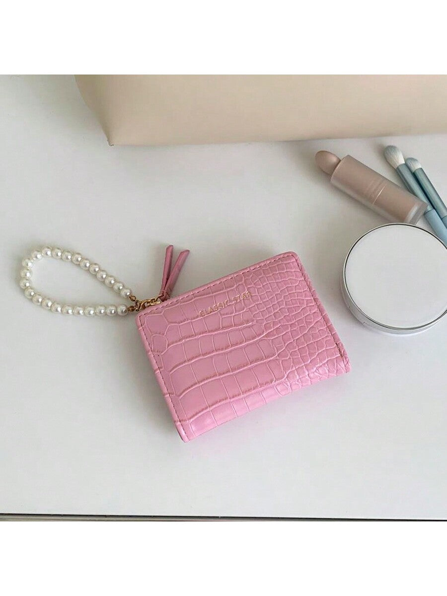 BELLAVOG Ins Simple Korean Fashion Alligator Textured Faux Pearl Chain Folding Coin Women Wallet Birthday Pink Bag Christmas Gifts Gift Thanksgiving For Women Wallet Purse Wallet Small Wallet