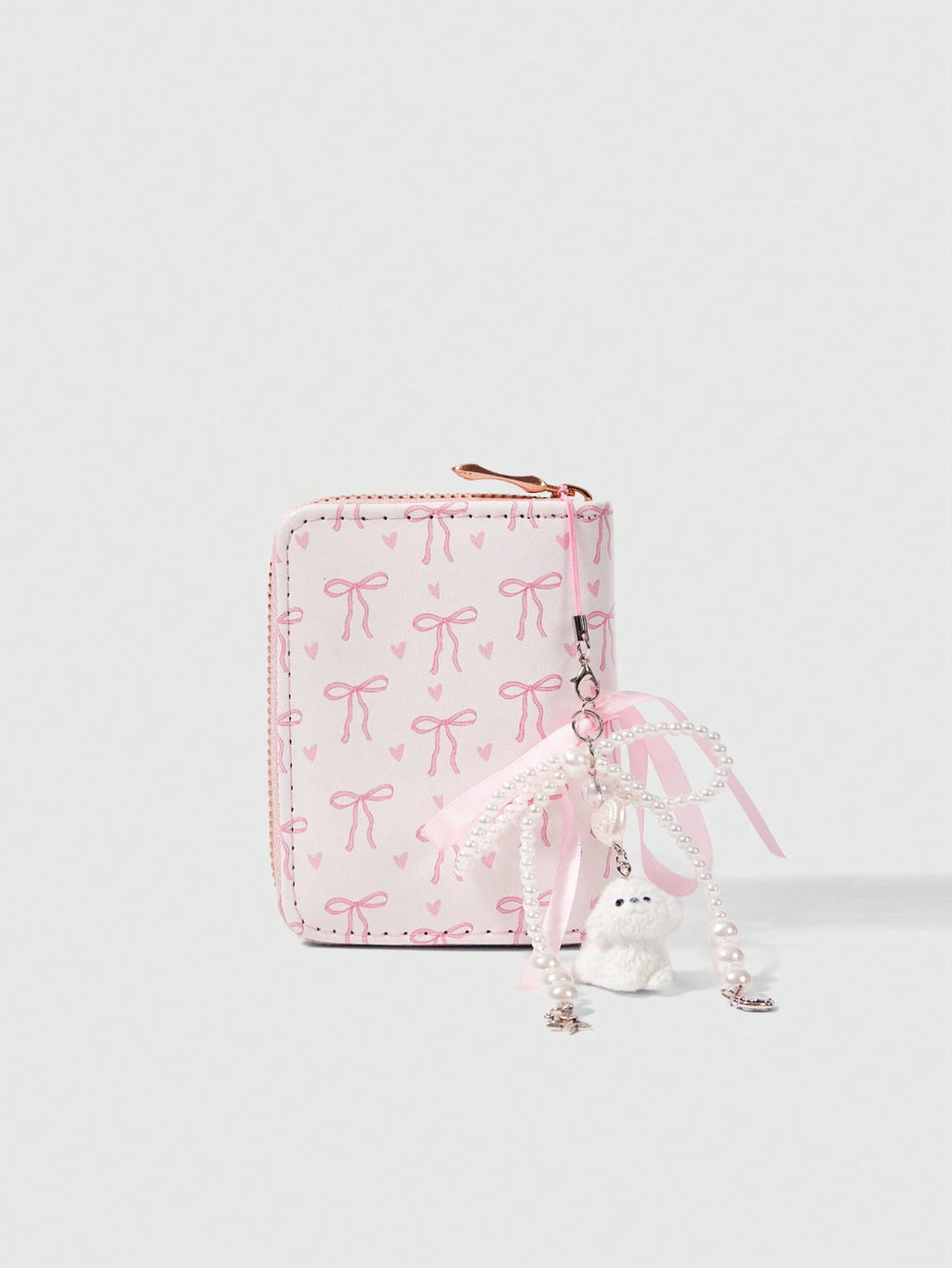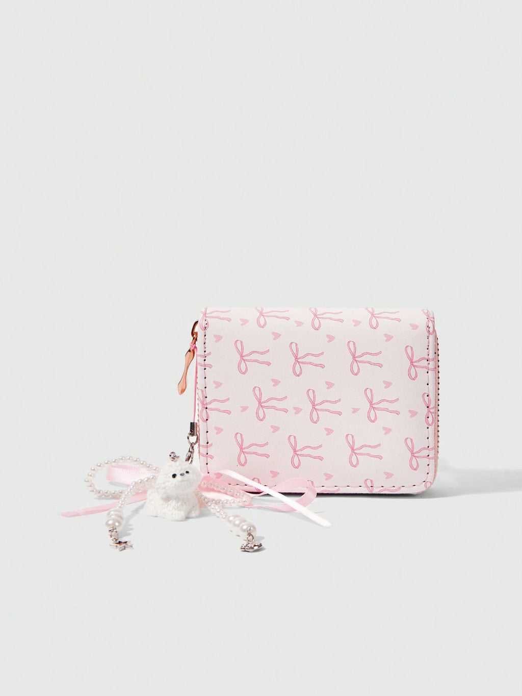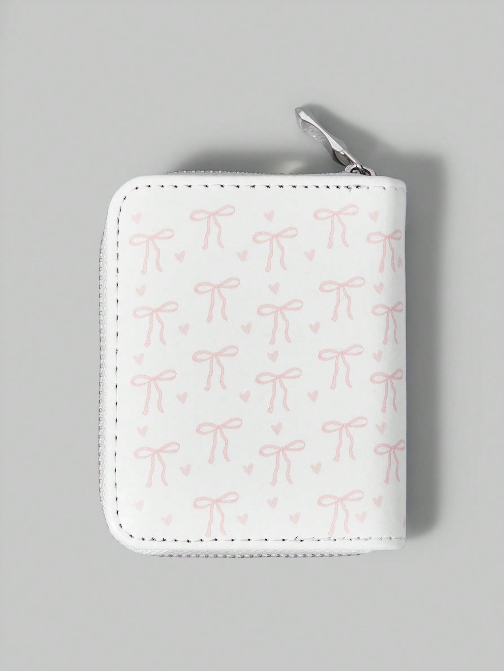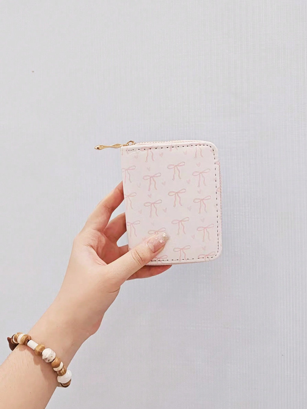 BELLAVOG Kawaii White Base With All-Over Pink Bow Print Short Wallet, Creative Multi-Functional Card Holder