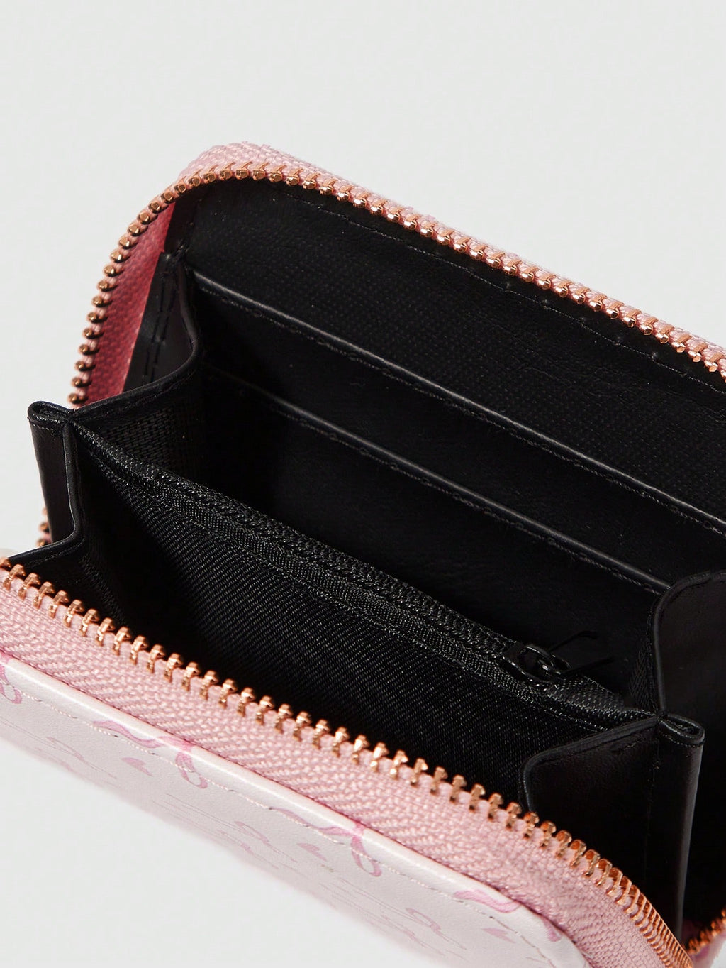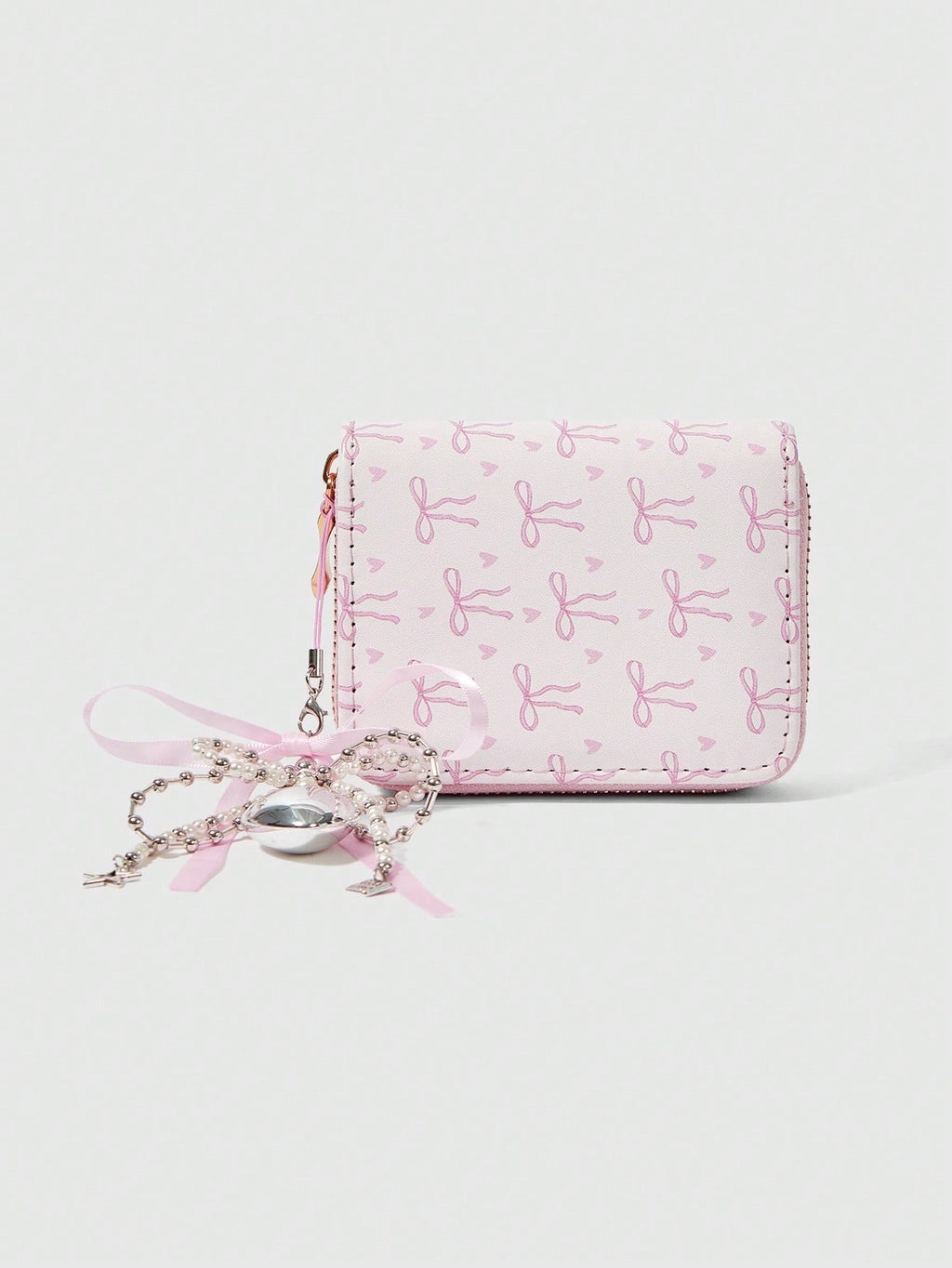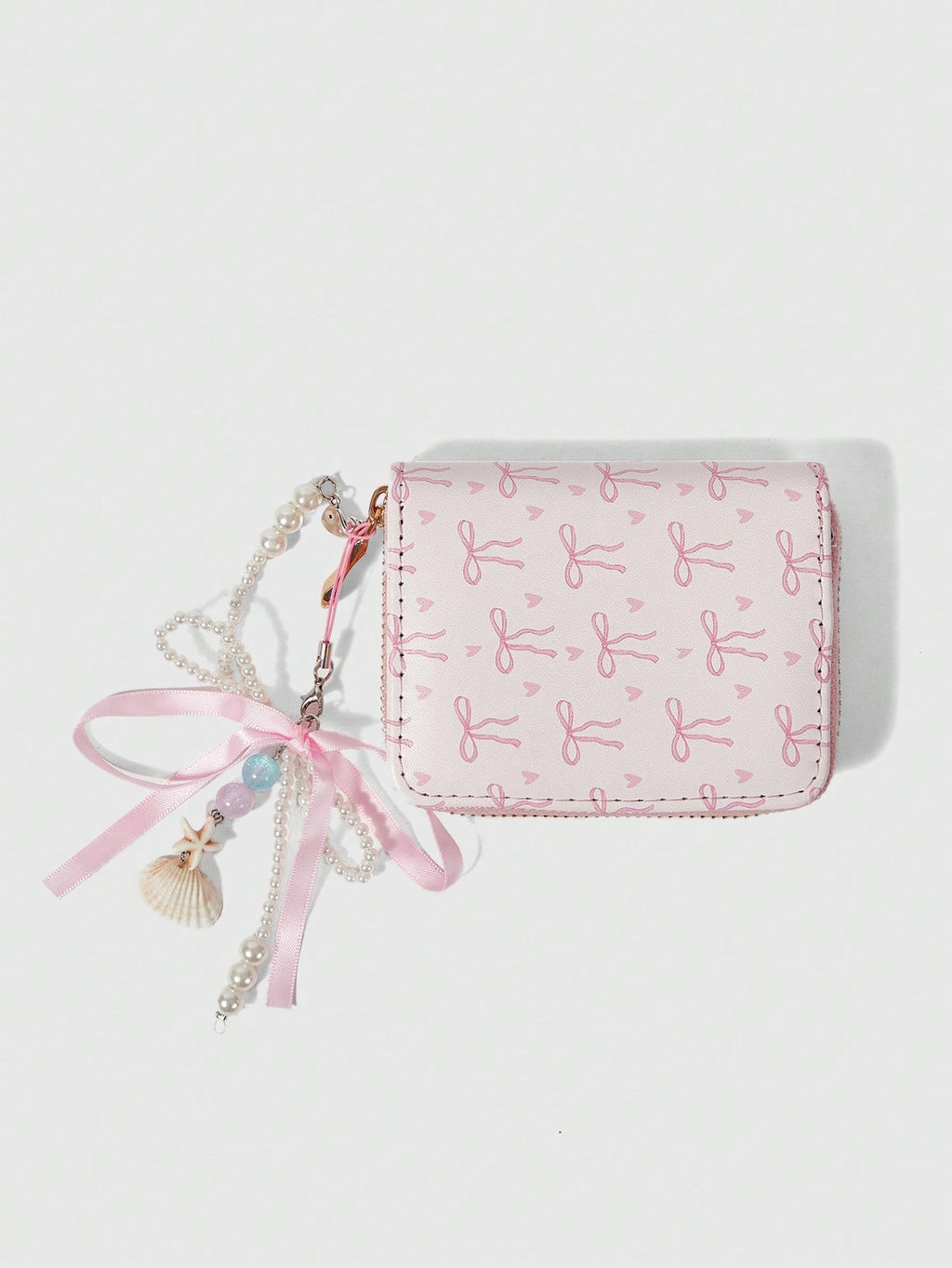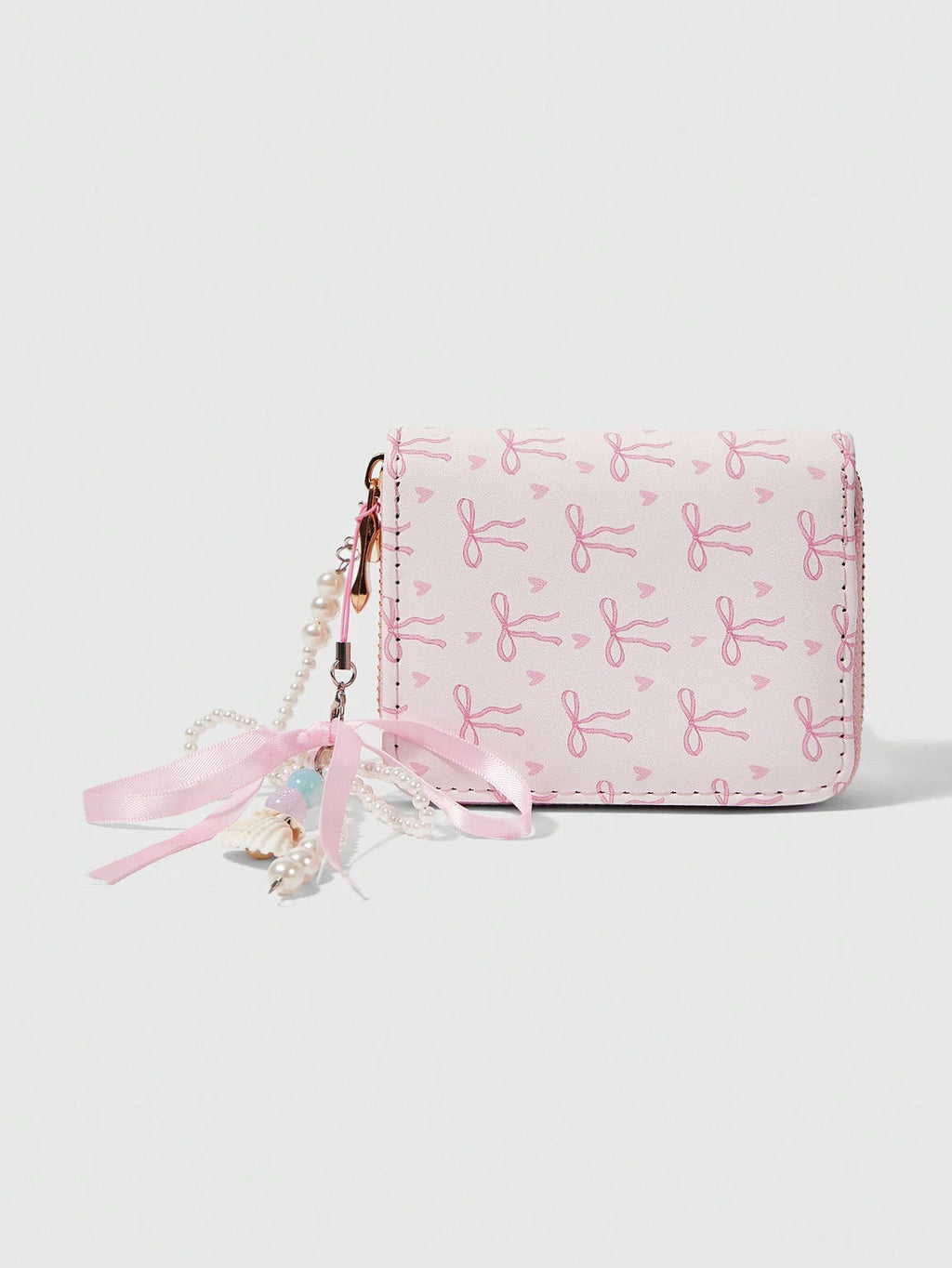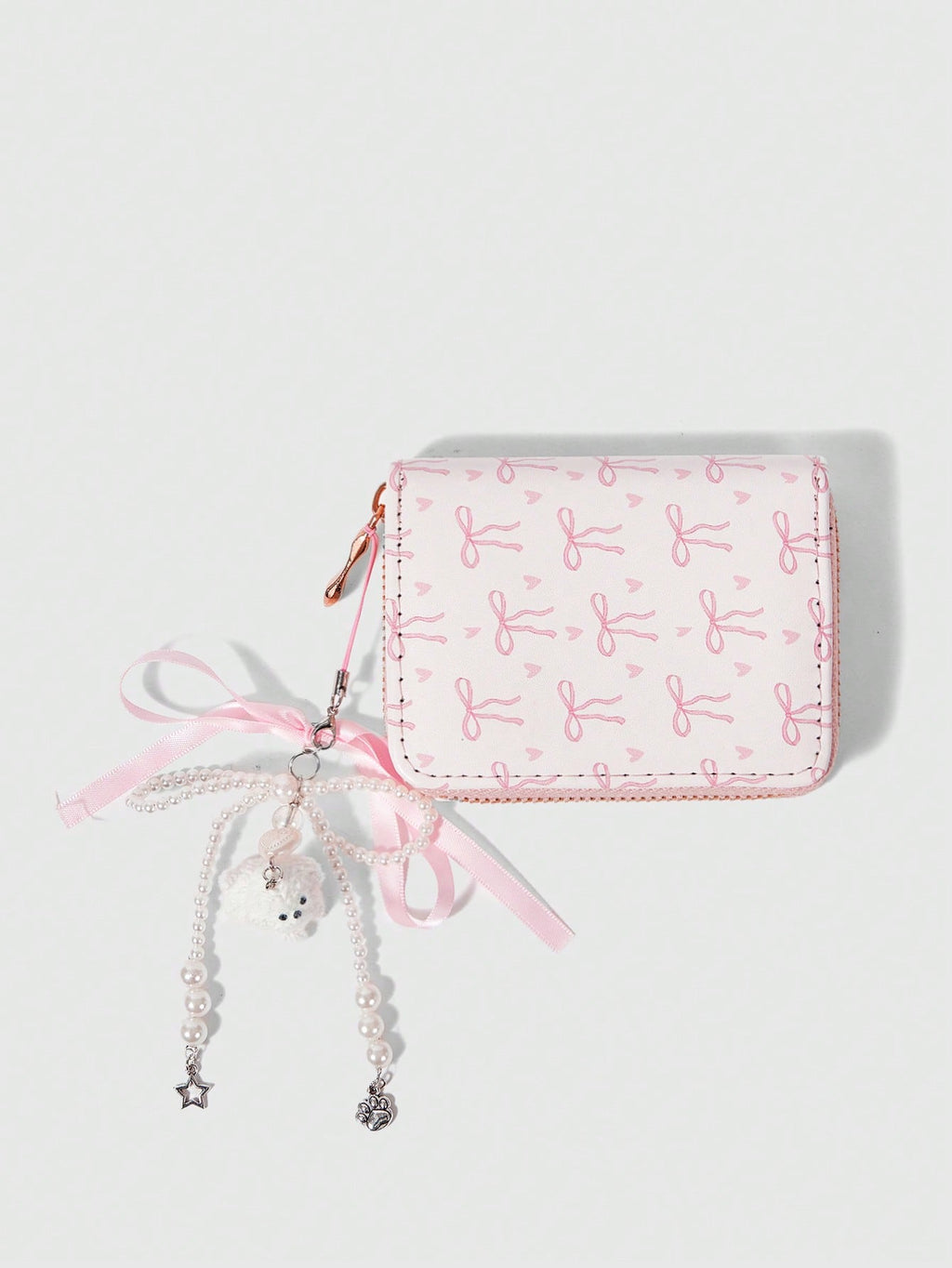 BELLAVOG Kawaii White Base With All-Over Pink Bow Print Short Wallet, Creative Multi-Functional Card Holder