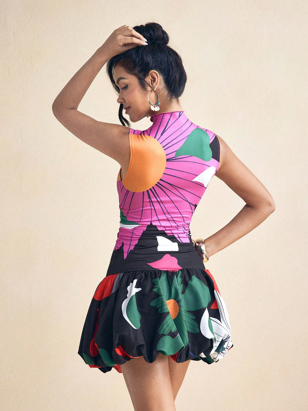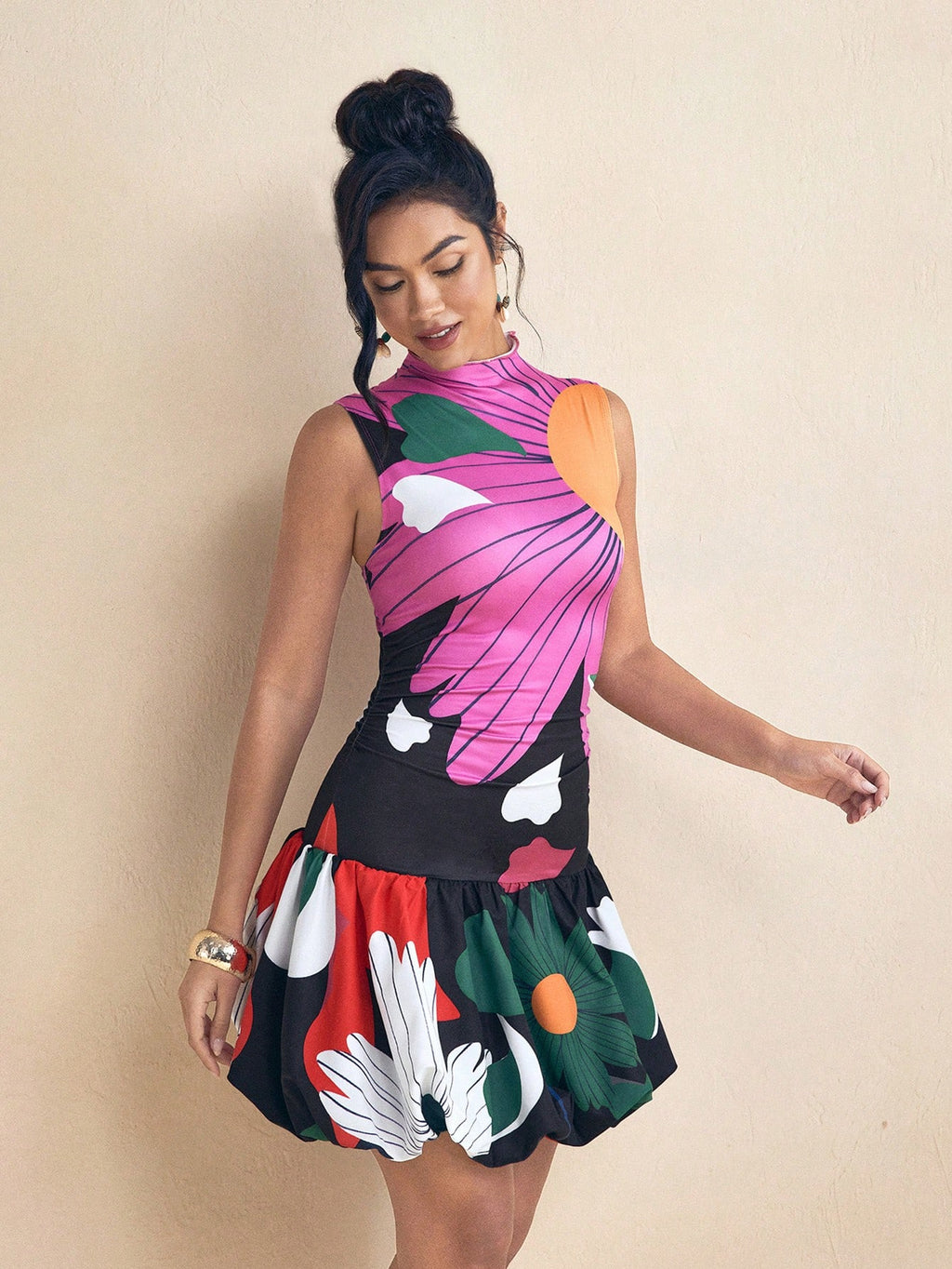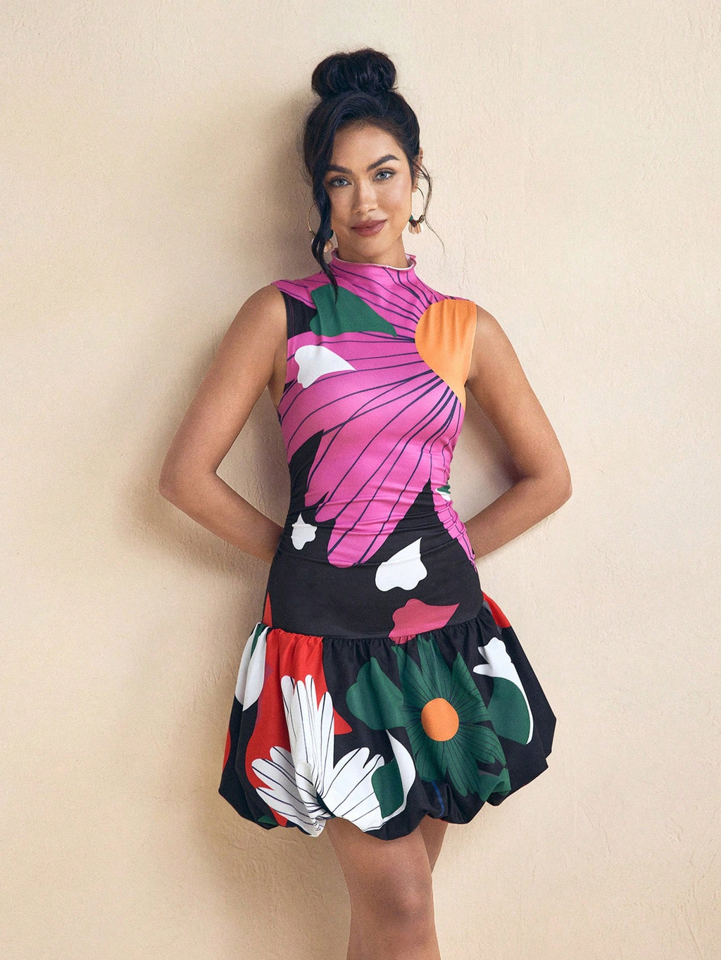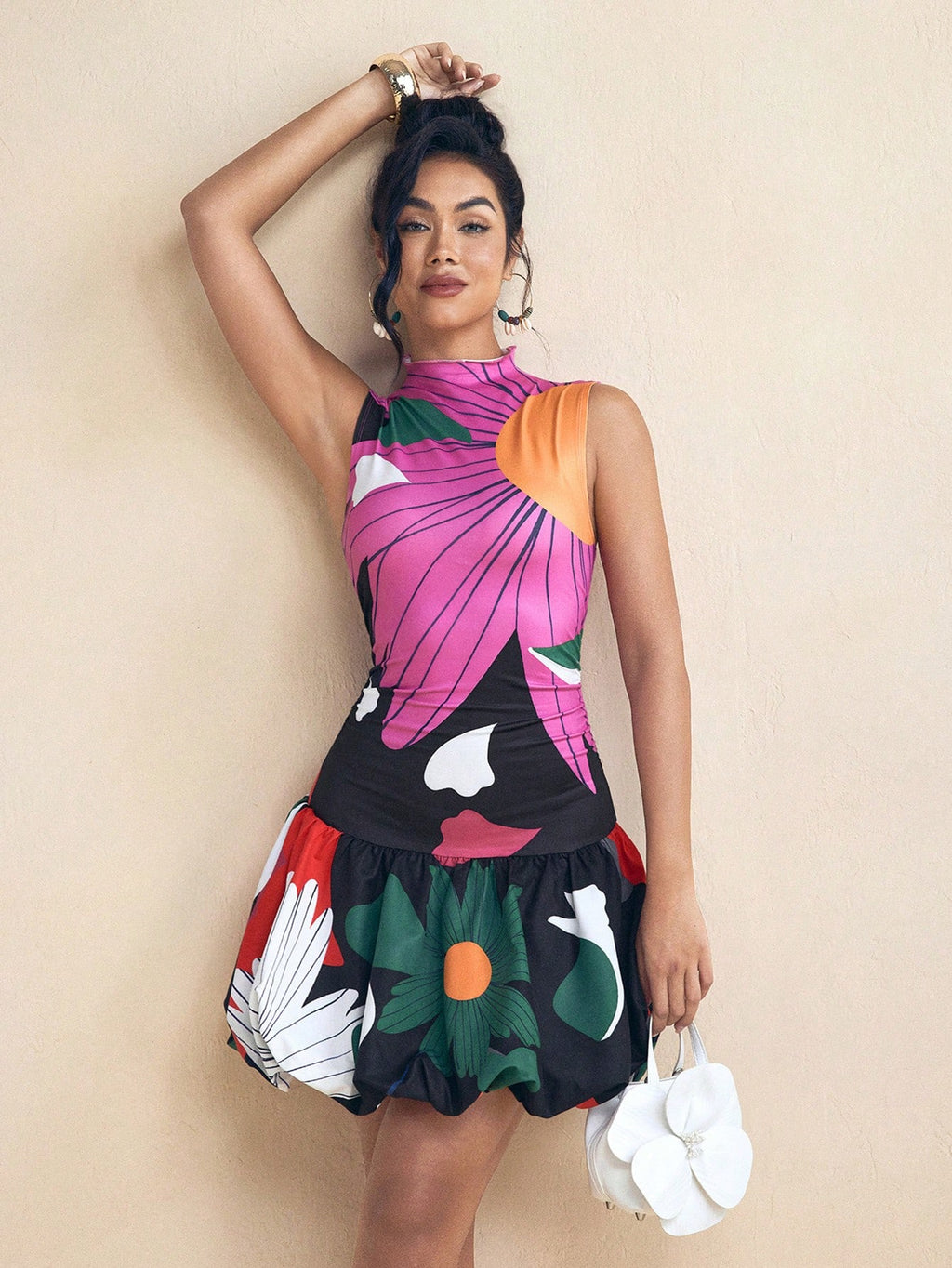 BELLAVOG Multicolor Floral Print Mock Neck Ball Skirt Sleeveless Mini Dress For Summer Holiday Vacation