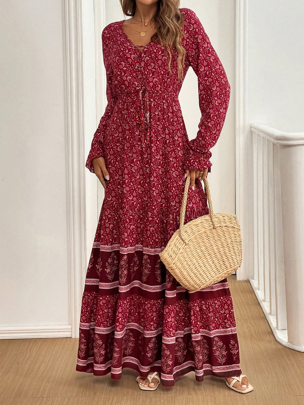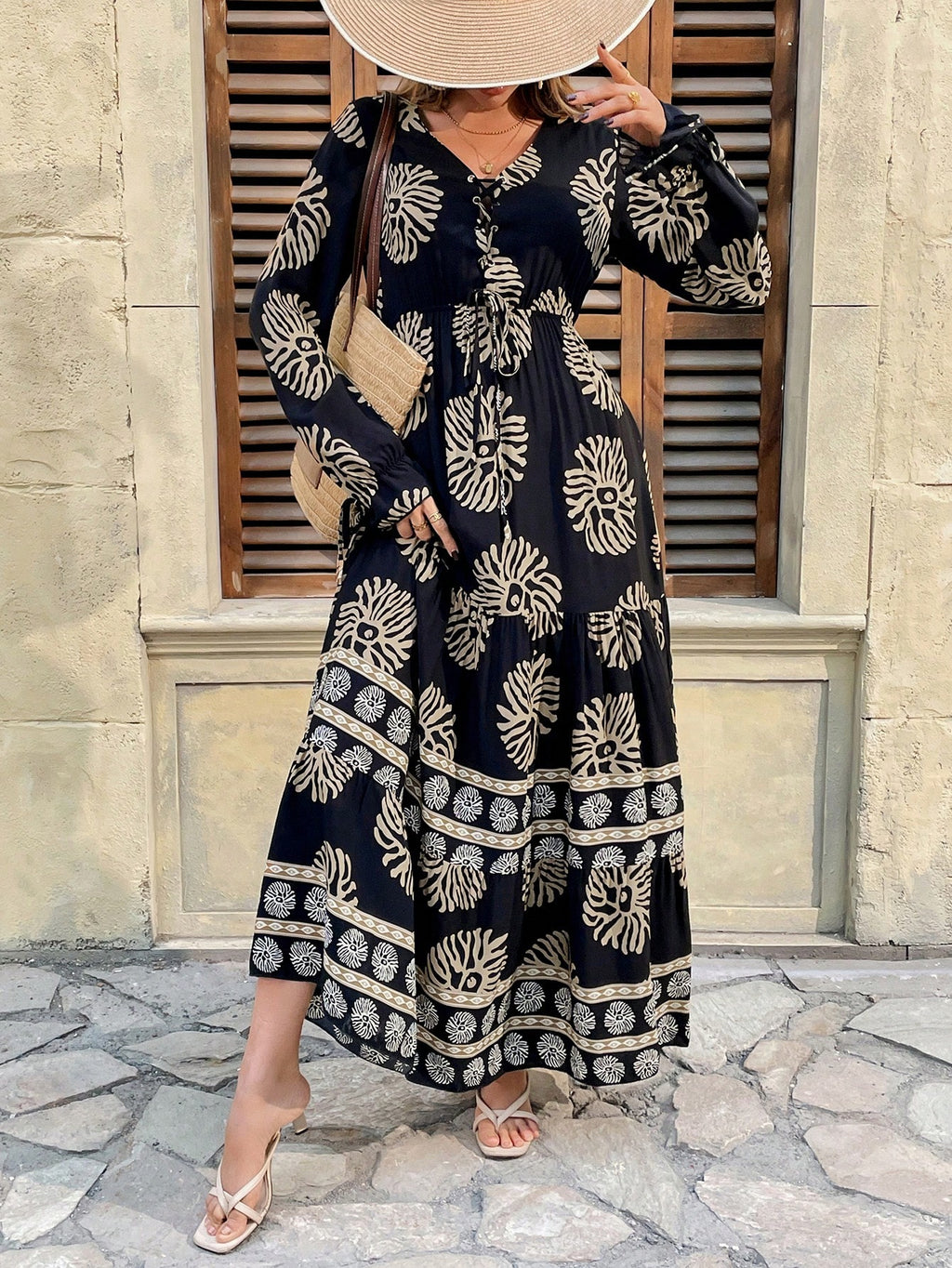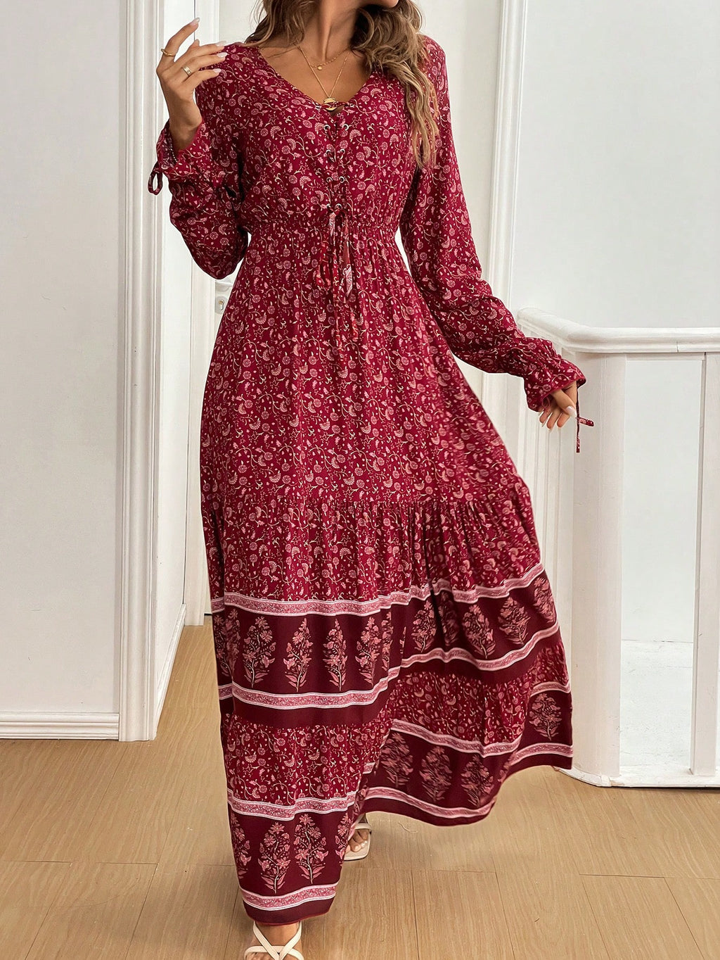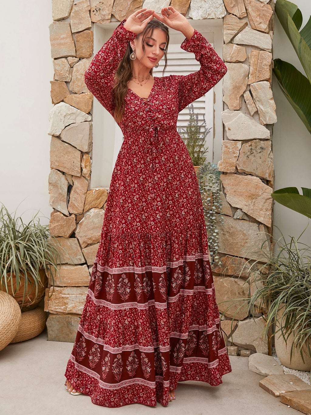 BELLAVOG Mulvari Front Lace Up Long Sleeve Pleated All-Over Print Maxi Casual Dress For New Year Clothes