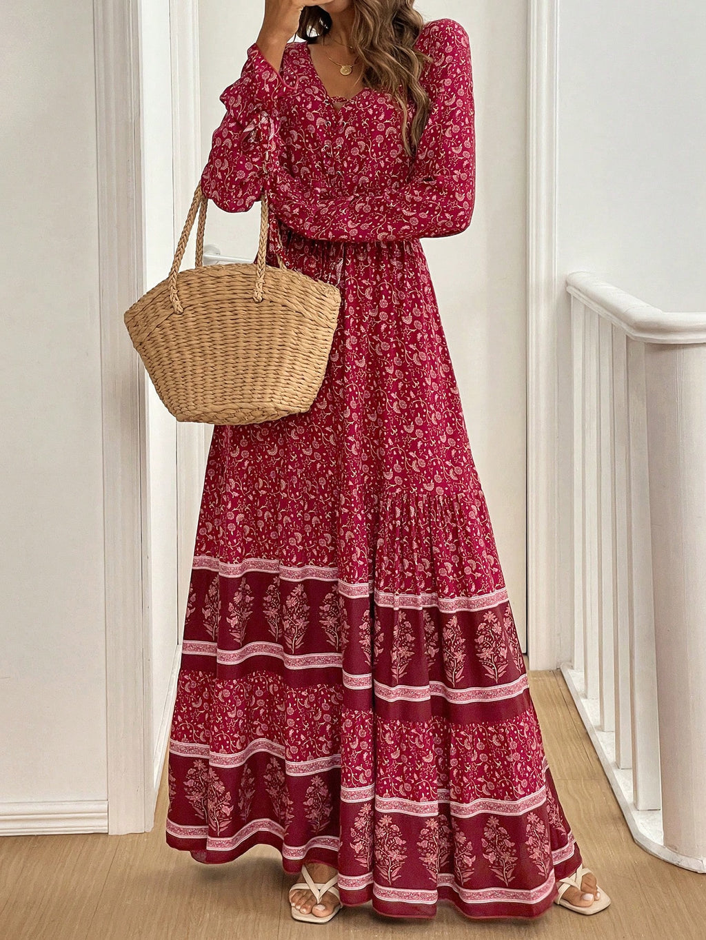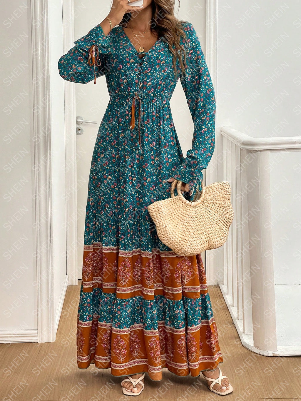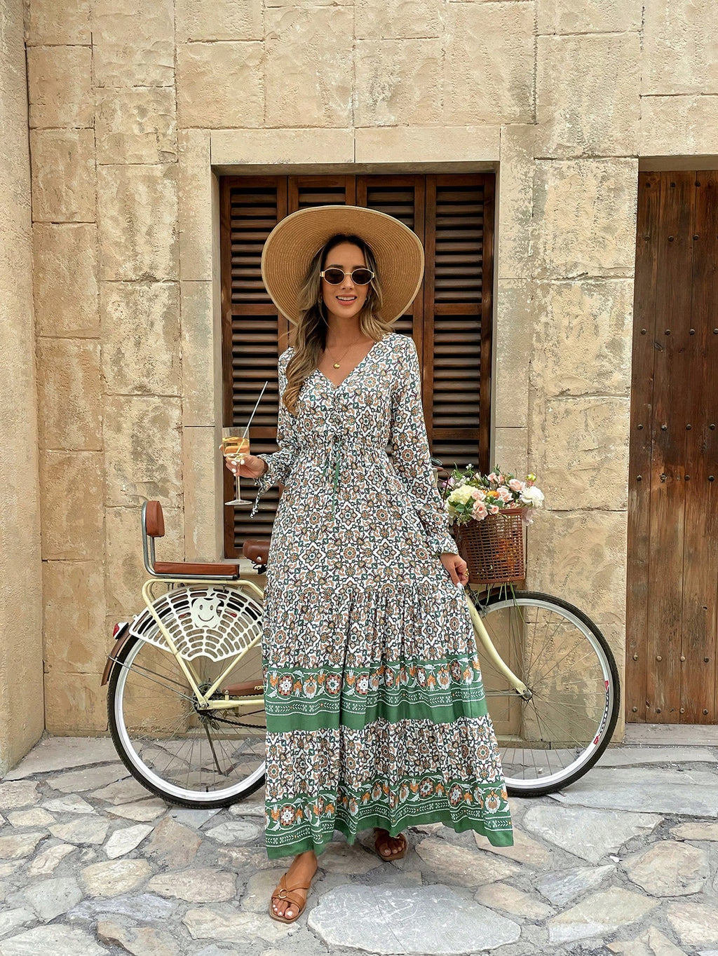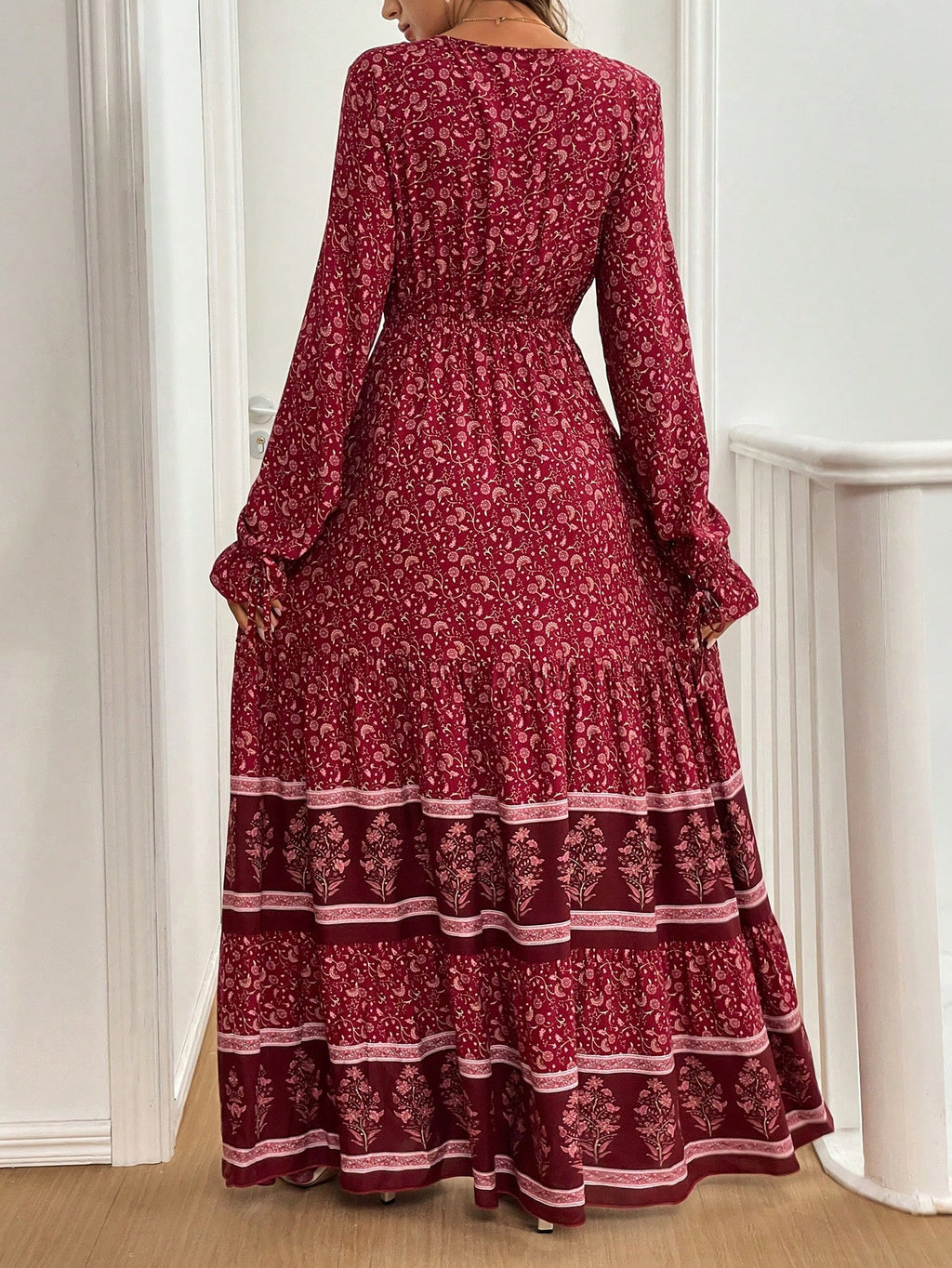 BELLAVOG Mulvari Front Lace Up Long Sleeve Pleated All-Over Print Maxi Casual Dress For New Year Clothes