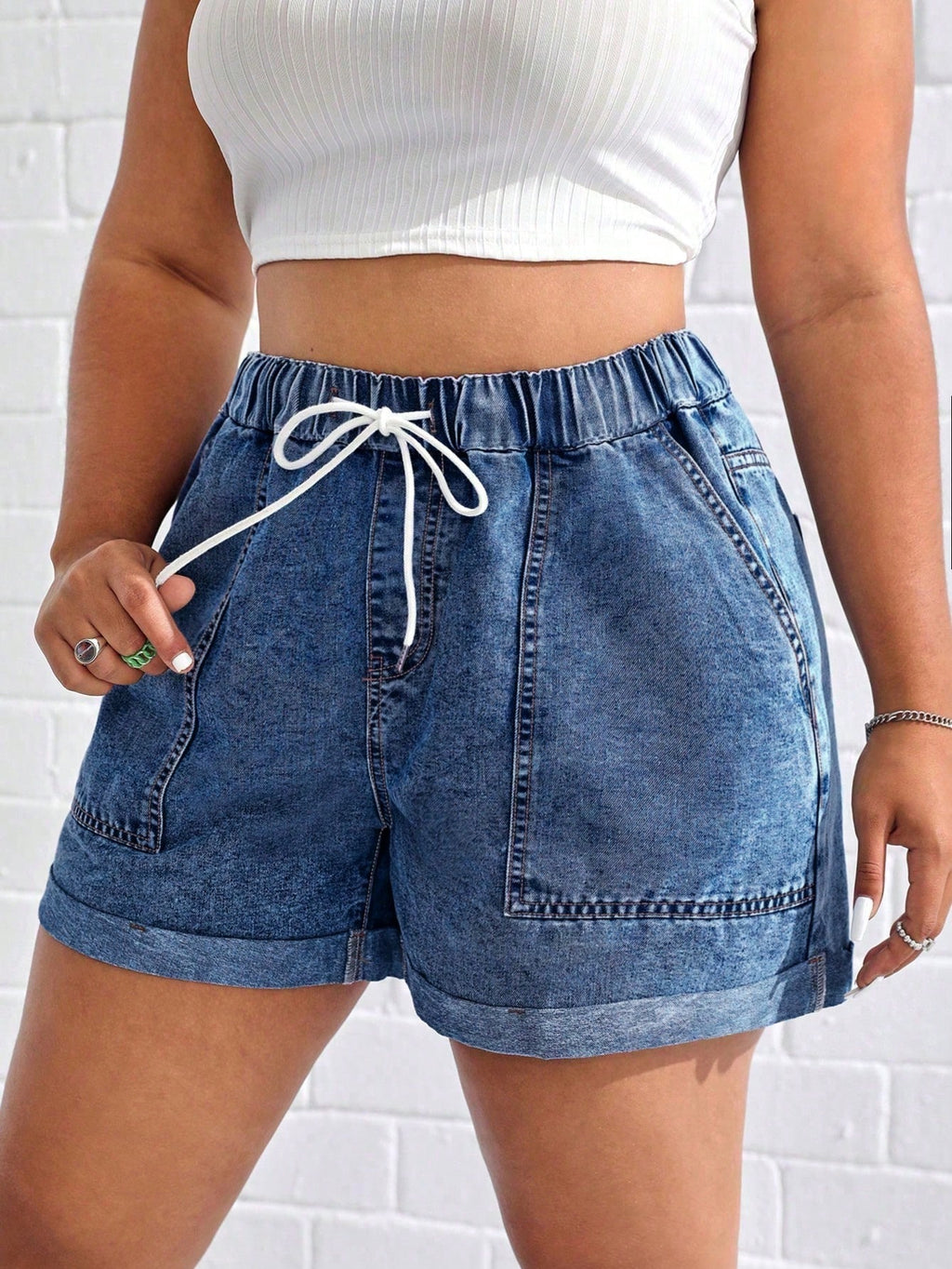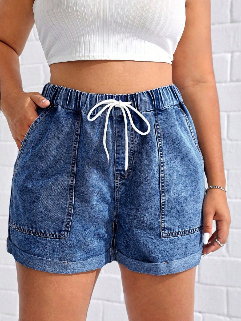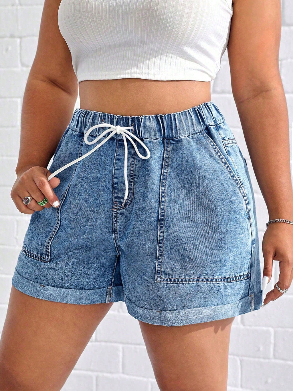 BELLAVOG Plus Size Casual Washed Drawstring Waist Denim Shorts