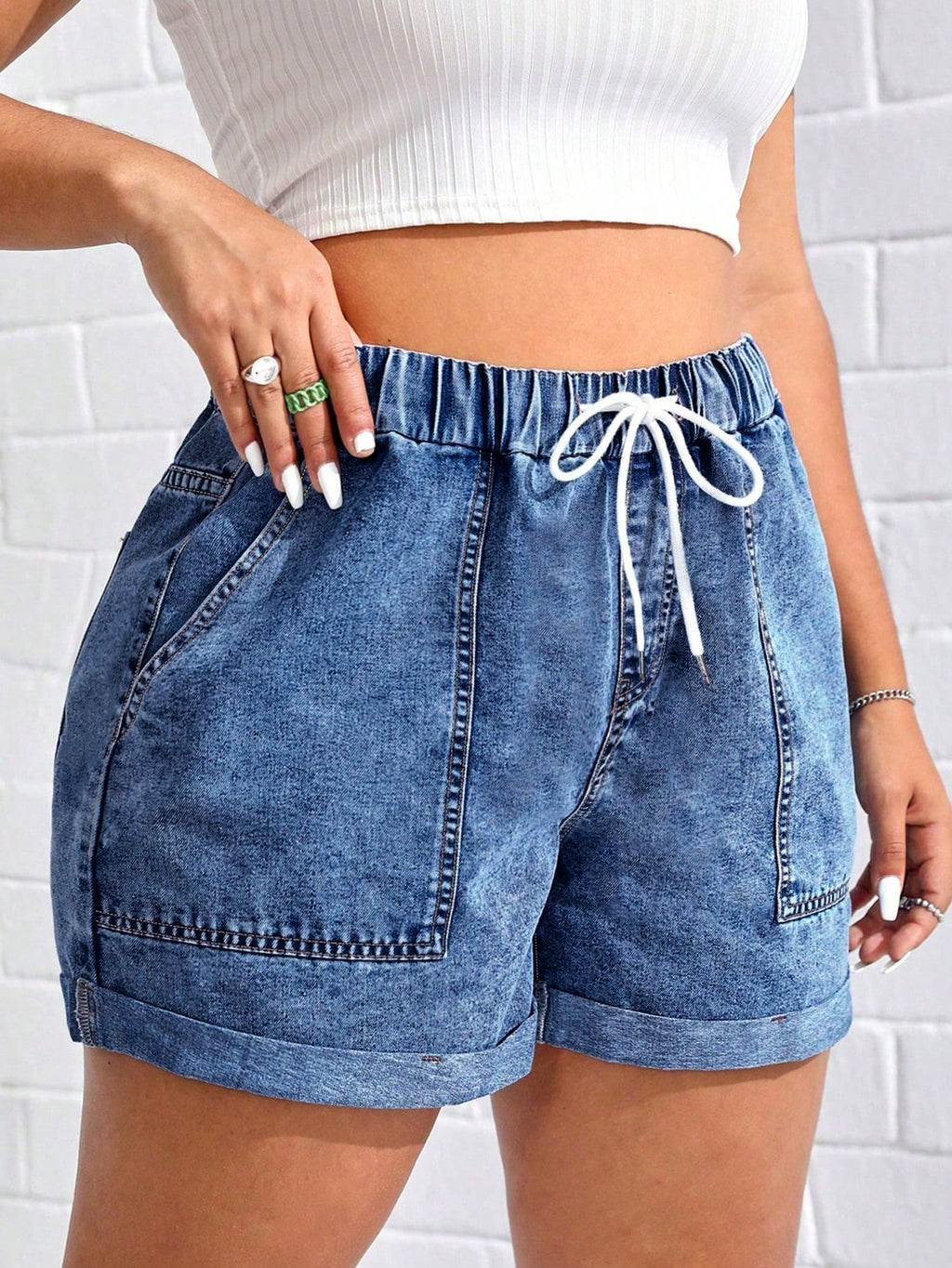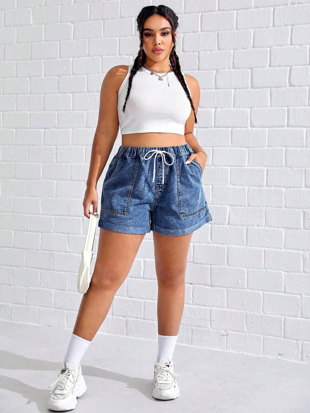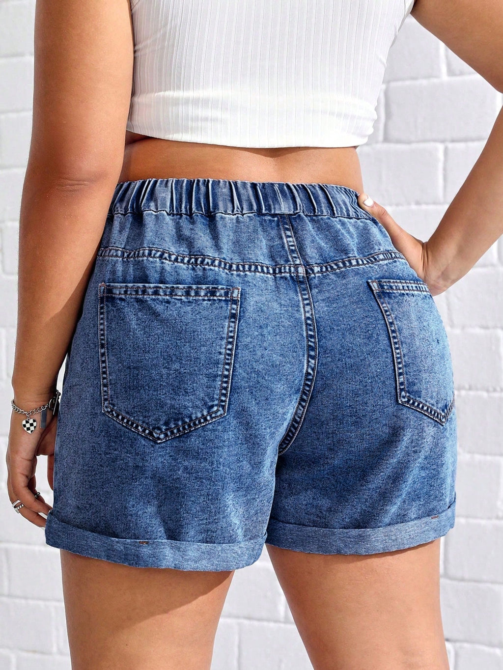 BELLAVOG Plus Size Casual Washed Drawstring Waist Denim Shorts