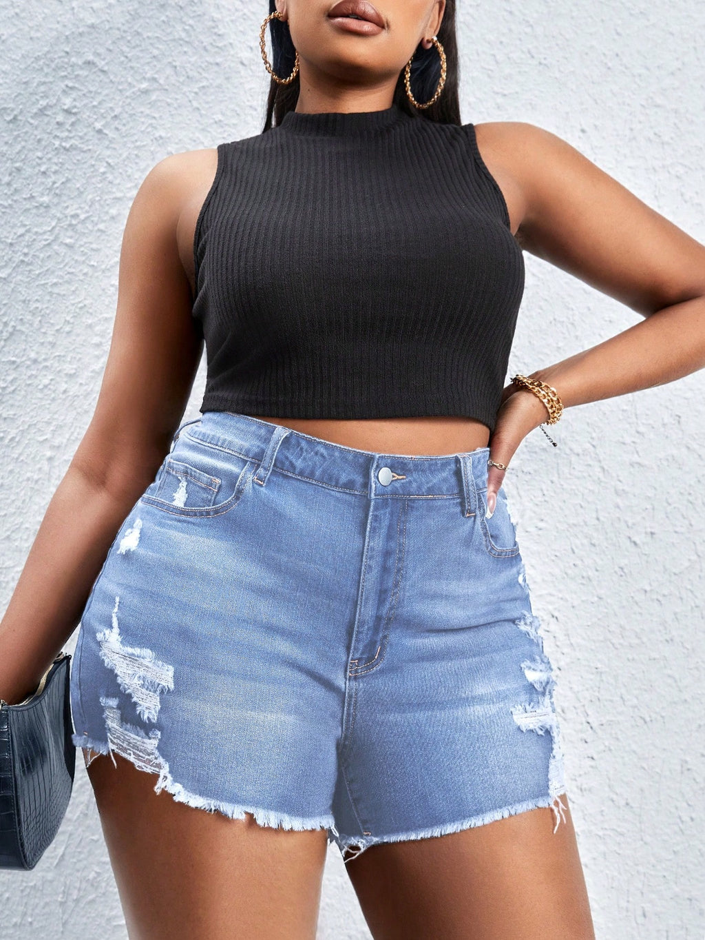 BELLAVOG Plus Size Distressed Frayed Hem Denim Shorts, Summer Casual