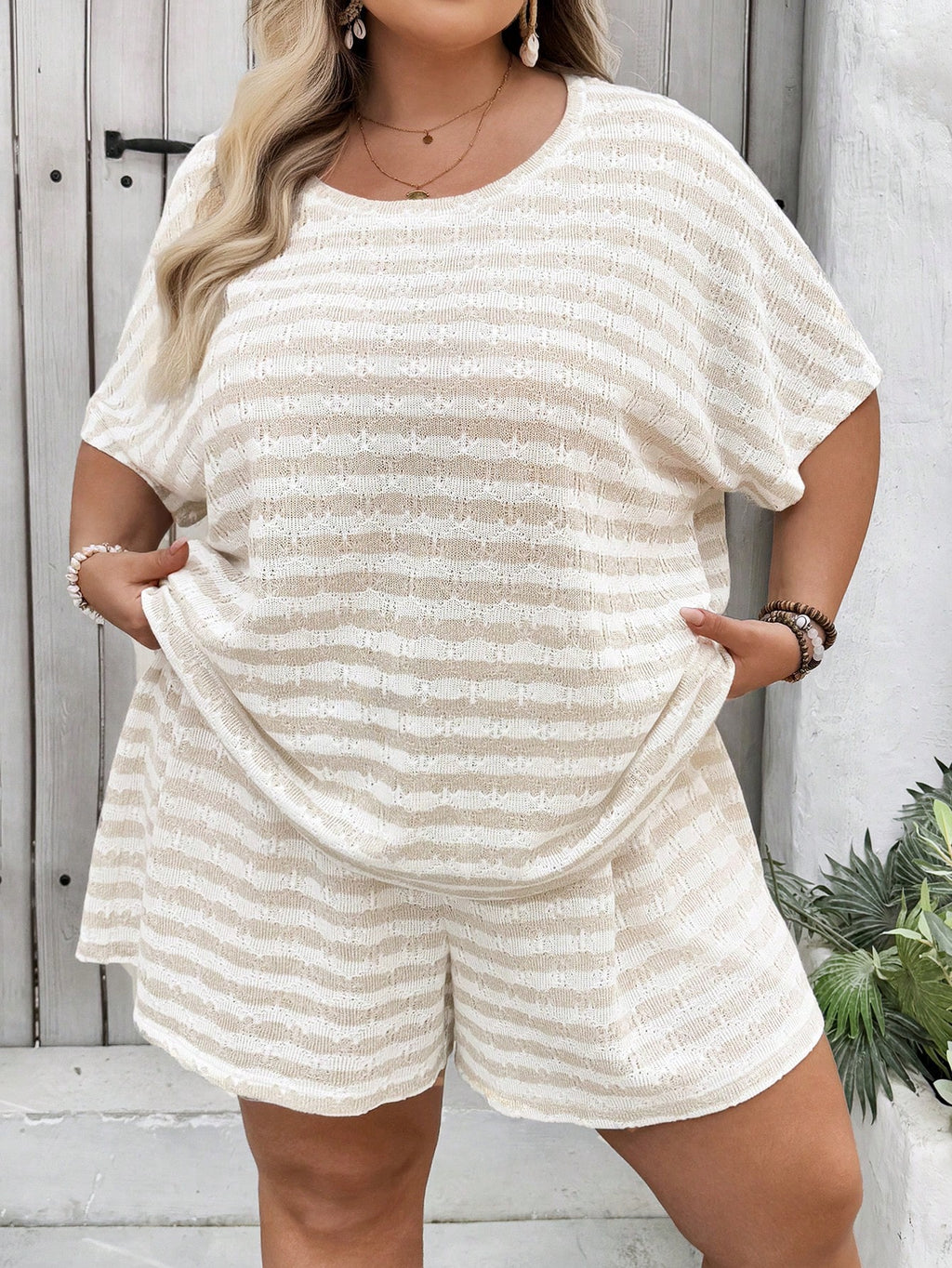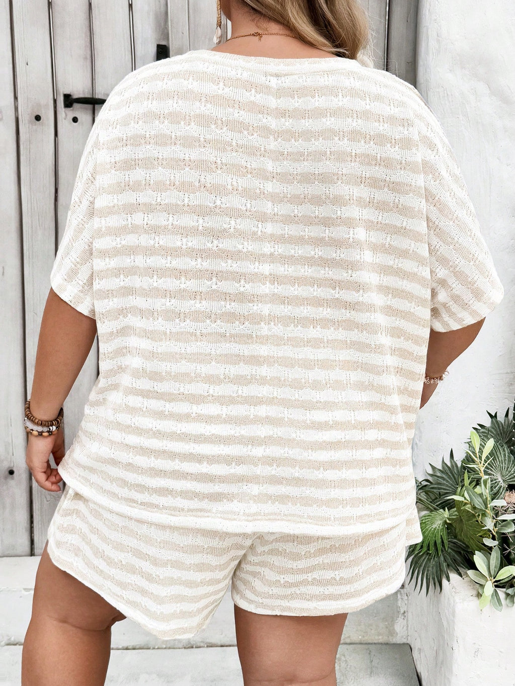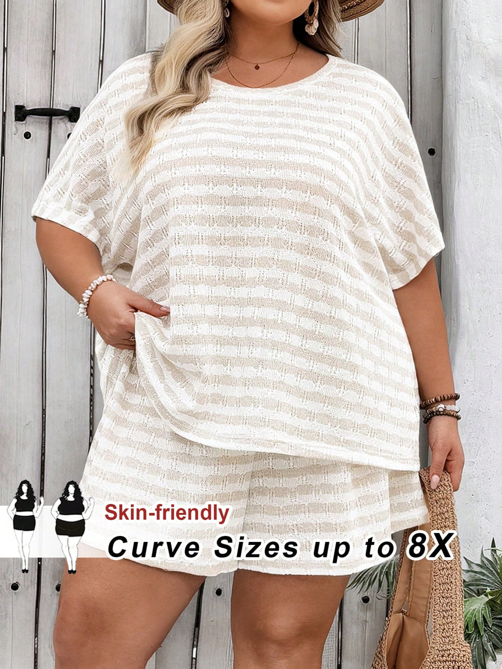 BELLAVOG Plus Size Women Summer Casual Striped Knit Loose 2 Pieces Set, T-Shirt And Shorts, Suitable For Summer, Travel, Vacation And Leisure Wear
