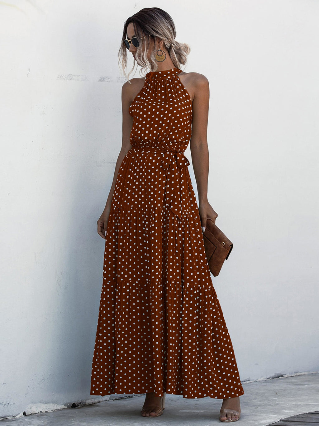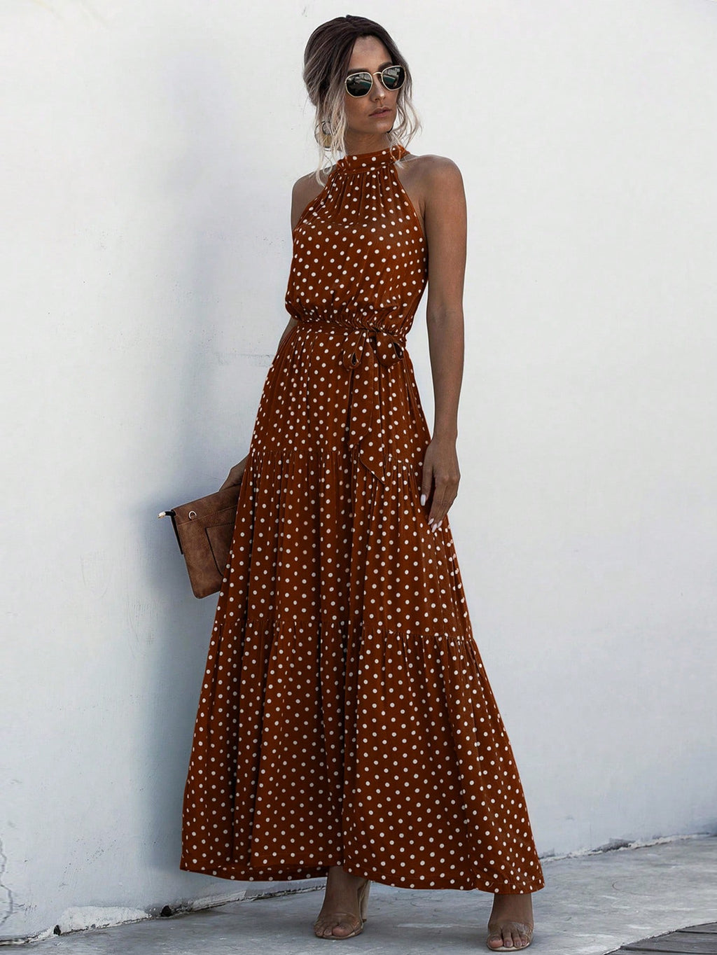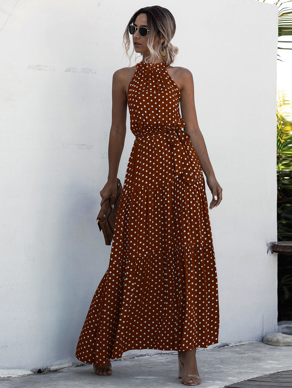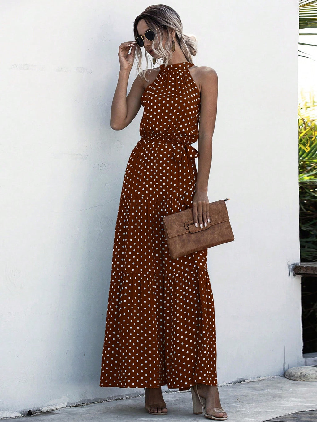 BELLAVOG Polka Dot Print Ruffle Hem Belted Halter Dress Maxi Women Outfit