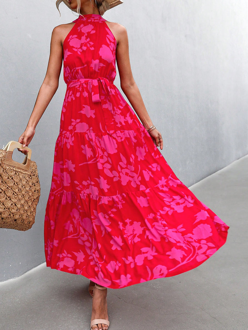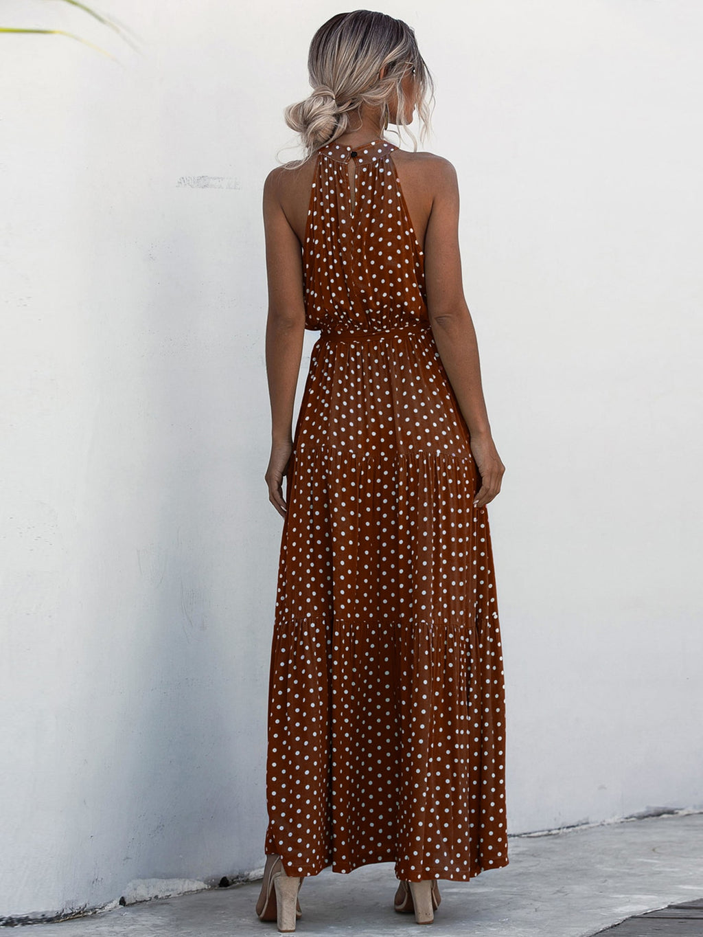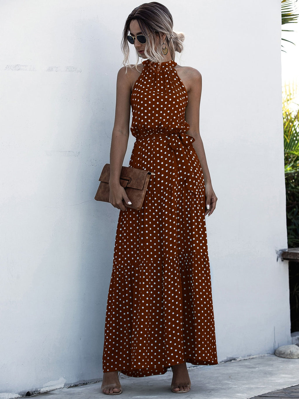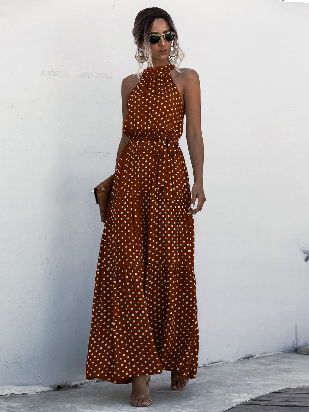 BELLAVOG Polka Dot Print Ruffle Hem Belted Halter Dress Maxi Women Outfit