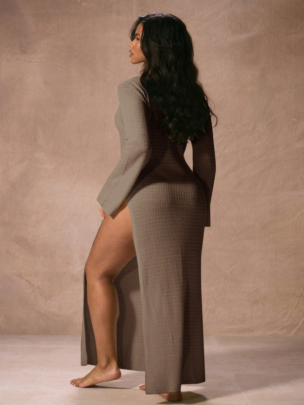 BELLAVOG Resort Crochet Knit Plunge Neckline Shell Detail Long Sleeve Maxi Dress Beach Swim Cover Up Vacation Spring Summer Elegant