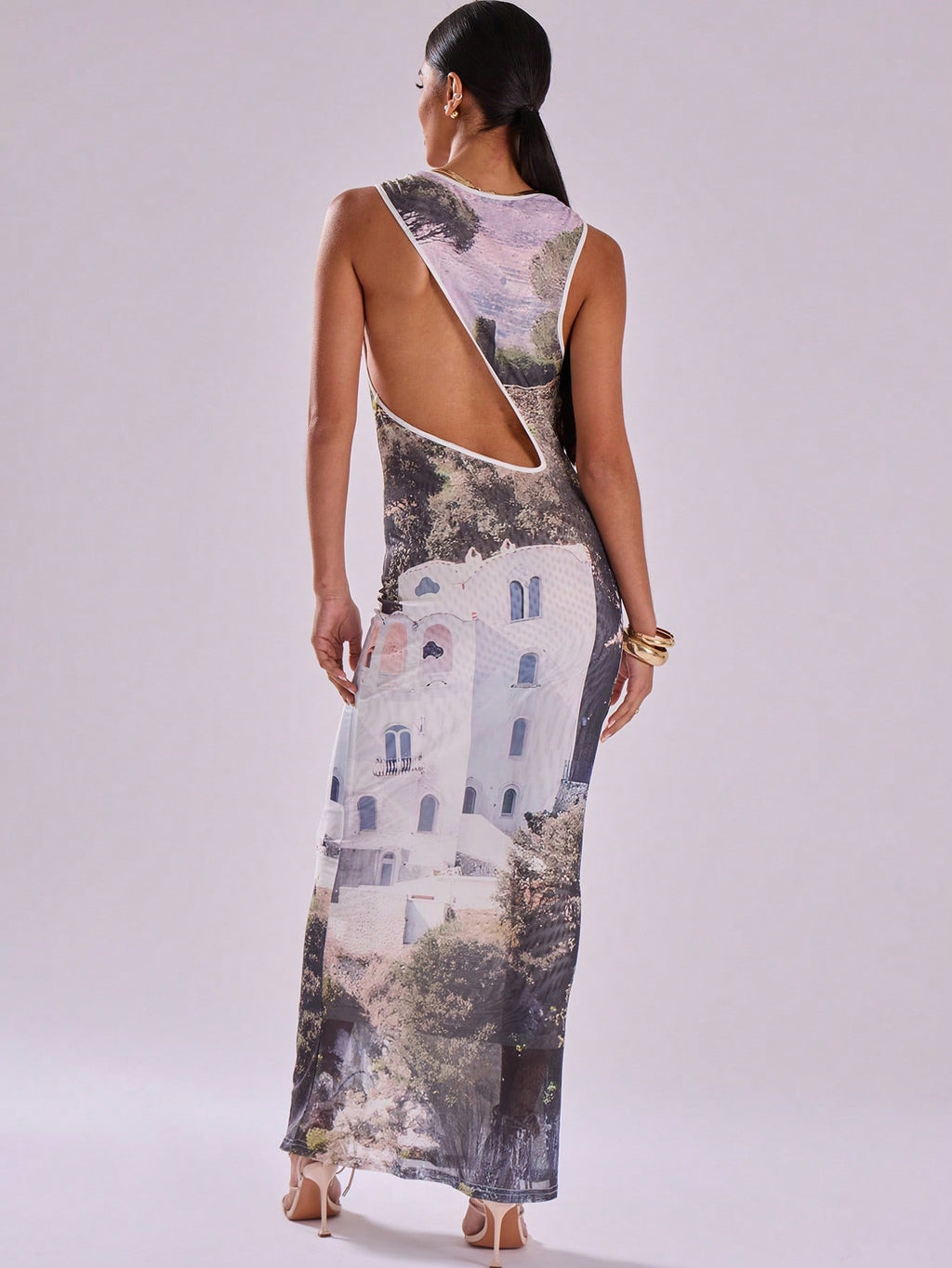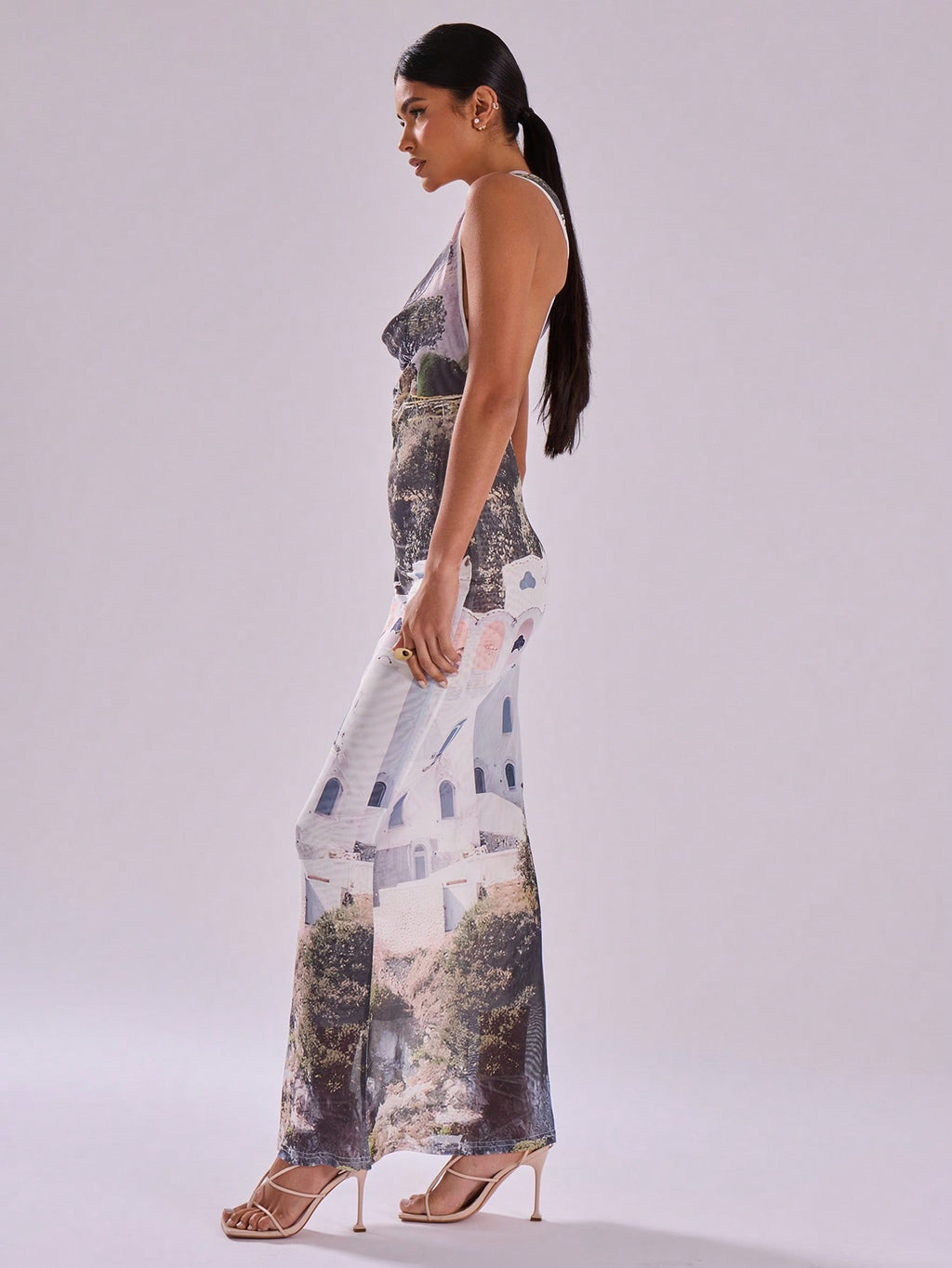 BELLAVOG Sexy Location Print Cowl Neck Column Slim Fit Long Dress Ibiza Fits Boho Spring Vacation Summer Festival