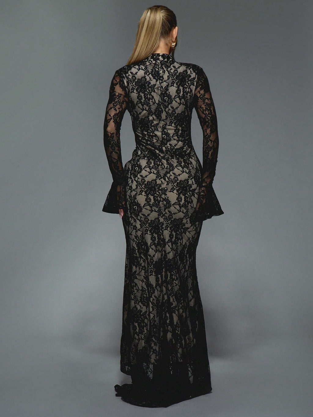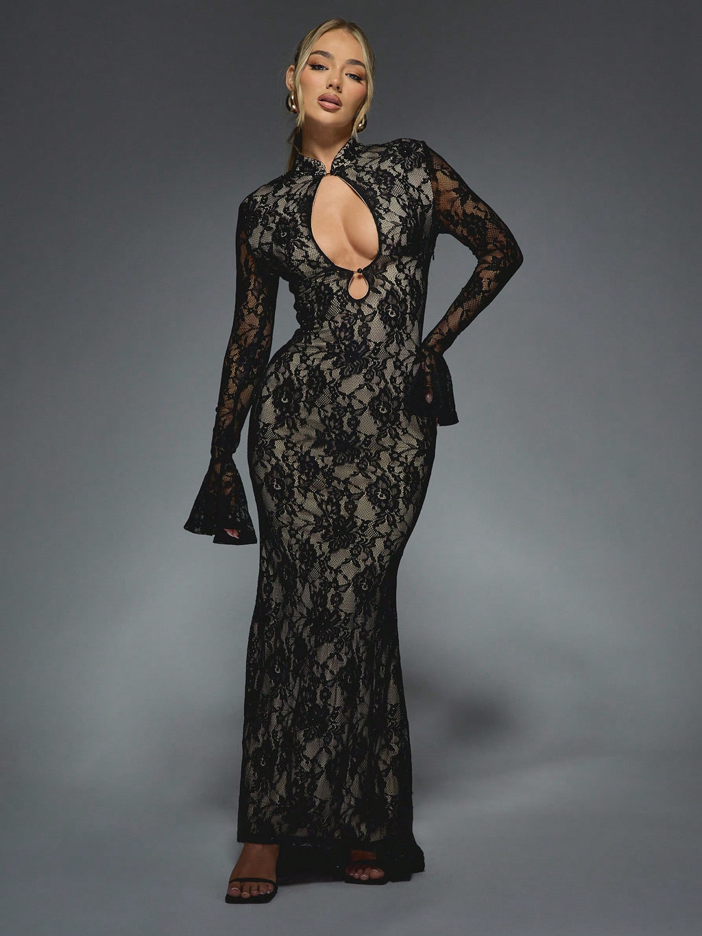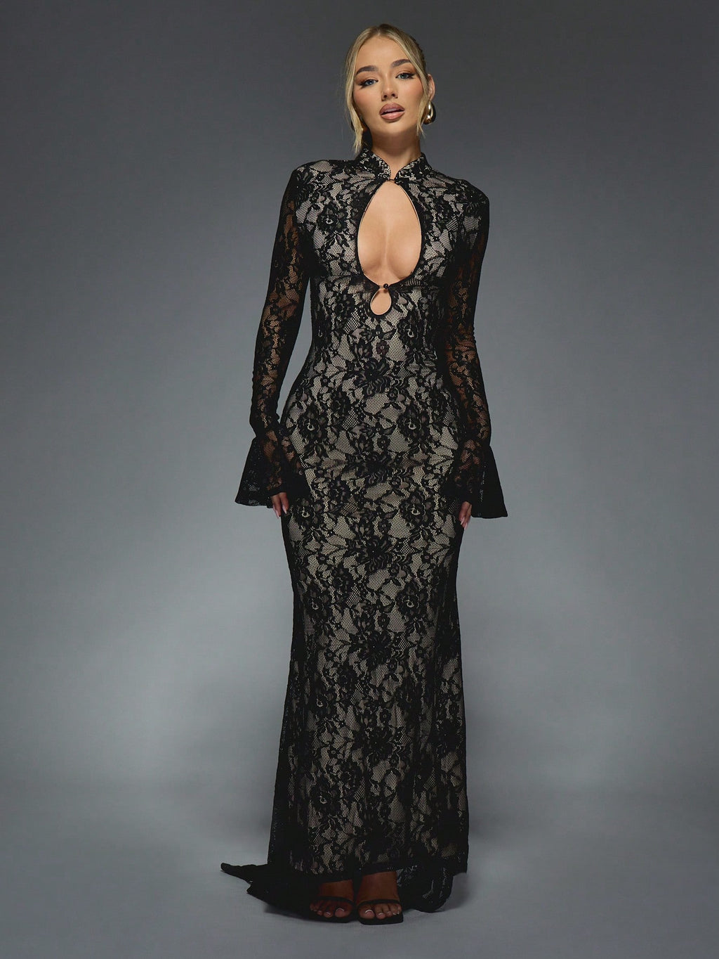 BELLAVOG Sheer Lace Cut-Out High Neck Long Bell Sleeves Floor Length Maxi Dress
