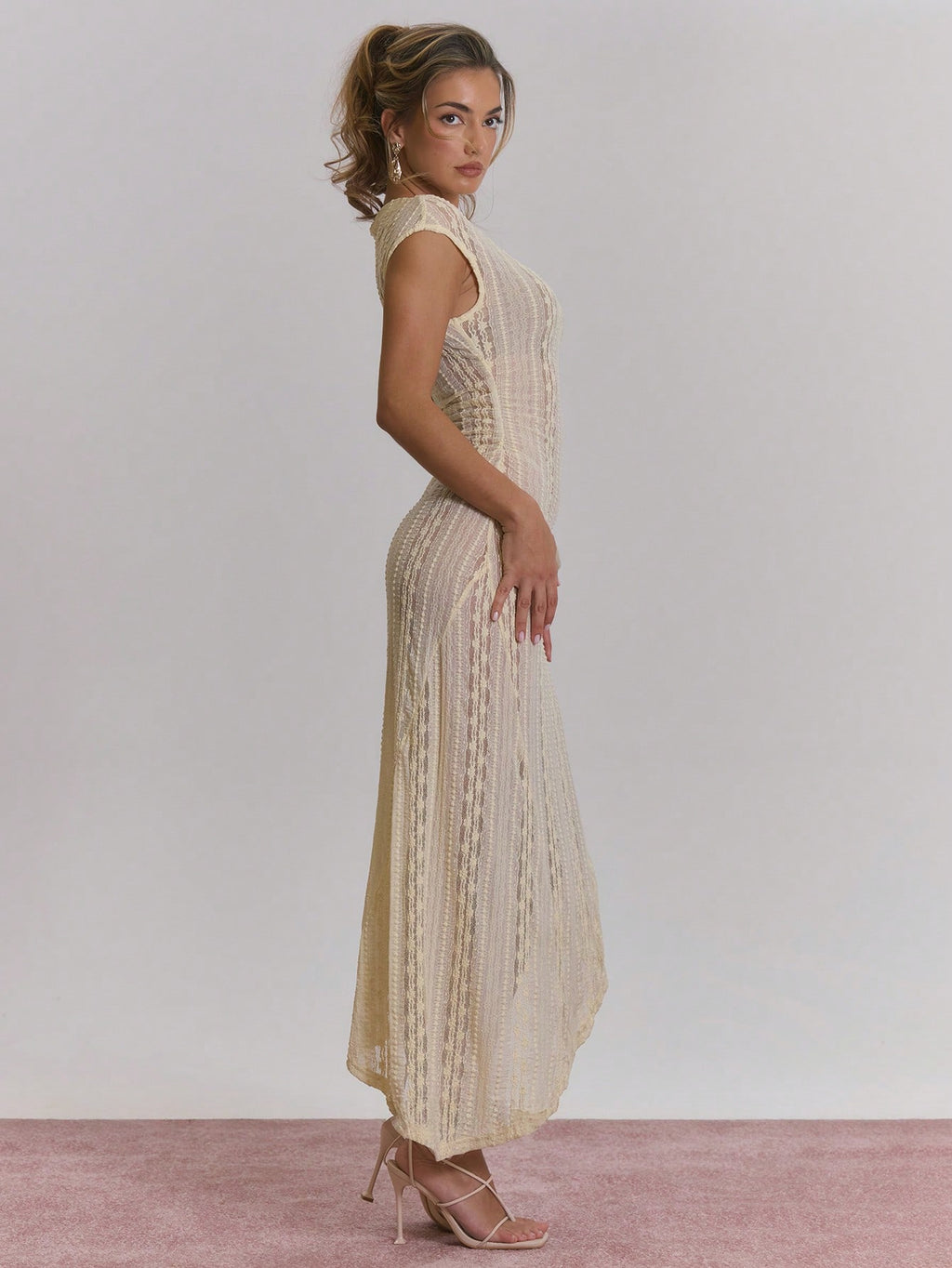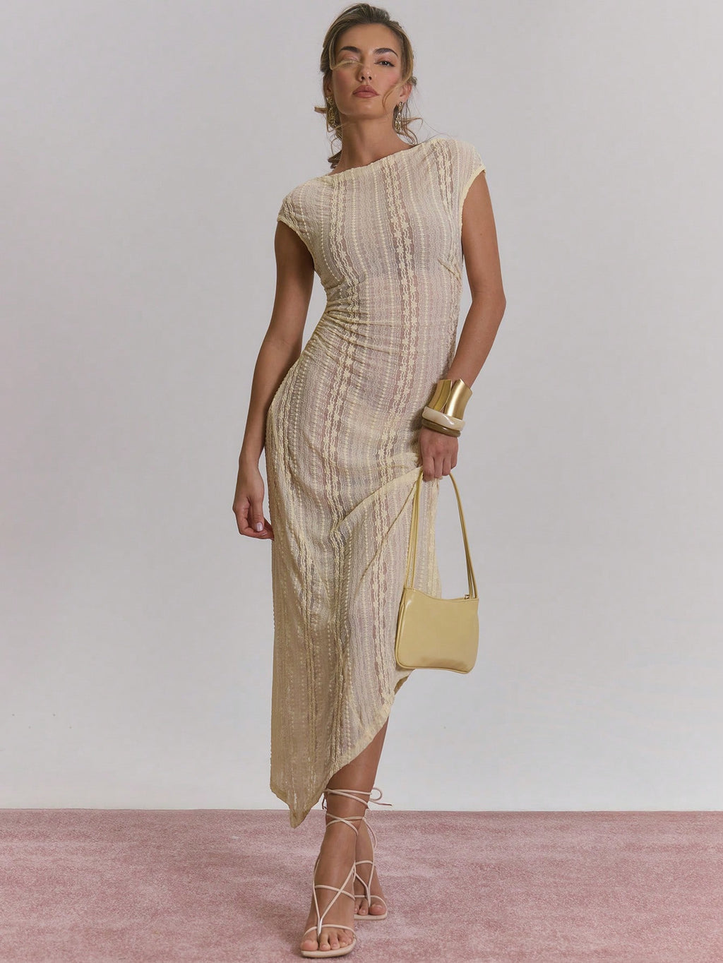 BELLAVOG Slash Neck Asymmetrical Hem Ruched Waist Textured Cap Sleeve Midi Dress For Spring Summer