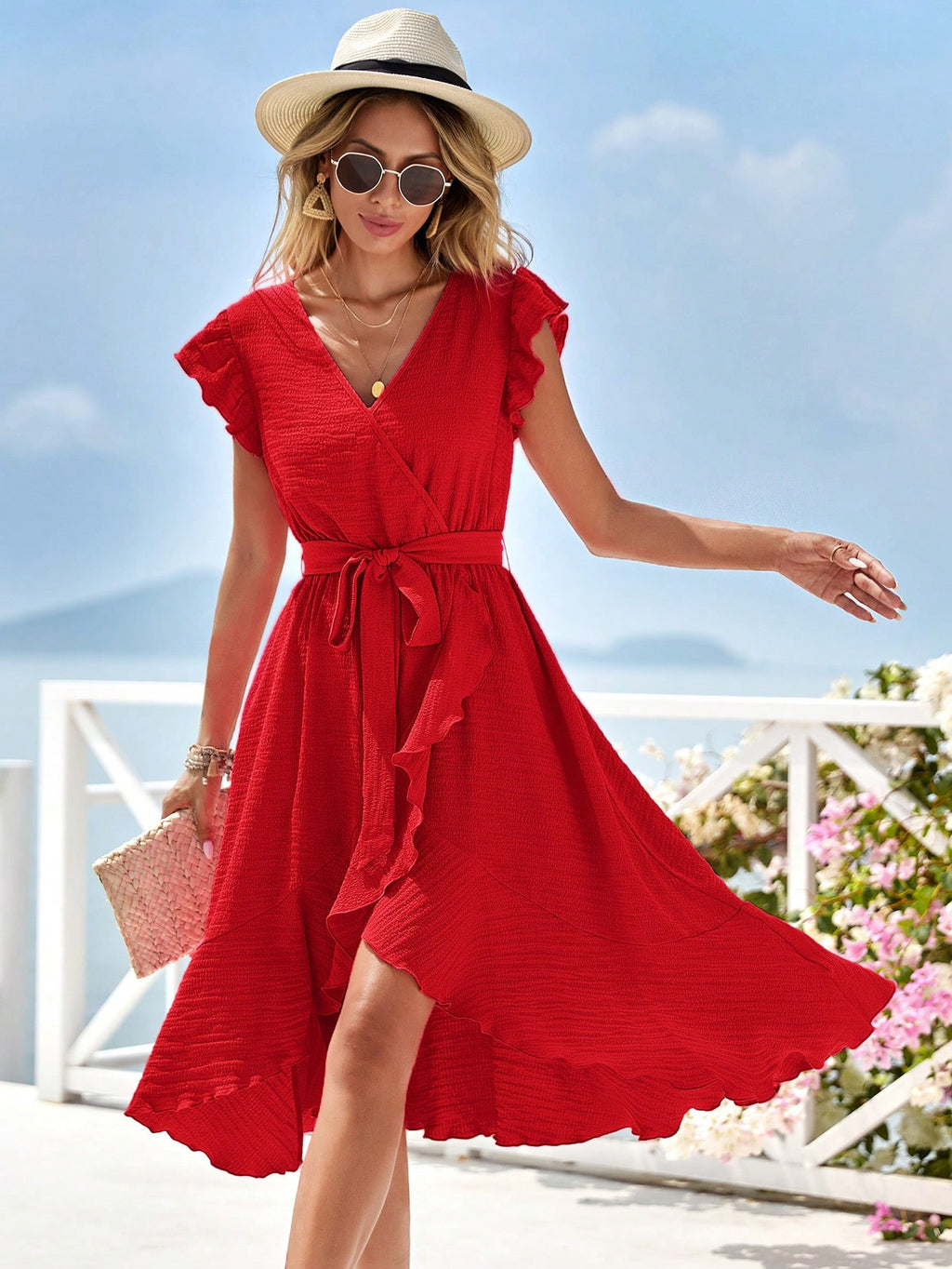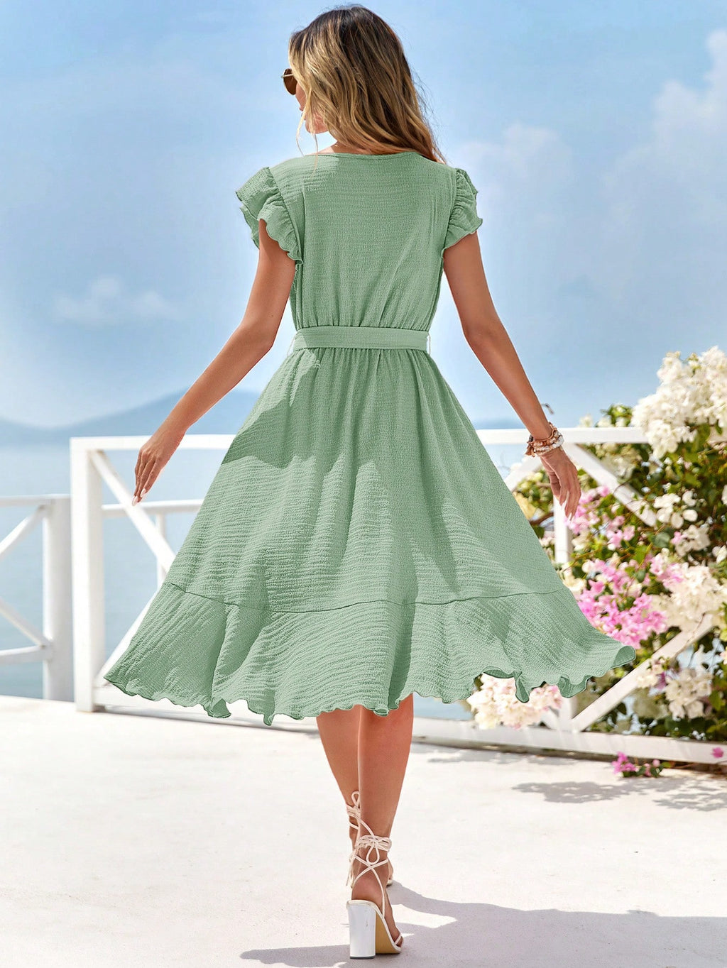 BELLAVOG Surplice Neck Ruffle Armhole Belted Dress,Sage Green Dress