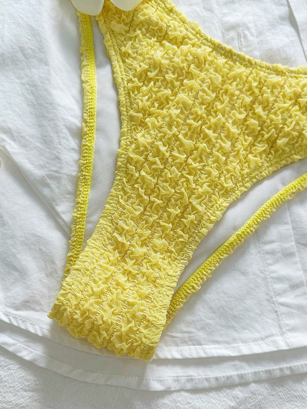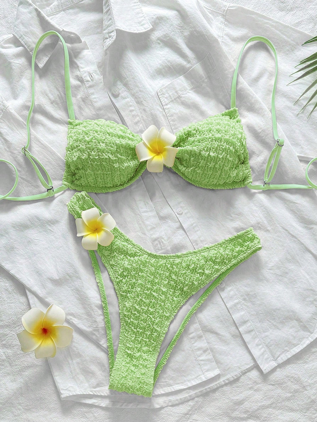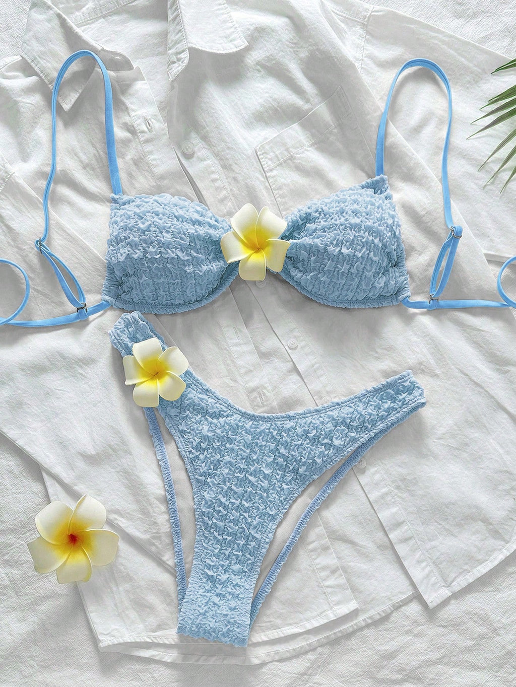 BELLAVOG Sweetro 2 Pieces Set, Textured Fabric Floral Accent Spaghetti Strap Bandeau Top And High Cut Bottoms Sexy Bikini Swimwear, For Beach/Summer