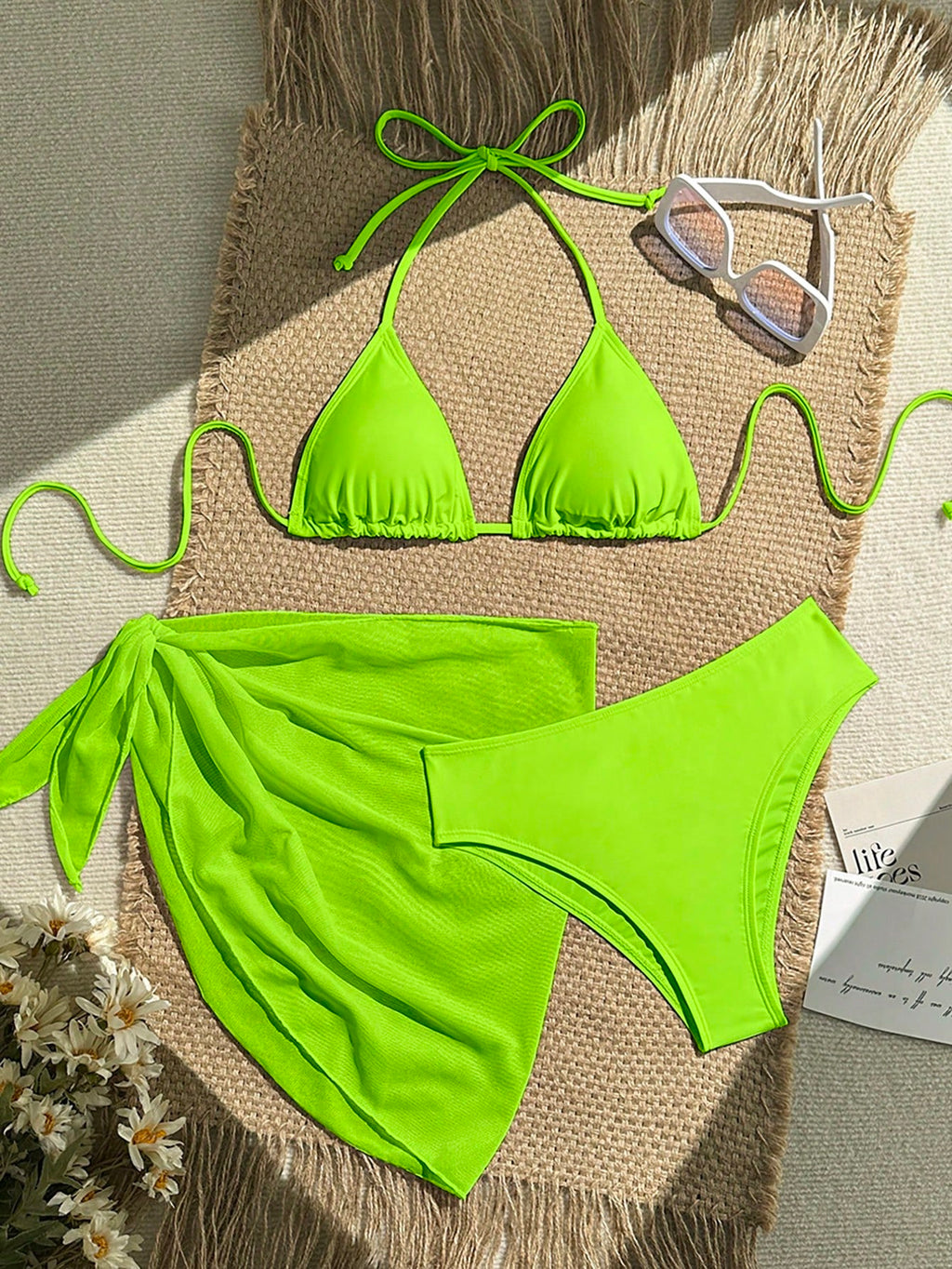 BELLAVOG Swim 3pcs Women Holiday Solid Color Sexy Halter Bikini Swimwear Set, Bathing Suit Set, For Summer Beach Vacation