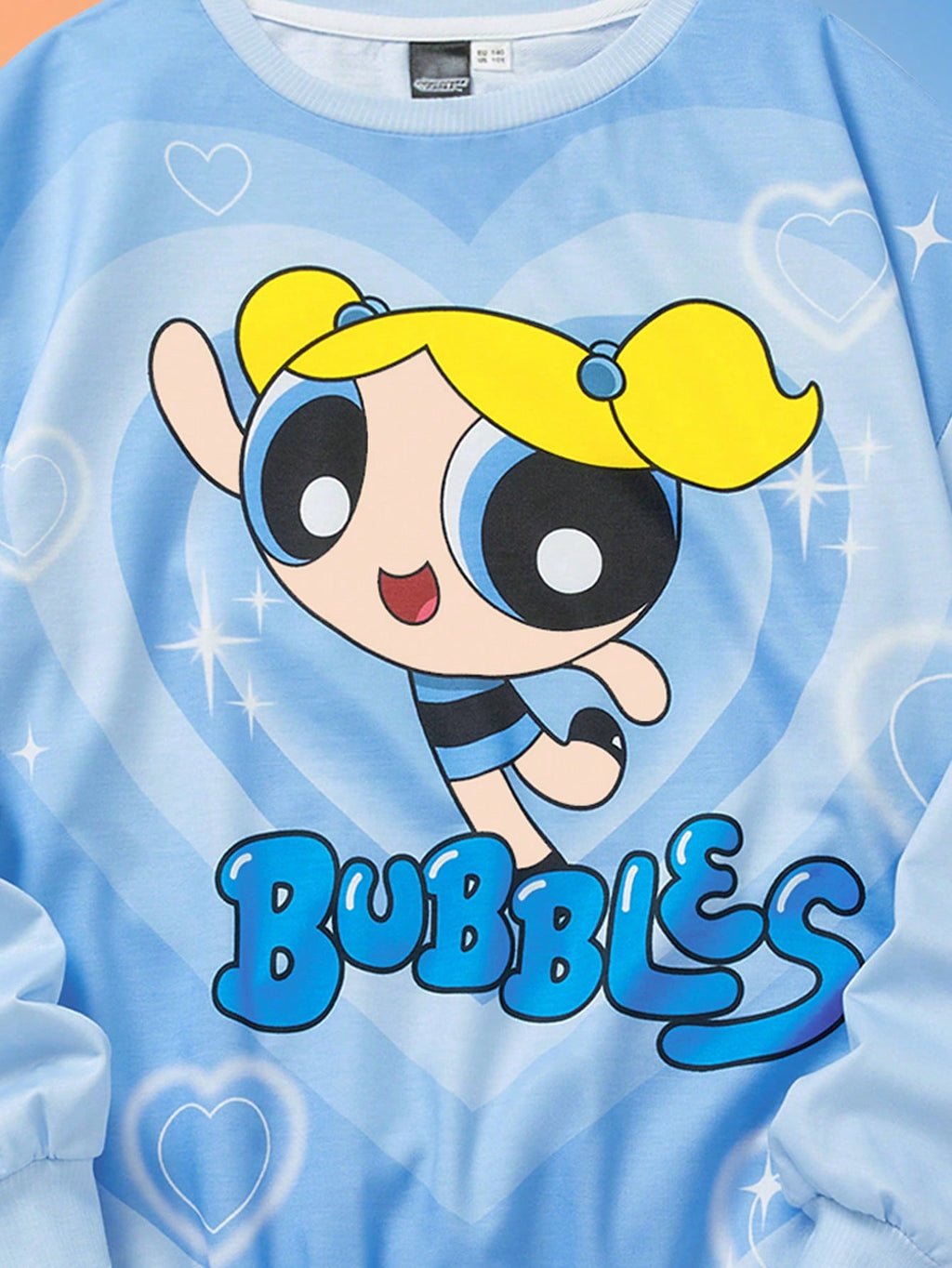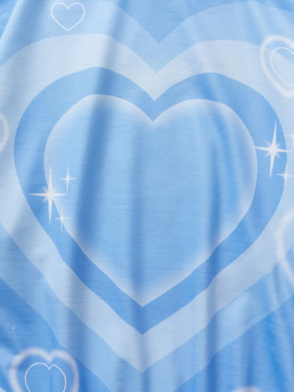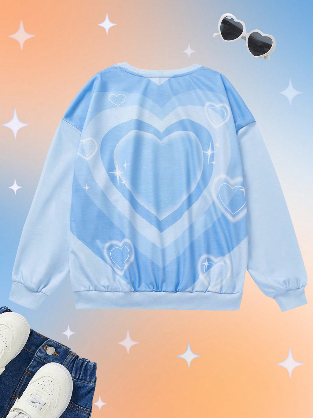 BELLAVOG Tween Girl Cartoon Heart Print Blue Fresh Cute Casual Long Sleeve Sweatshirt