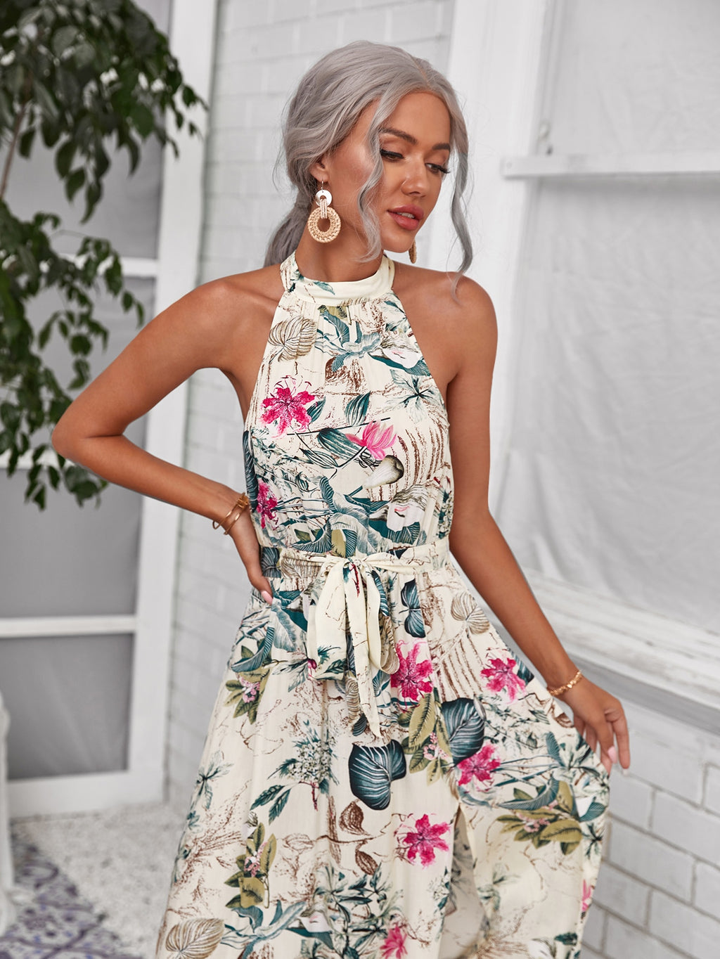 BELLAVOG VCAY Botanical Floral Print High Split Hem Self Belted Halter Beach Summer Flower Dress,Summer Dresses For Women