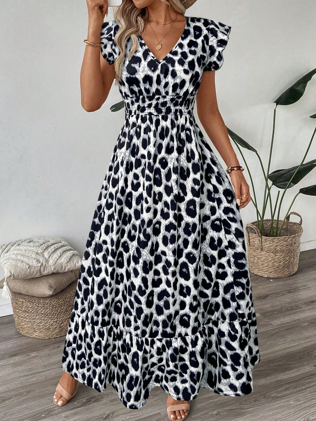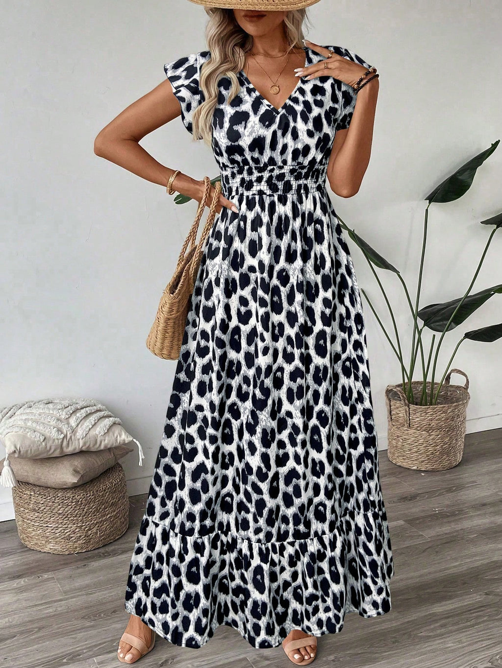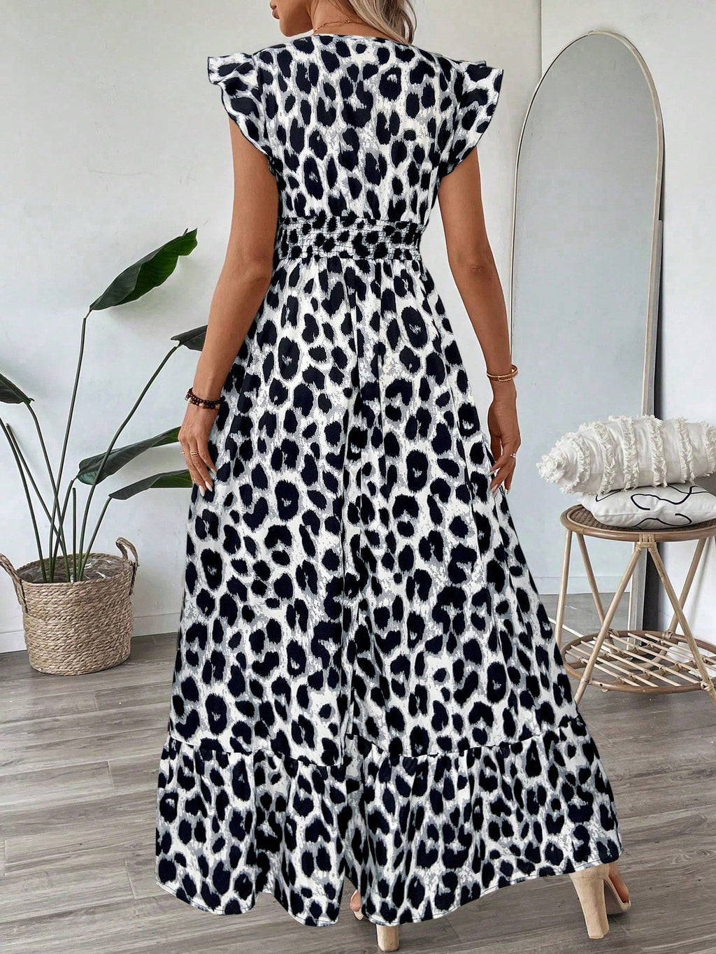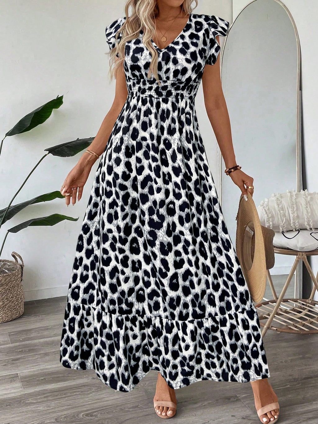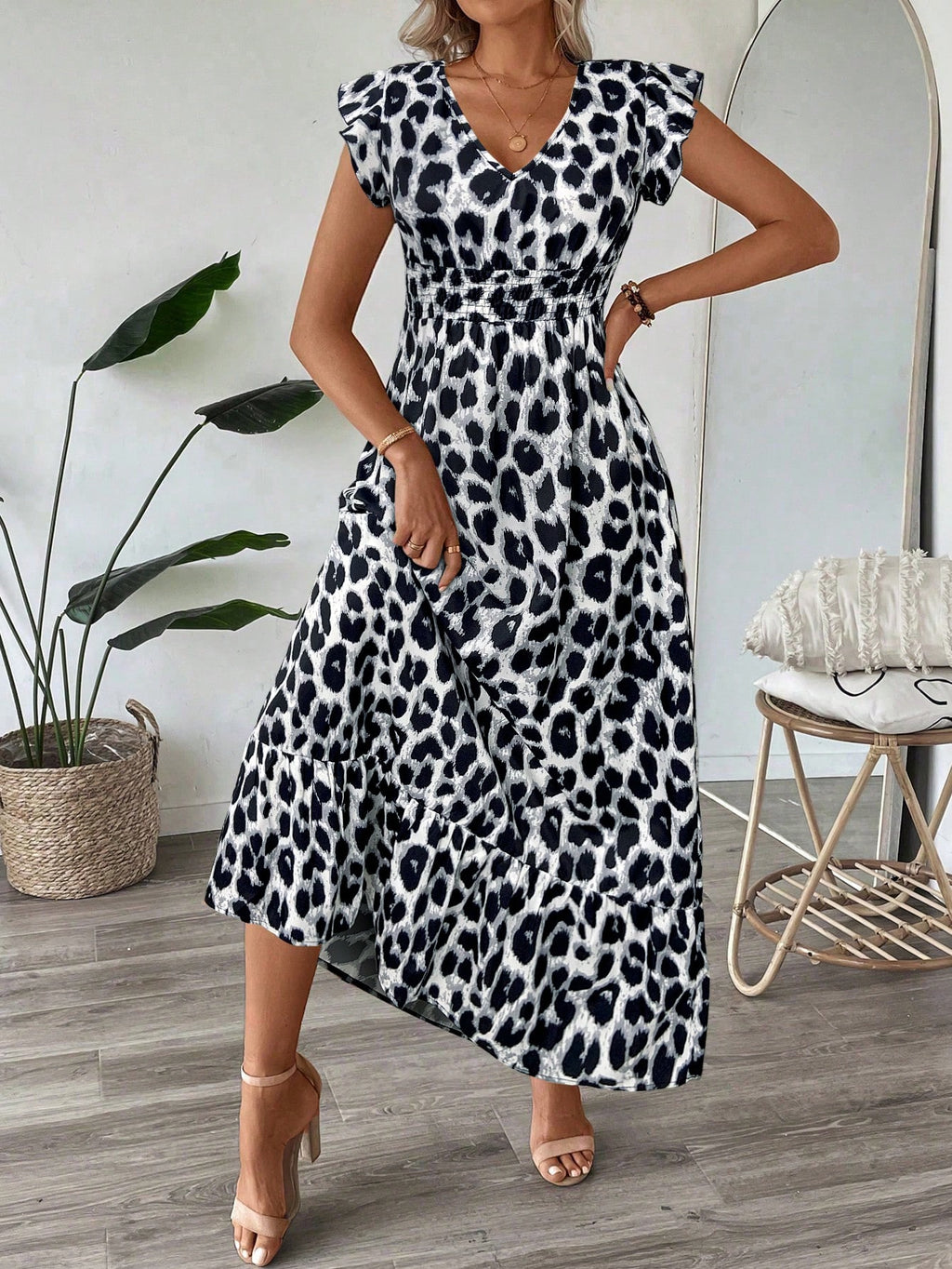 BELLAVOG Vintage Leopard Print Shirred Ruffled Sleeves Cinched Waist Cascade Ruffle Hem Casual Elegant Dress, Suitable For Vacations