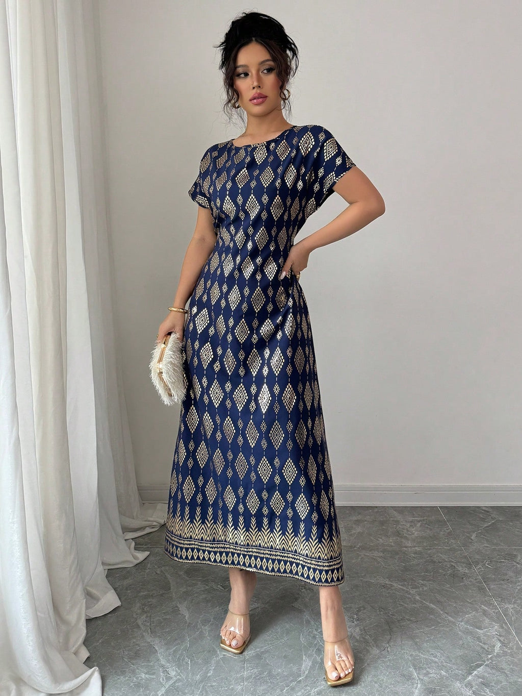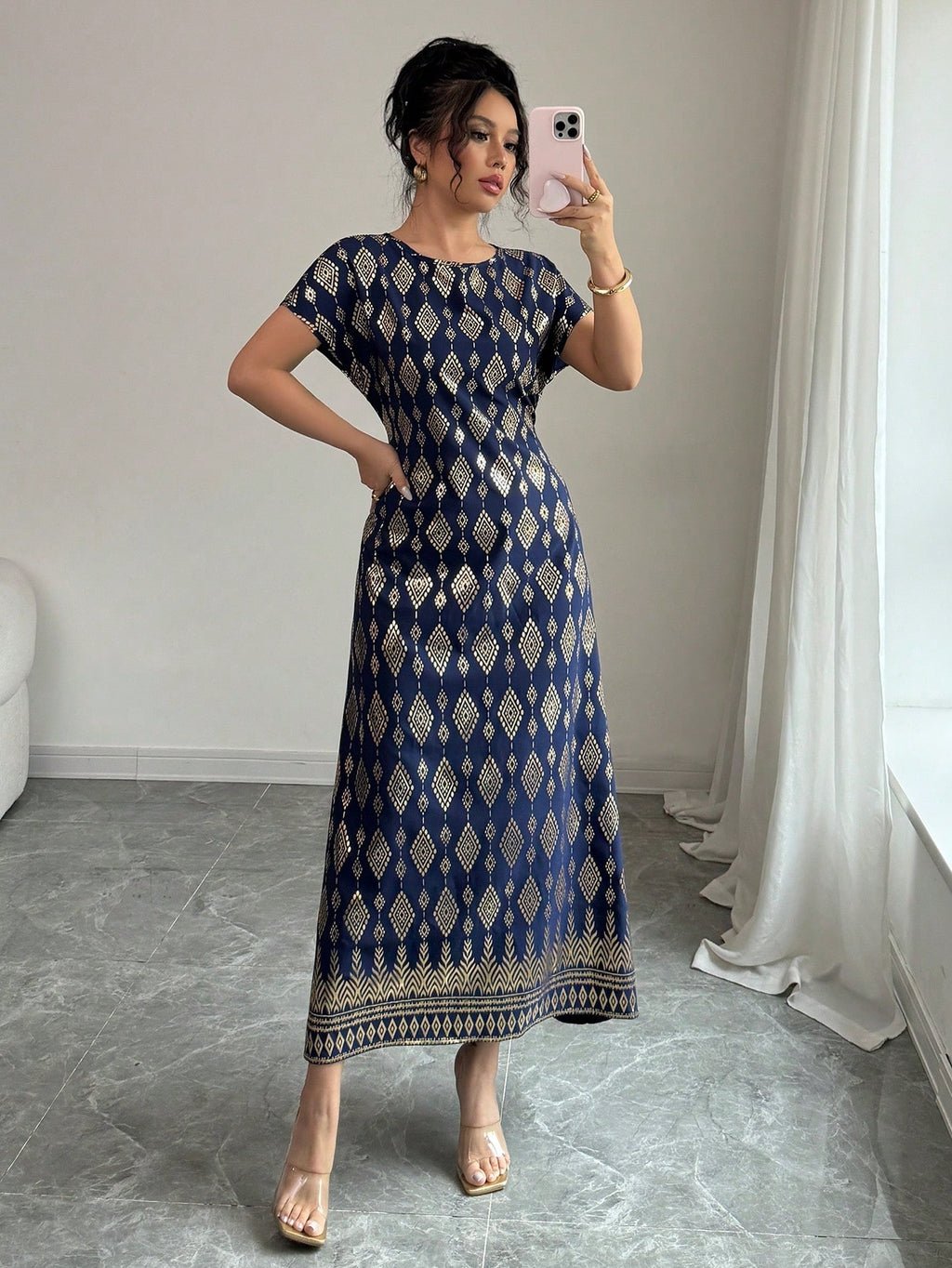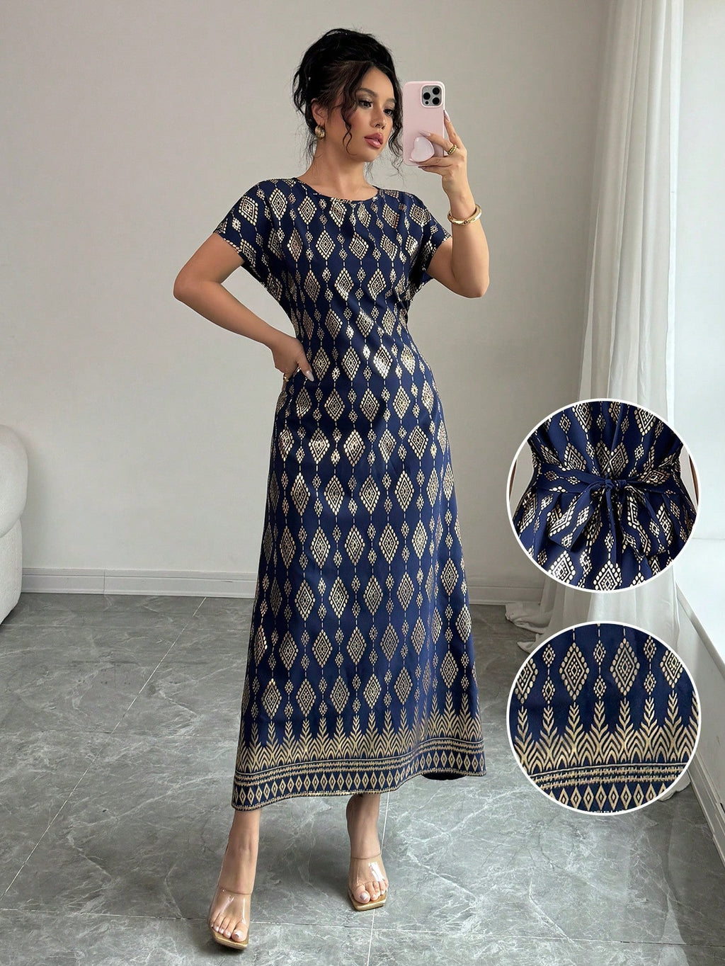 BELLAVOG Women Allover Print Elegant Round Neck Short Sleeve Dress